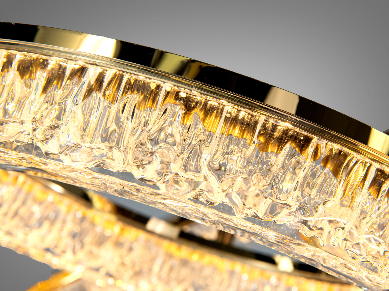 Светильник выполнен из металла с золотым покрытием, что придает ему элегантный вид. Акриловые рассеиватели создают мягкое и равномерное свечение без резких теней. Диаметр основного кольца составляет 50 см, а дополнительного — 30 см, что позволяет люстре выглядеть компактно и стильно.