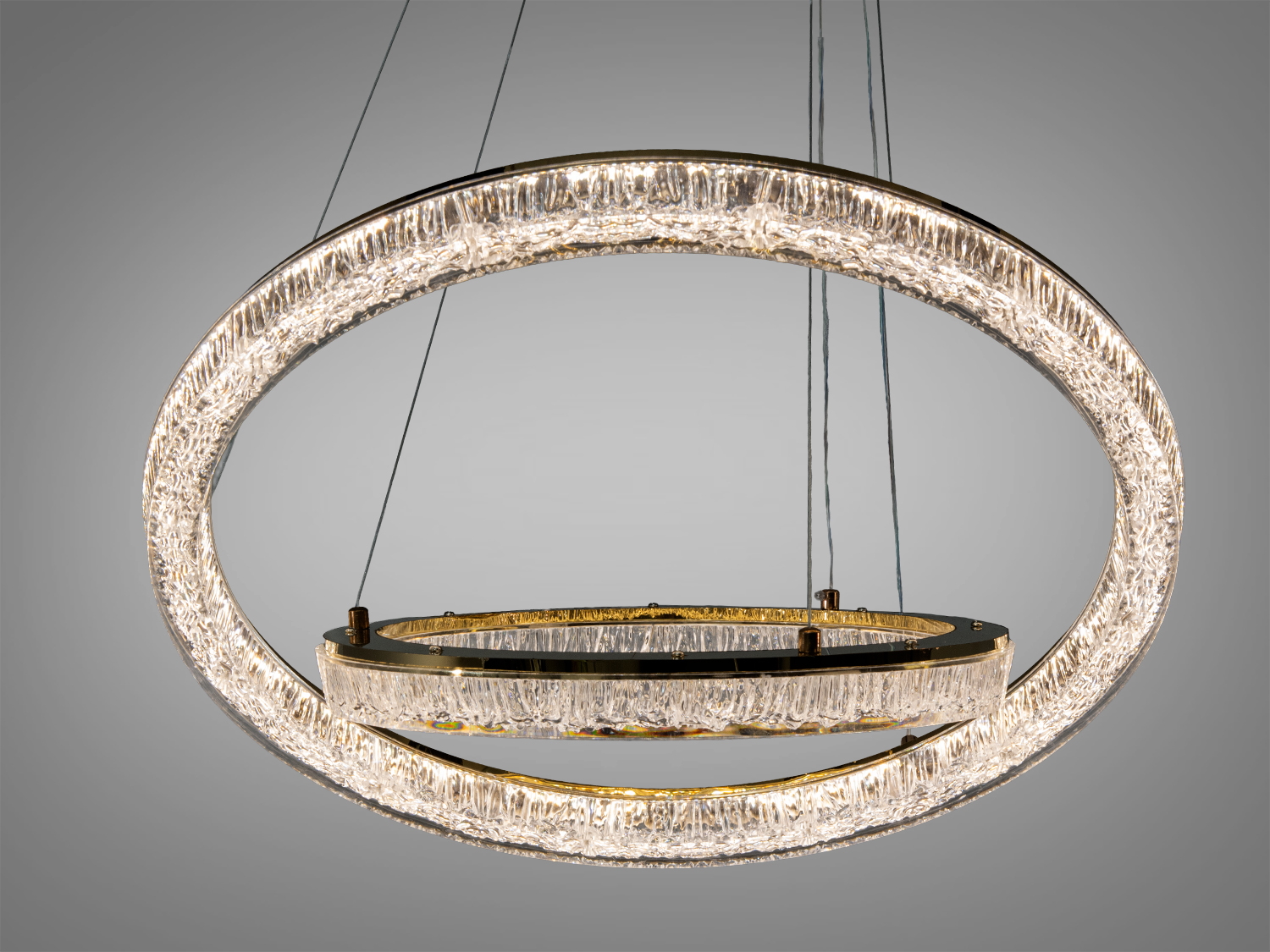 Люстра состоит из двух концентрических колец различного диаметра, которые создают многослойное освещение. Акриловые элементы по периметру усиливают блеск и равномерно рассеивают свет. Каркас изготовлен из прочного металла с устойчивым покрытием золотого цвета.