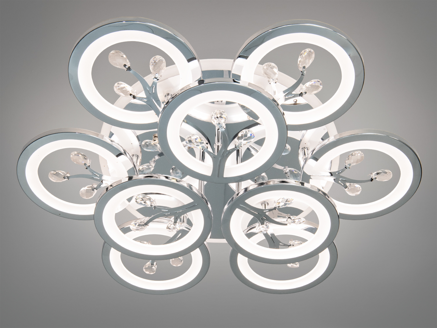 Люстра выполнена в хромированном цвете, который идеально подходит для современного интерьера. Она оснащена девятью световыми модулями, которые обеспечивают равномерное освещение пространства до 24 м². Вы можете легко регулировать яркость и цветовую температуру света, что позволяет создавать различные режимы освещения от теплого до холодного.