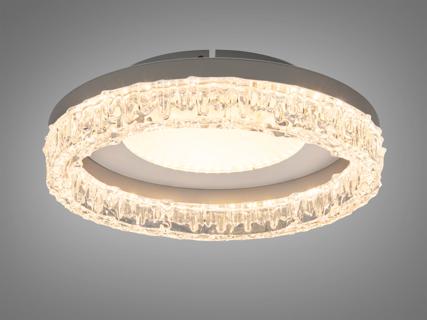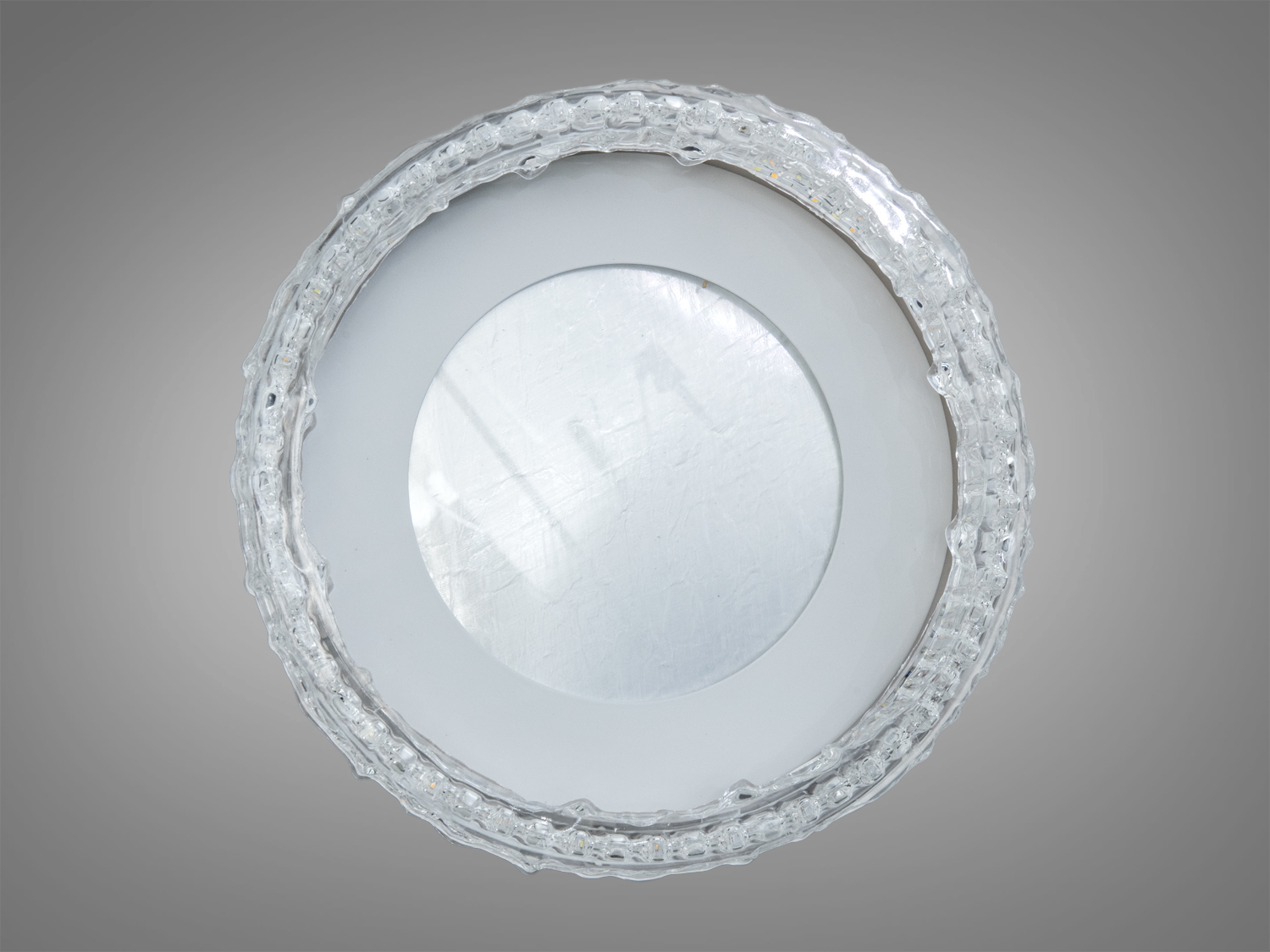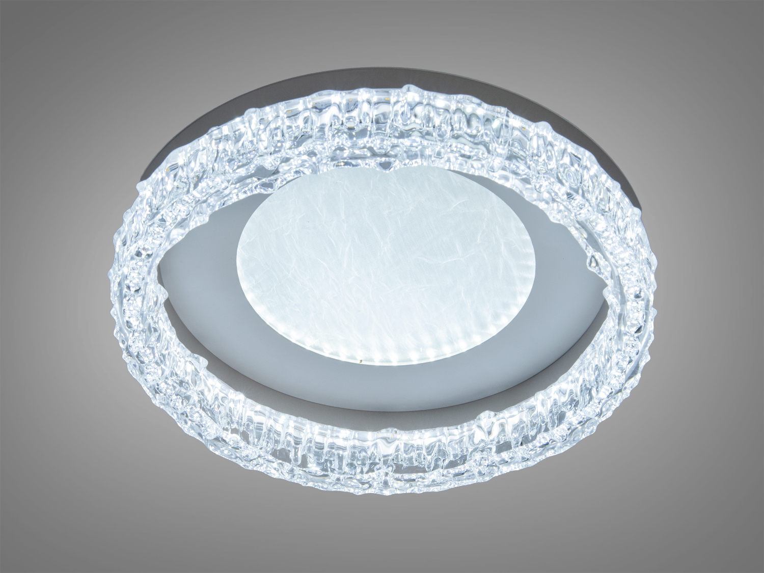 Корпус светильника выполнен из прочного металла, а плафон изготовлен из акрила, что гарантирует долговечность и стильный вид. Прозрачный ободок с эффектом льда добавляет декоративности и создает мягкое освещение по периметру.