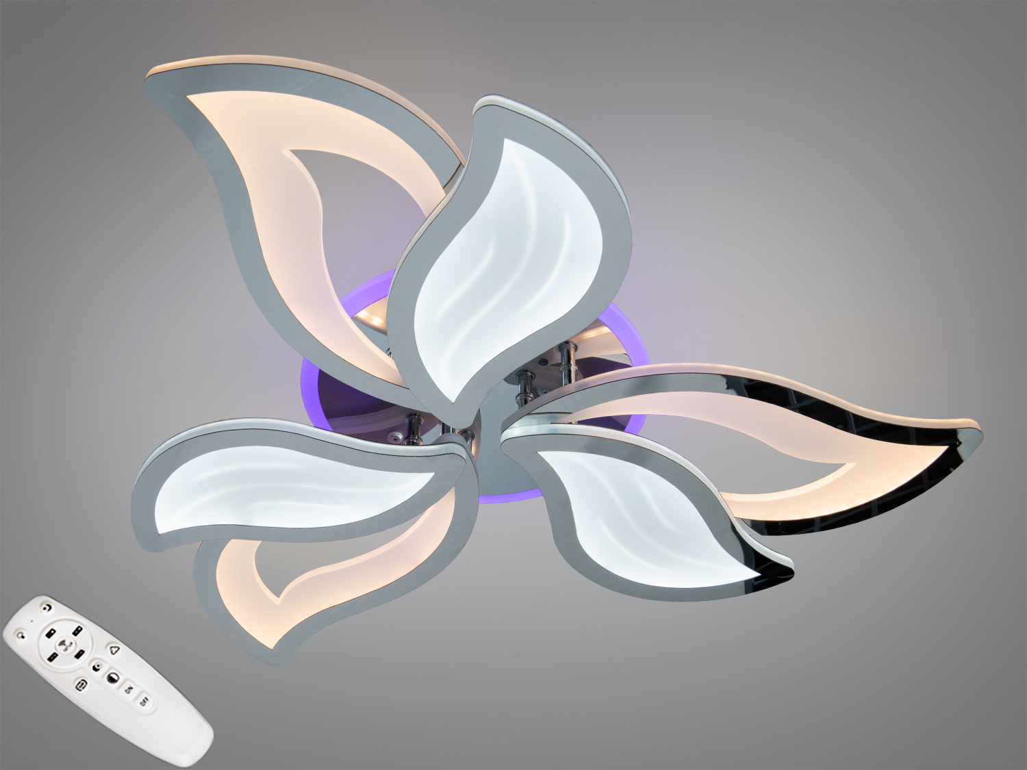Люстра оснащена пультом дистанционного управления, что позволяет легко регулировать яркость и переключать режимы, не вставая с места. Диммер обеспечивает плавное регулирование светового потока — от уютной подсветки до рабочей яркости. Трехцветная подсветка позволяет выбрать тёплый, нейтральный или холодный оттенок белого в зависимости от настроения или задачи.