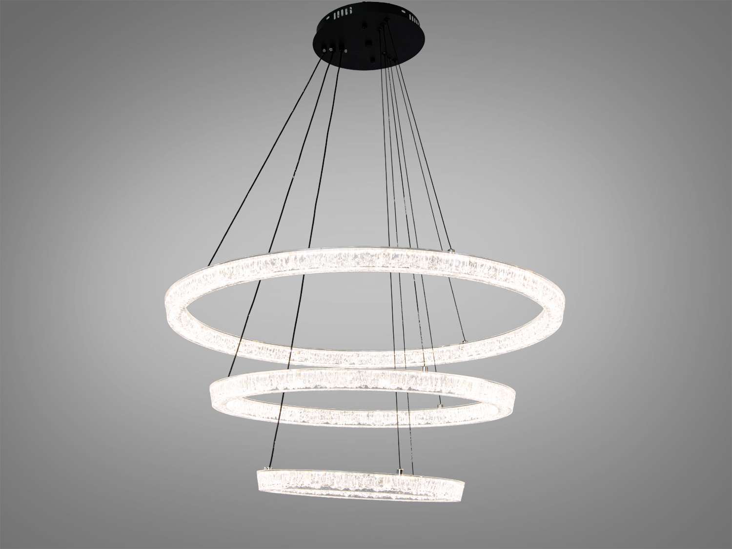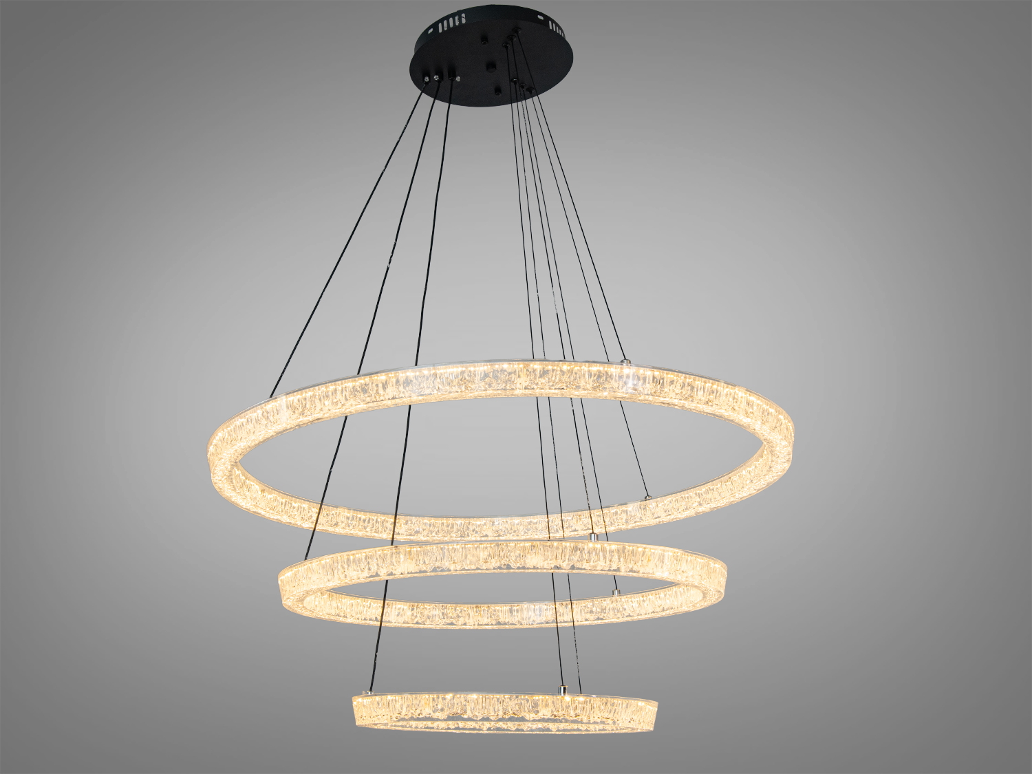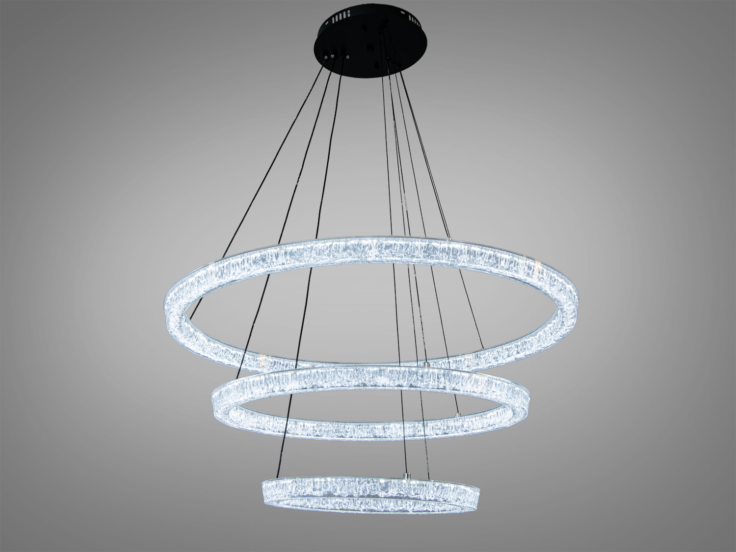 Регулировка высоты от 65 до 115 см позволяет адаптировать люстру под различные потолки и зоны освещения. Акриловые кольца создают эффект хрусталя, добавляя сияние и легкость конструкции. Черное потолочное крепление подчеркивает геометрию светильника, делая его центральной деталью интерьера.