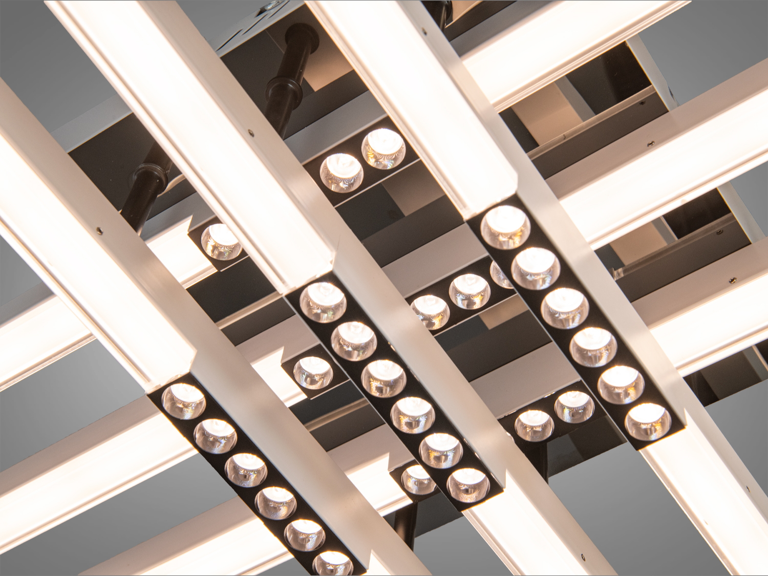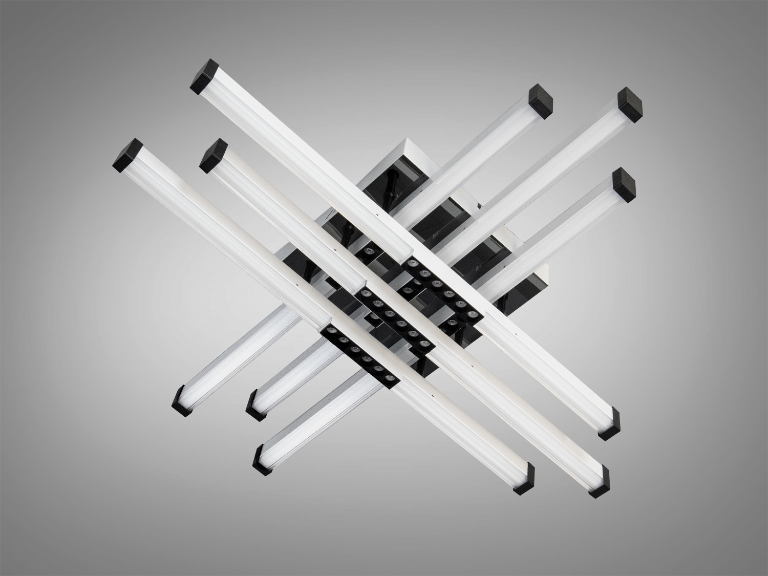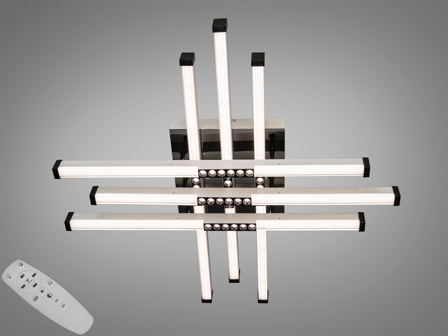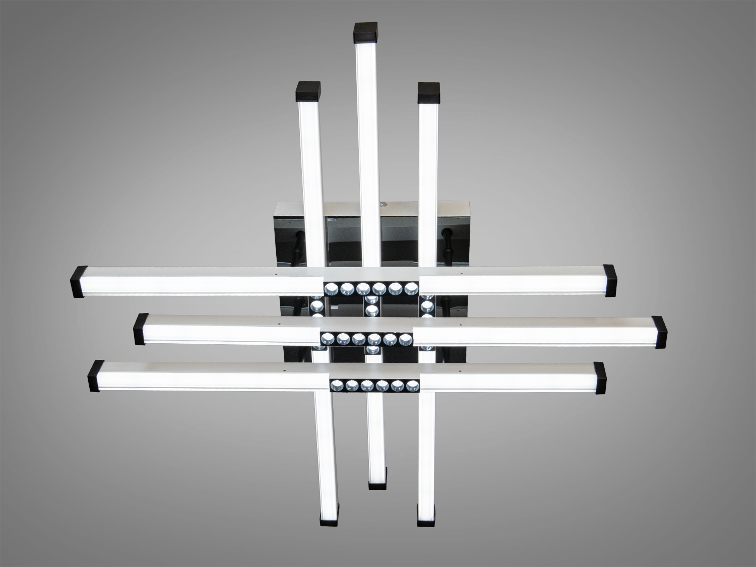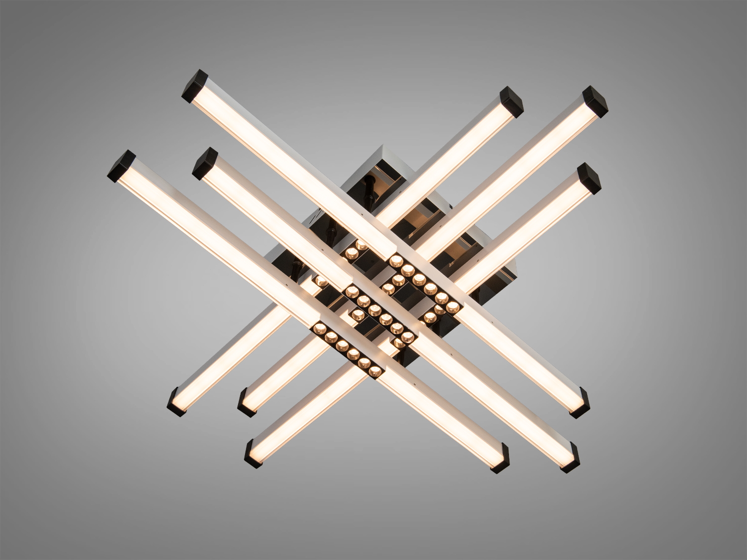 Люстра оснащена шестью линейными LED модулями, которые создают перекрещивающиеся линии, обеспечивая равномерное освещение без резких теней. Это делает её хорошим выбором для помещений до 10 м².
