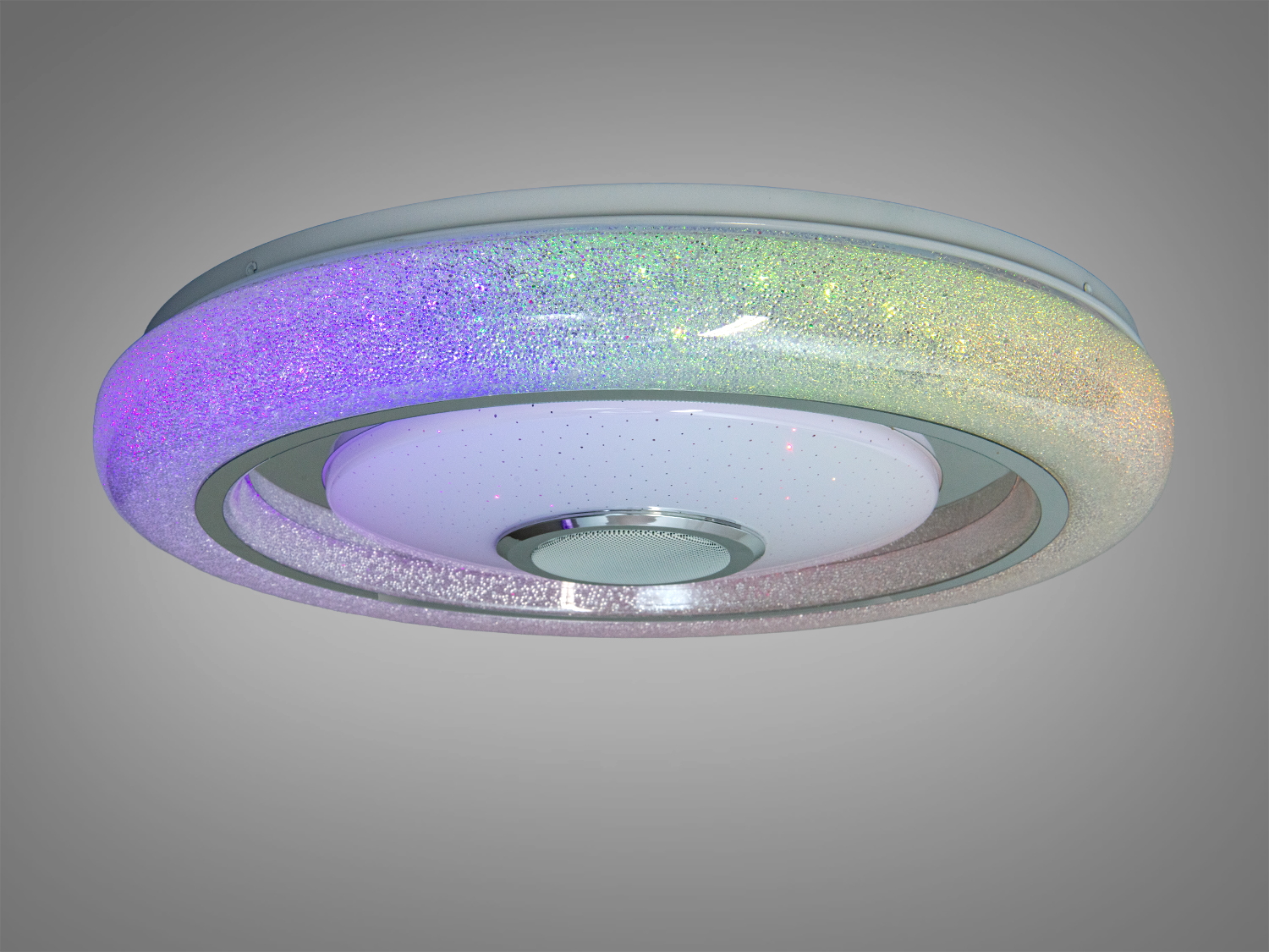 Потолочная люстра Diasha Smart в белом цвете сочетает LED‑освещение и встроенный Bluetooth‑динамик. Модель ориентирована на комнаты площадью около 12–14 м², поддерживает RGB подсветку, диммирование белого света и управление со смартфона через Smart Life (платформа TUYA) или пультом ДУ. Свет и музыка могут работать совместно: доступен режим синхронизации света с ритмом и воспроизведение музыки по Bluetooth и через домашнюю сеть Wi‑Fi.