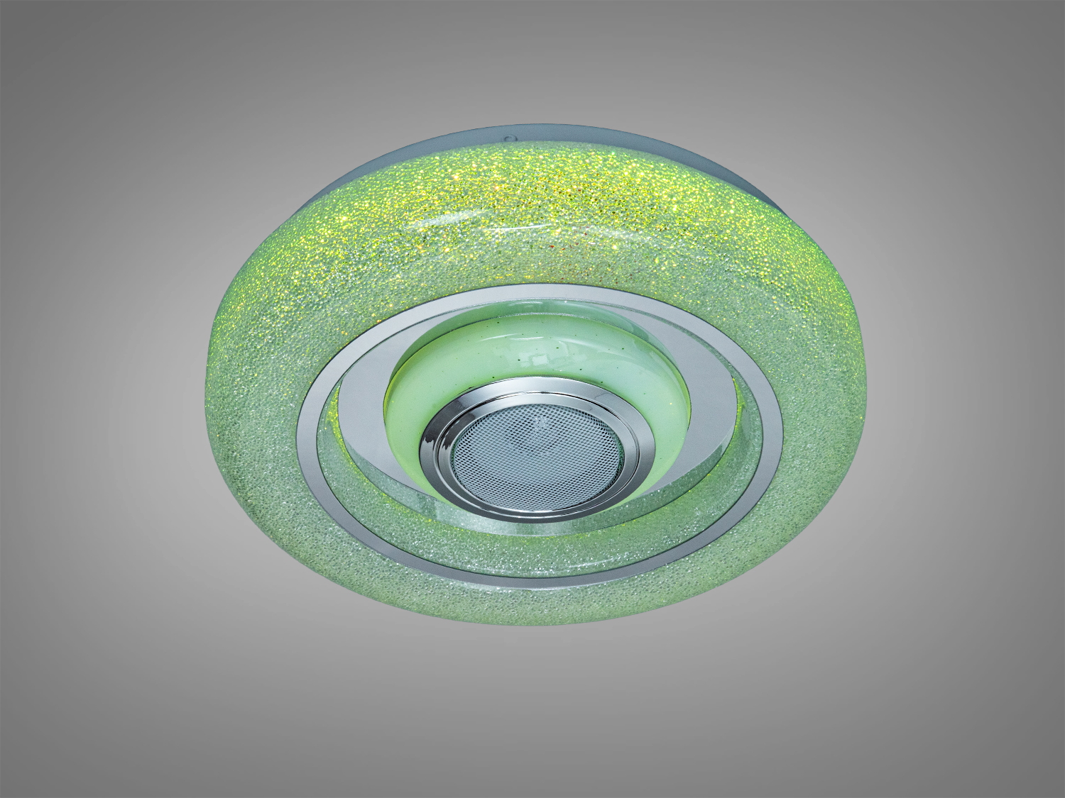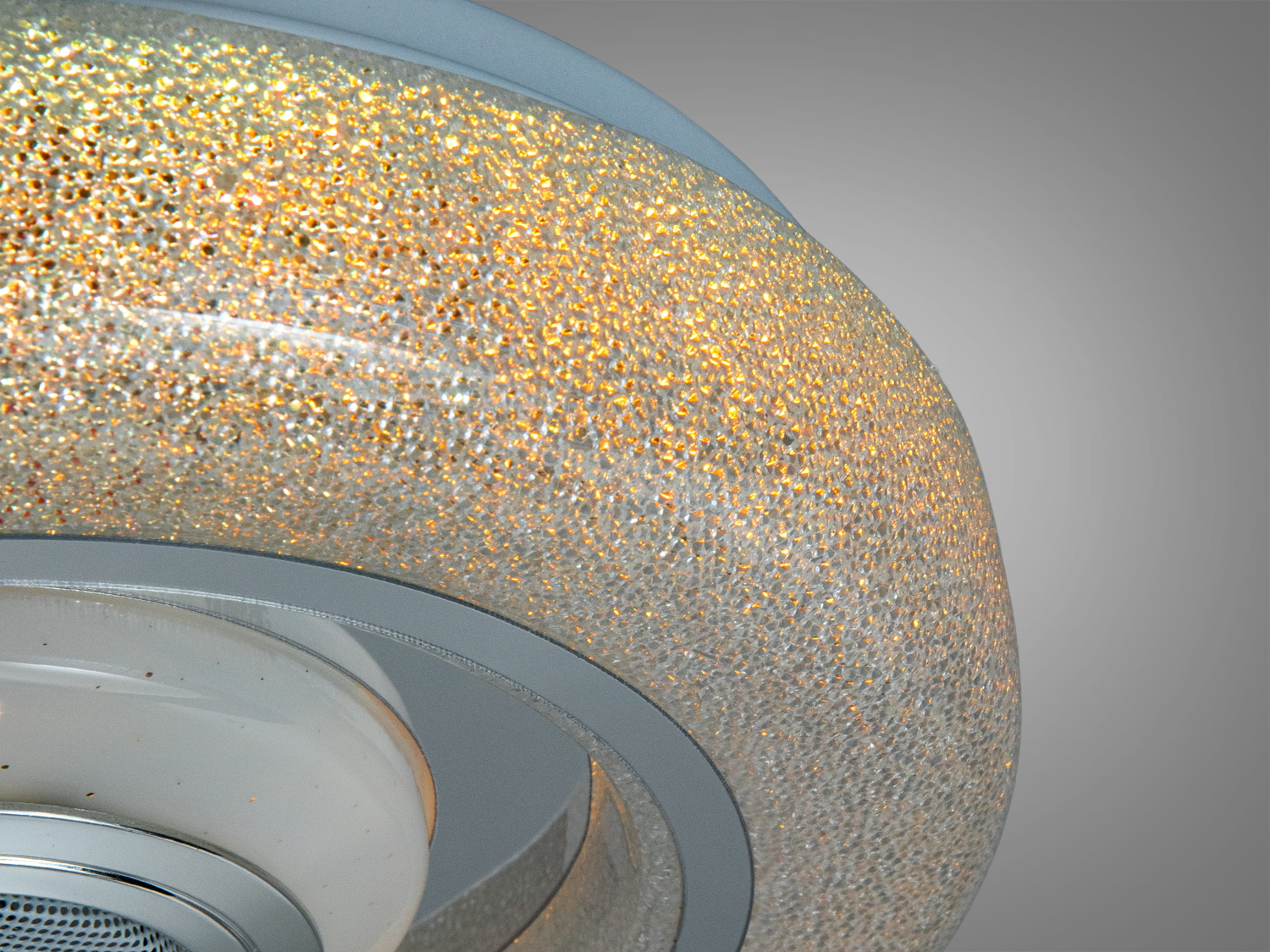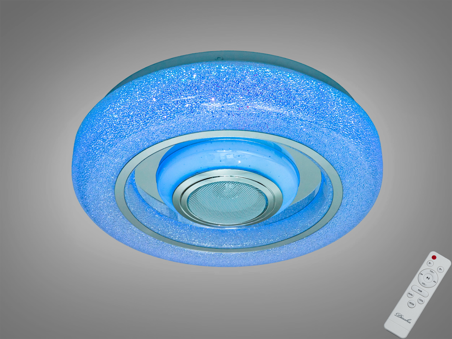 Светодиодная потолочная люстра белого цвета объединяет свет и звук в одном устройстве. Мощность 45 Вт предполагает освещение комнат площадью до 8 м², а встроенная Bluetooth колонка позволяет воспроизводить музыку со смартфона. Управление доступно через приложение i-Link с регулировкой яркости, цветовой температуры, RGB подсветки и таймеров.