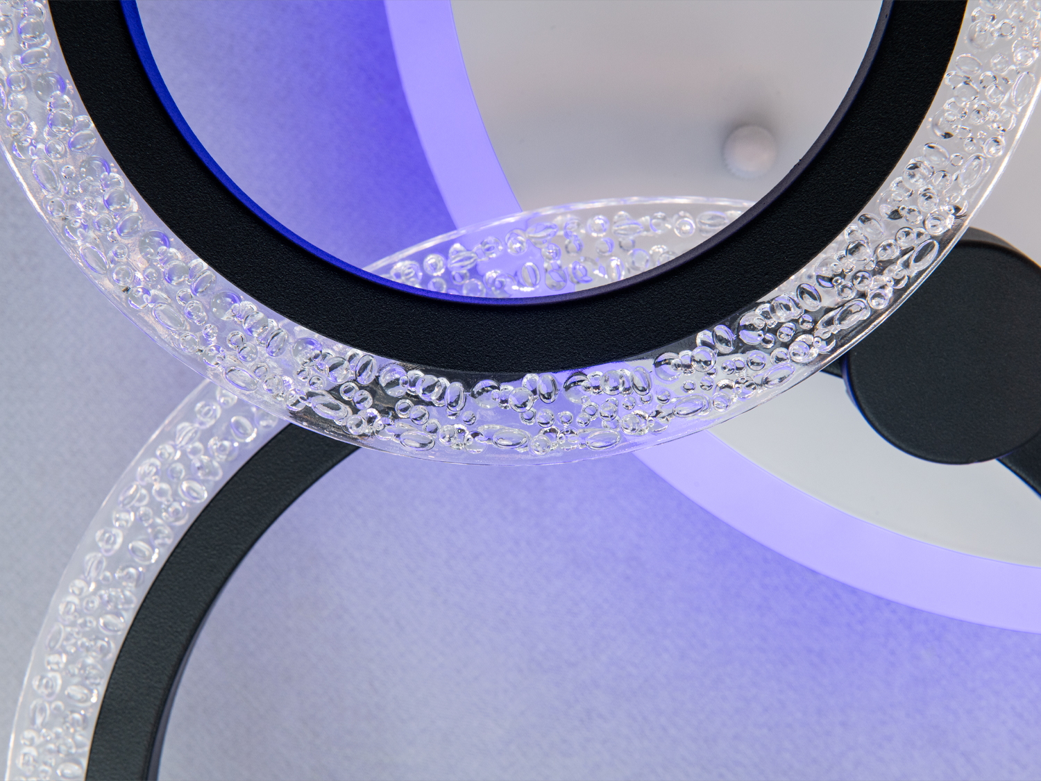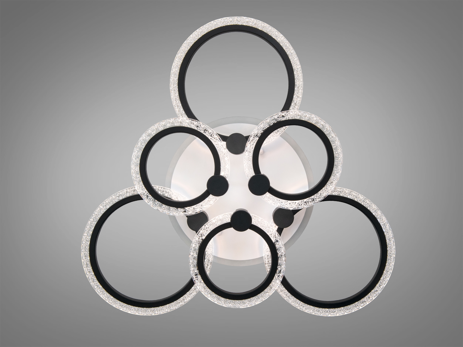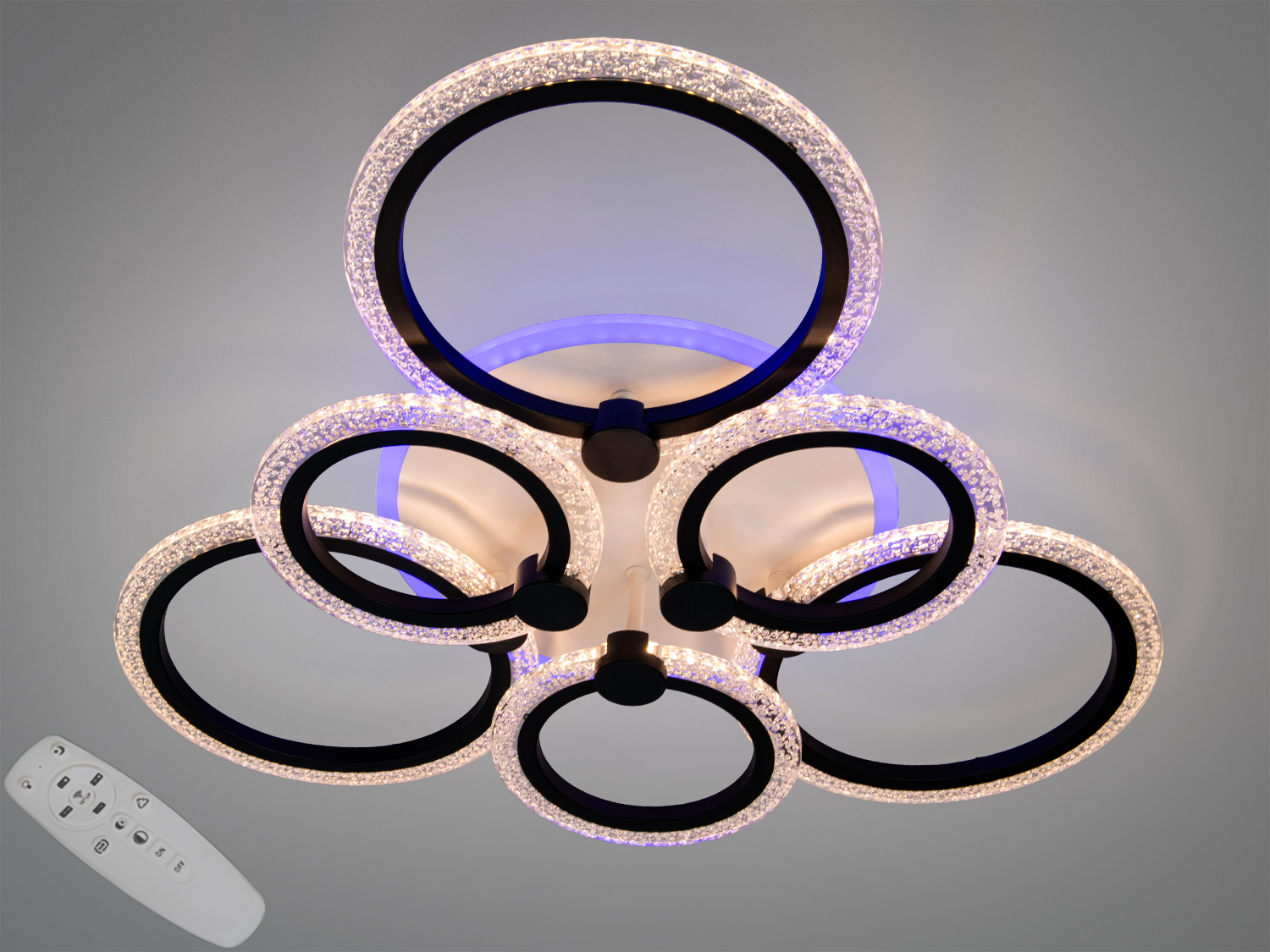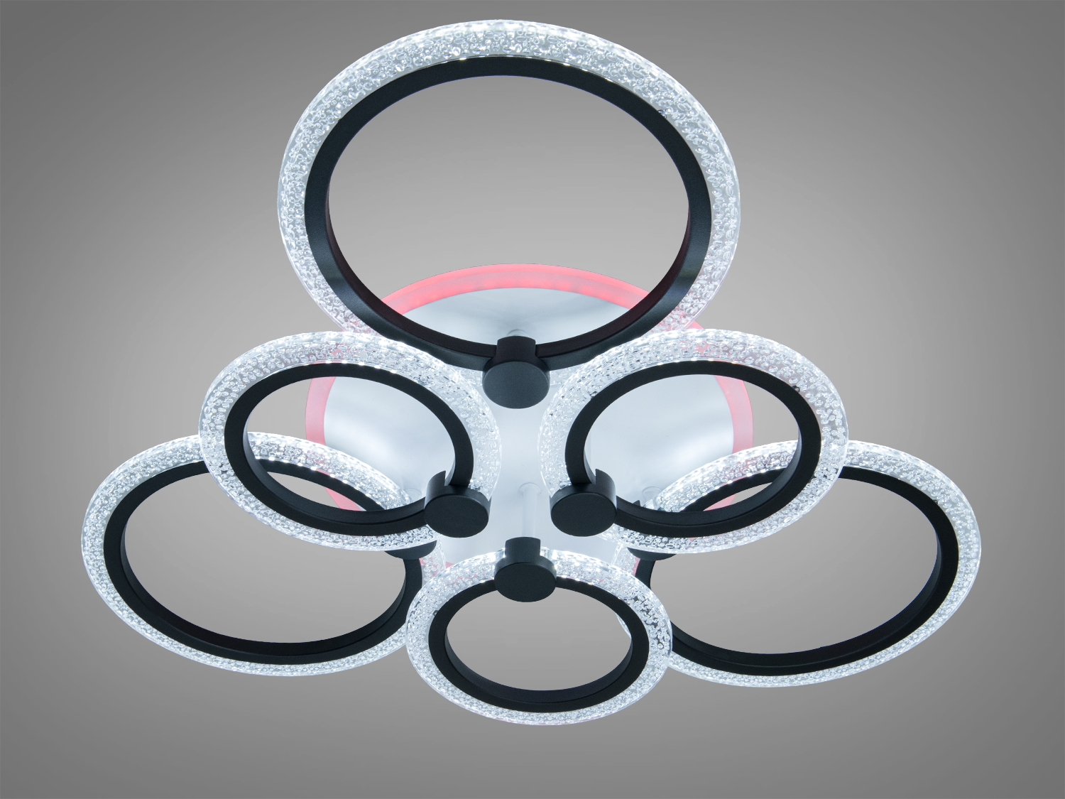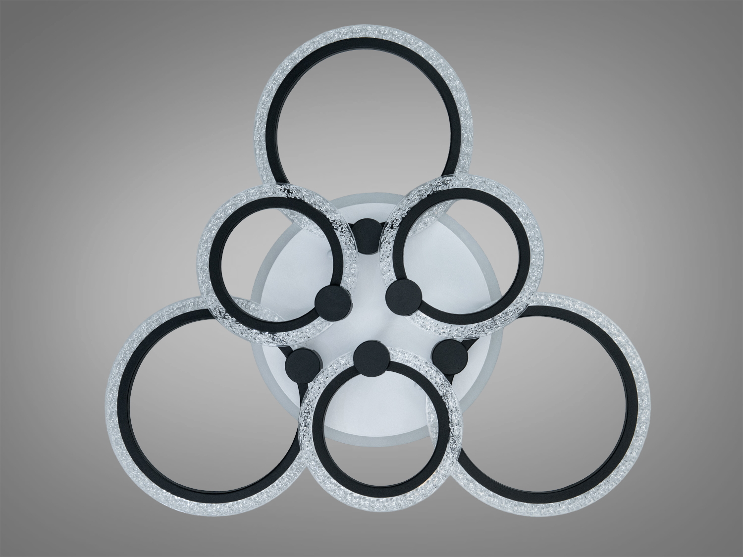 Эта светодиодная потолочная люстра с шестью кольцами выполнена в современном стиле и оснащена дистанционным управлением. Черный металл корпуса контрастирует с прозрачными акриловыми рассеивателями, создавая выразительный минималистичный дизайн, который идеально подойдет для современных интерьеров.