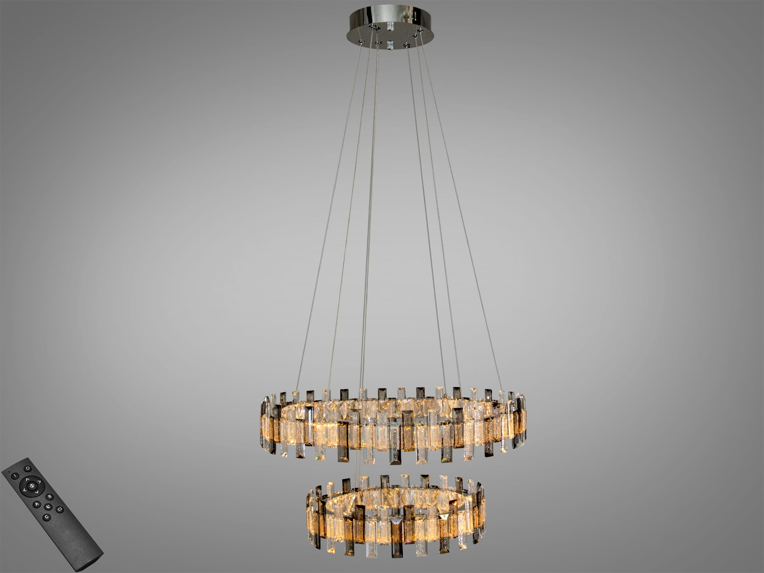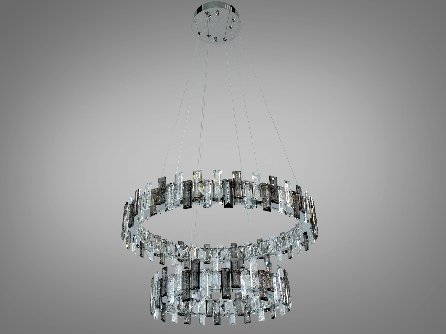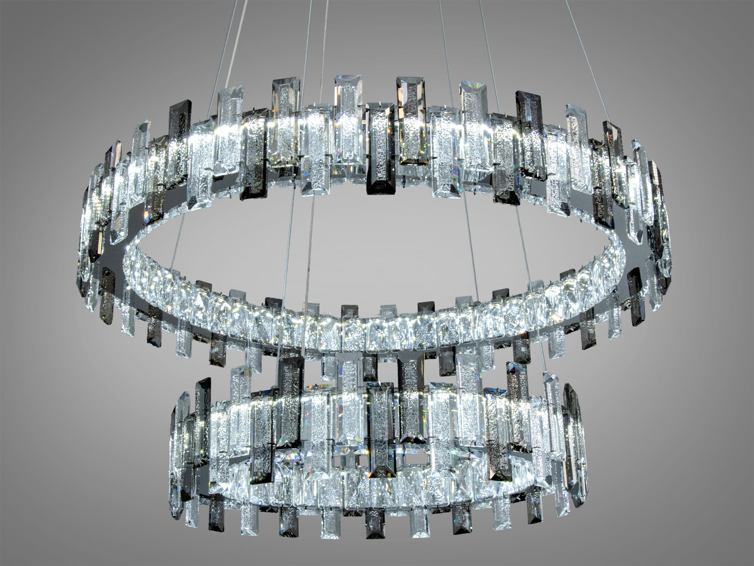 Модульная конструкция из двух колец подчеркнута гладким хромированным покрытием, которое придаёт изделию зеркальный блеск. Хрустальные элементы добавляют изысканности и блеска, создавая уникальный световой рисунок. Подвесы на тонких тросах визуально облегчают конструкцию, обеспечивая равномерное распределение света.