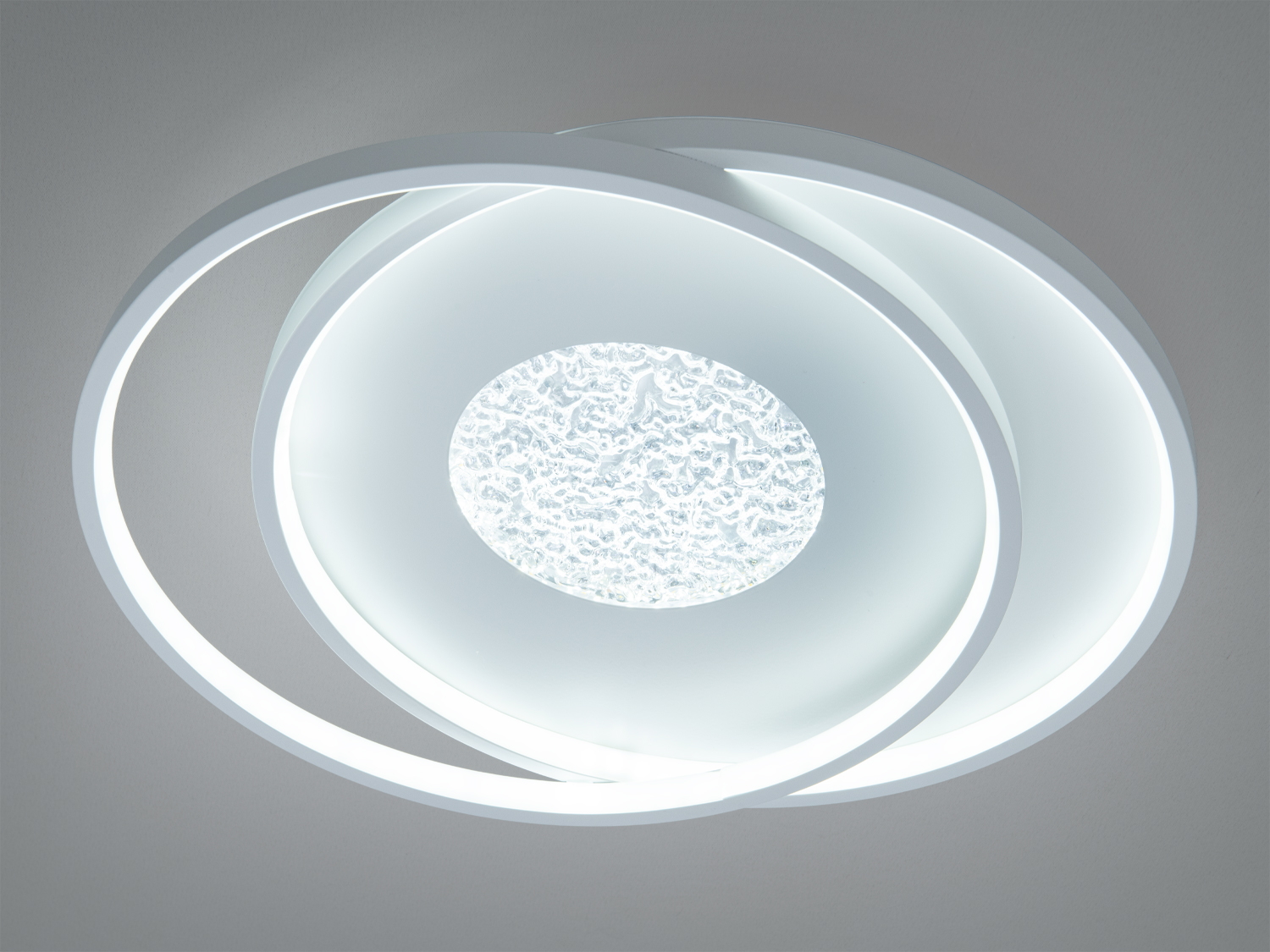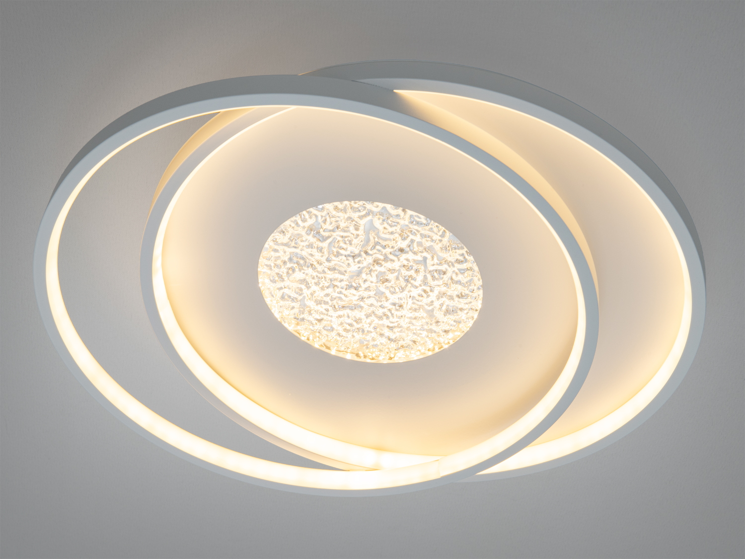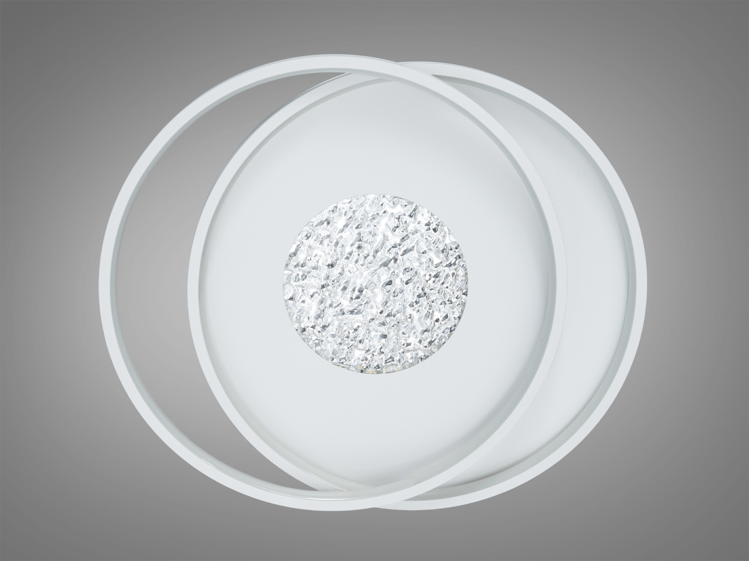 Дизайн светильника выделяется своей геометрической композицией: два кольца пересекаются вокруг центрального рельефного элемента, создавая уникальный визуальный акцент. Белый корпус и акриловый рассеиватель делают светильник универсальным решением для любого интерьера, гармонично вписываясь в светлые и контрастные оттенки стен.