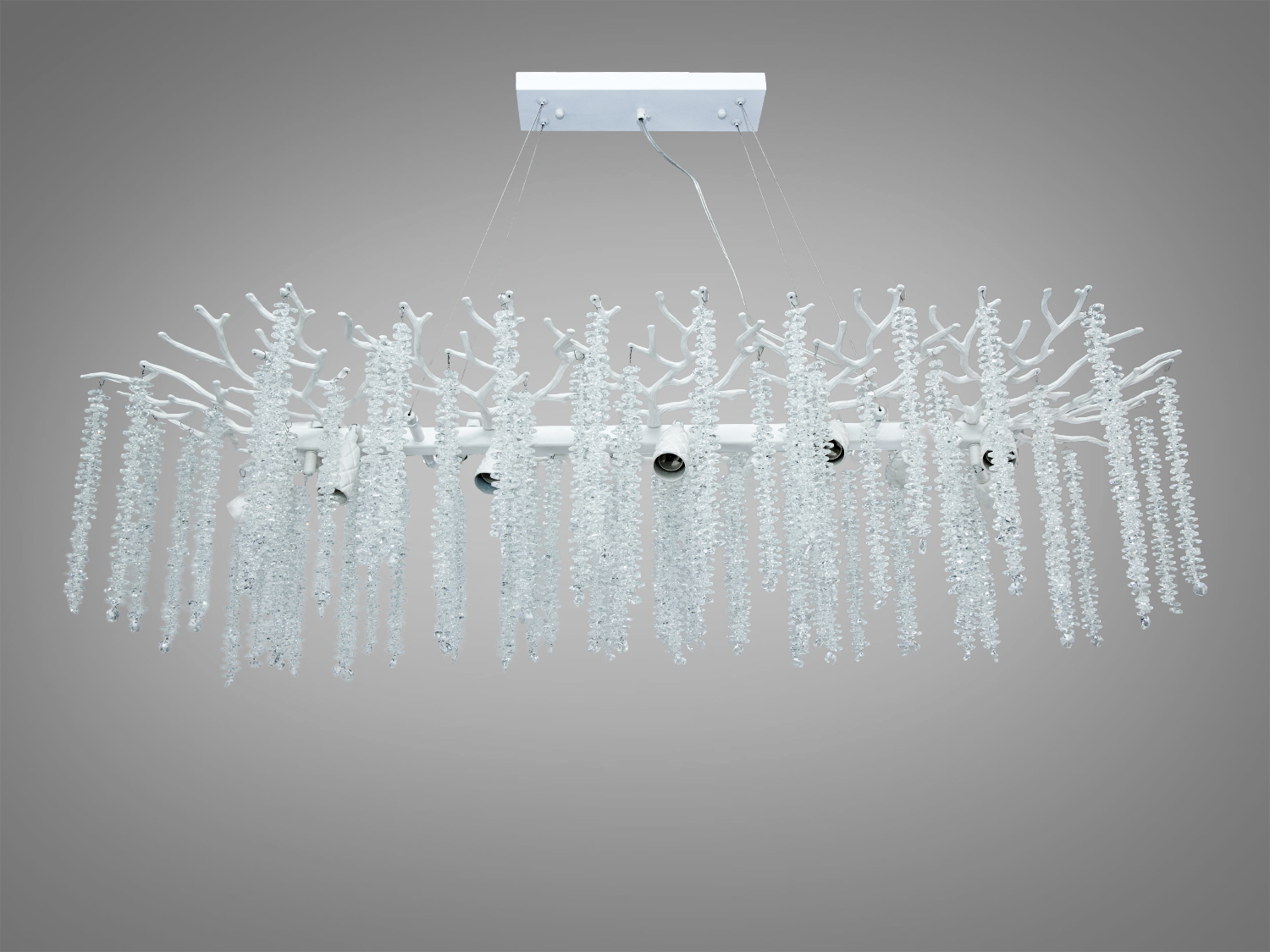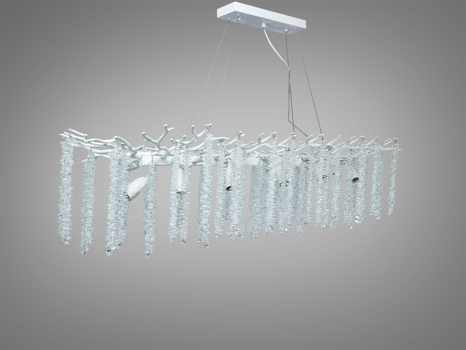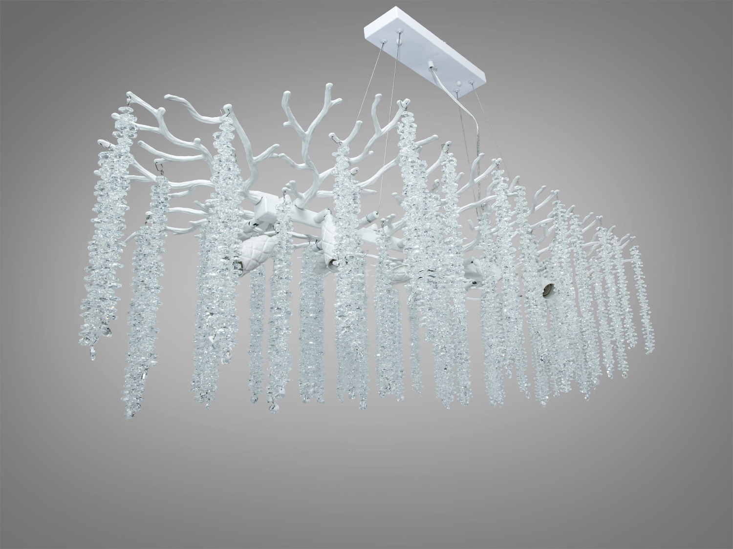 Люстра выполнена из прочного металла и украшена хрустальными подвесками, которые добавляют глубины и блеска свету. Белый алюминиевый каркас подчеркивает легкость формы и гармонично вписывается в современный интерьер. Прозрачные подвески позволяют свету отражаться и преломляться, создавая мягкие отблески на поверхностях.