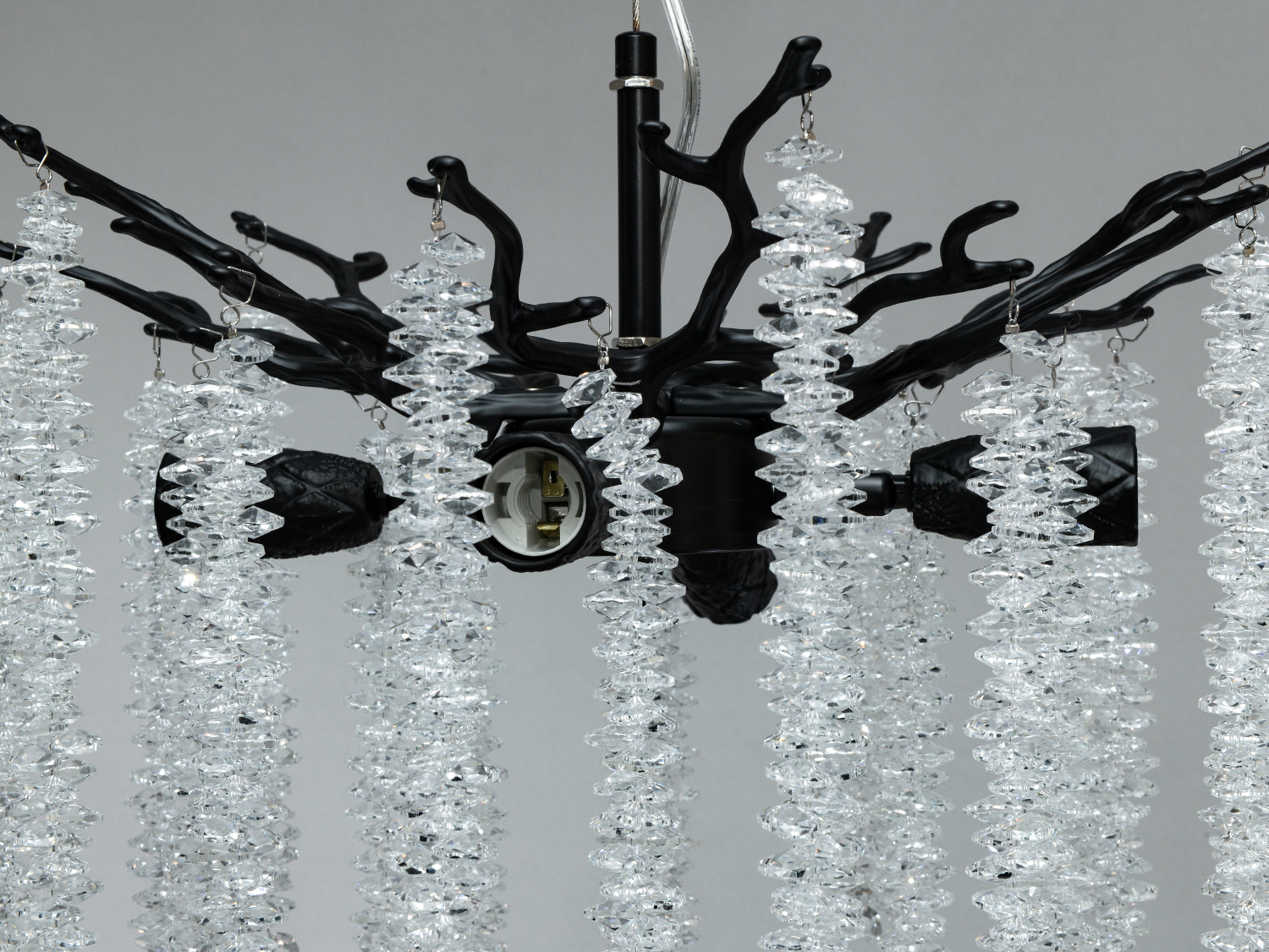 Эта люстра отличается оригинальным дизайном, напоминающим ветви глицинии. Черный цвет каркаса подчеркивает изысканность и современность формы, а хрустальные подвески добавляют изящности и блеска.
