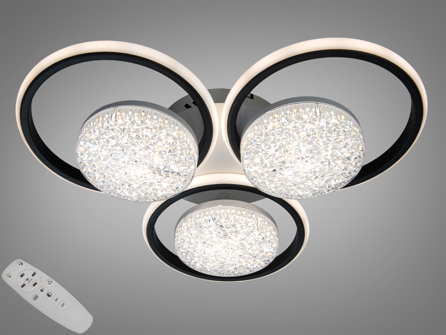 Потолочная LED люстра с уникальным дизайном в виде колец, выполненная в стильной цветовой комбинации белого и черного, станет идеальным выбором для современного интерьера. Оснащенная мощностью в 82Вт, она обеспечивает качественное освещение для комнат площадью до 14 м².
