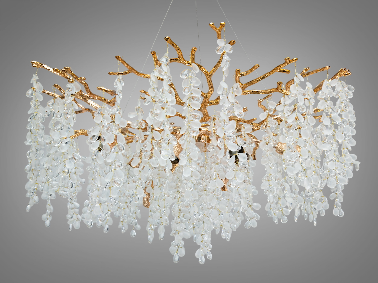 Люстра украшена ветвями в золотом цвете, которые поддерживают хрустальные капли, усиливающие эффект виноградных гроздей. Каркас выполнен из алюминия с золотистым покрытием, что обеспечивает конструкцию легкостью и устойчивостью к коррозии. Хрустальные подвески создают уникальные световые эффекты, добавляя мерцание и глубину.