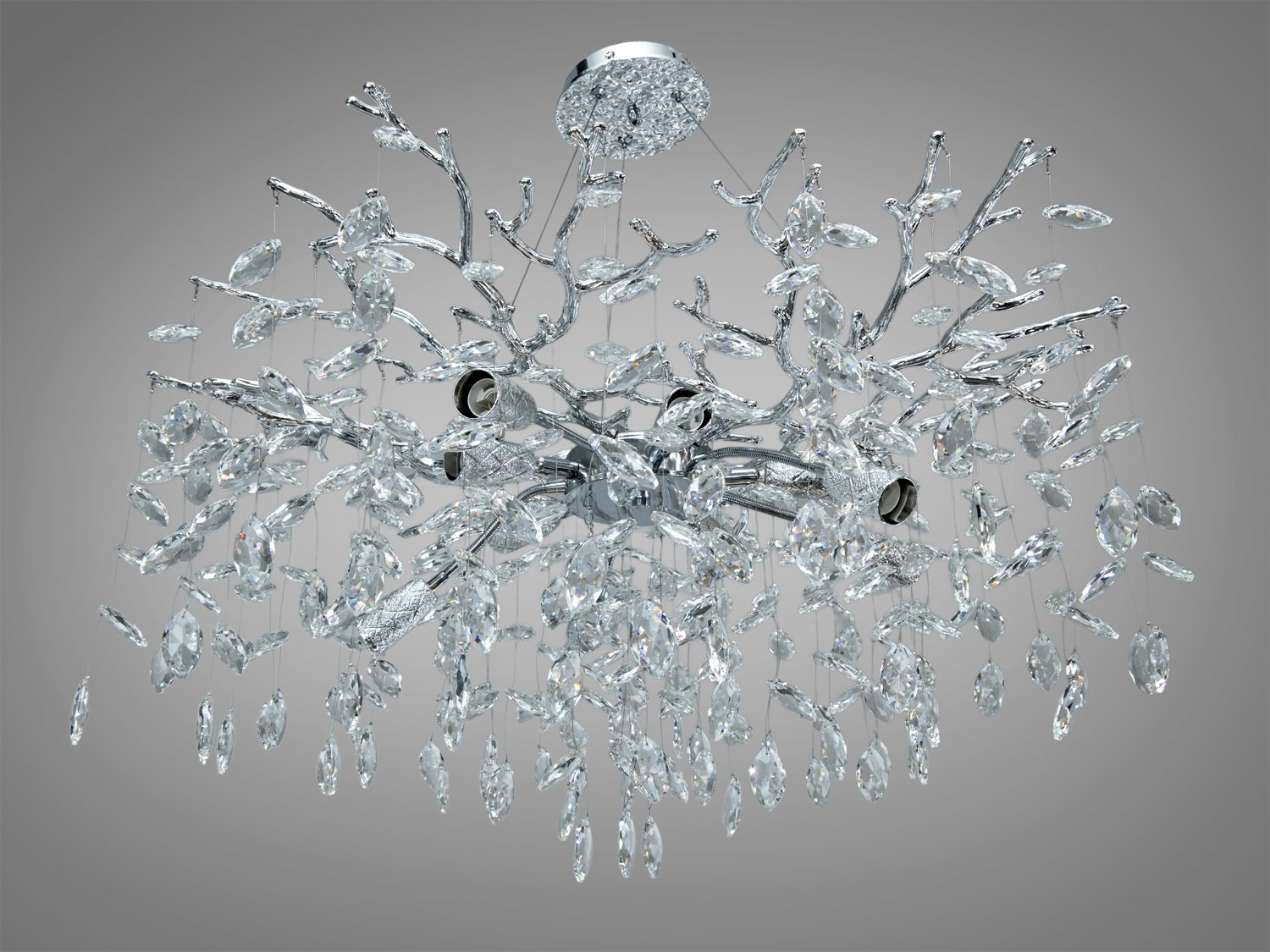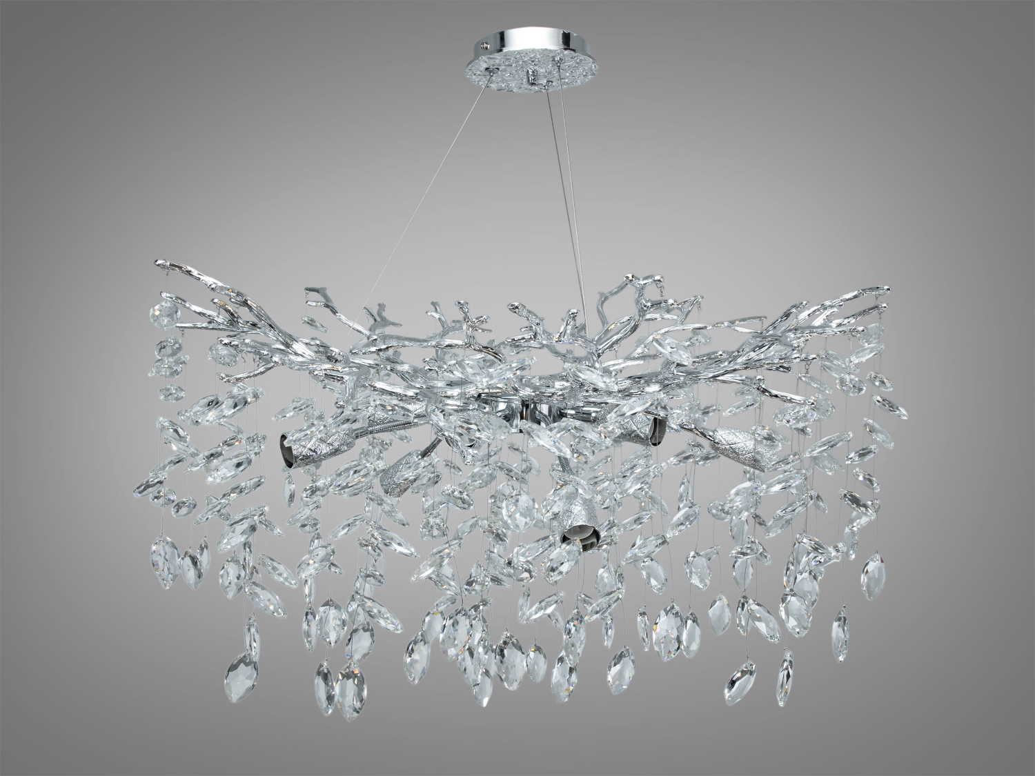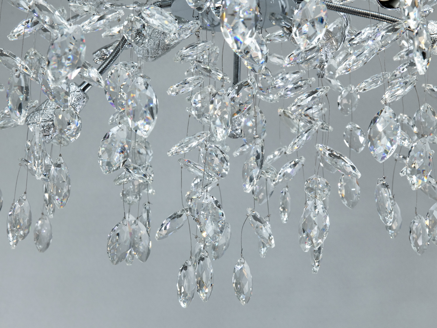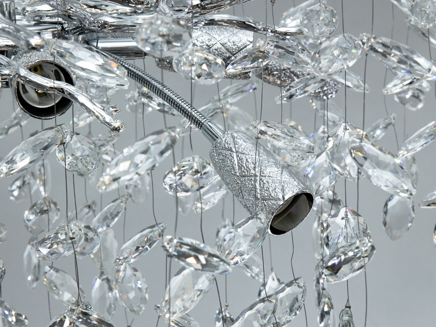 Высота люстры регулируется от 60 до 95 см, что позволяет адаптировать её под любое помещение. Круглая форма и каскады хрустальных подвесок создают эффект ветвей, преломляющих свет и формирующих многослойное сияние.