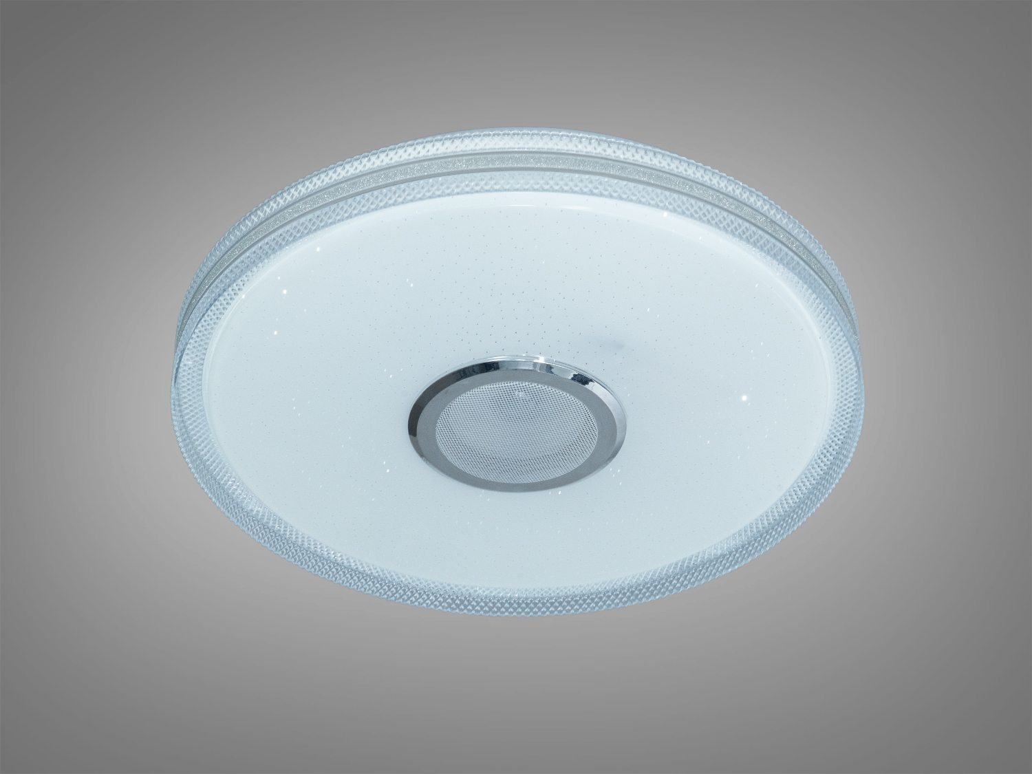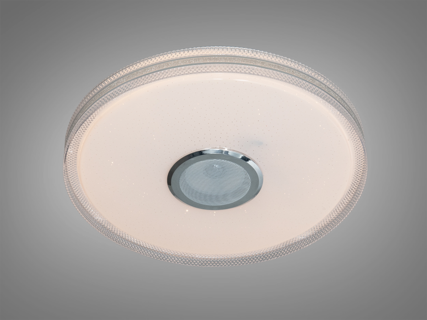 Круглый белый потолочный светильник совмещает освещение и звук в одном корпусе. Мощность 70 Вт предполагает достаточный свет для комнат примерно до 12 м², а RGB-подсветка помогает менять настроение пространства. Управление доступно через приложение i-Link на смартфоне и пультом. Встроенная стерео Bluetooth-колонка воспроизводит музыку по беспроводной связи.