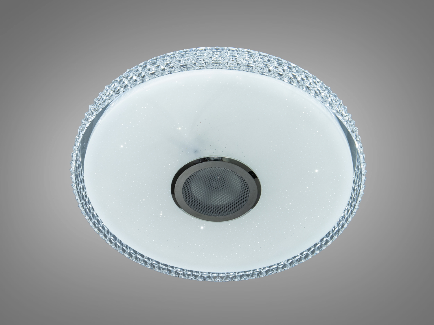 Круглая потолочная люстра Diasha в белом цвете объединяет освещение и звук в одном устройстве. Мощность около 70 Вт обычно подходит для помещений до 12 м² при стандартной высоте потолка. Матовое покрытие рассеивателя обеспечивает мягкое равномерное свечение, а прозрачный обод в декоративных режимах может создавать эффект звездного неба.