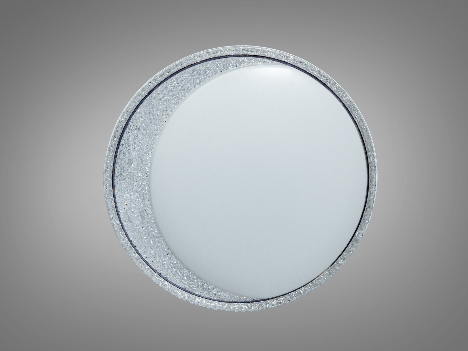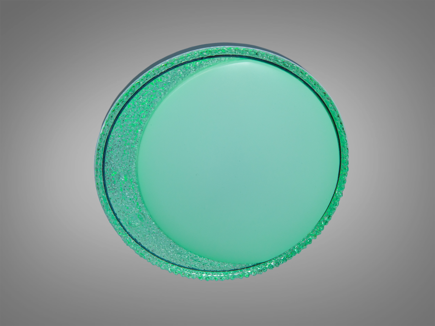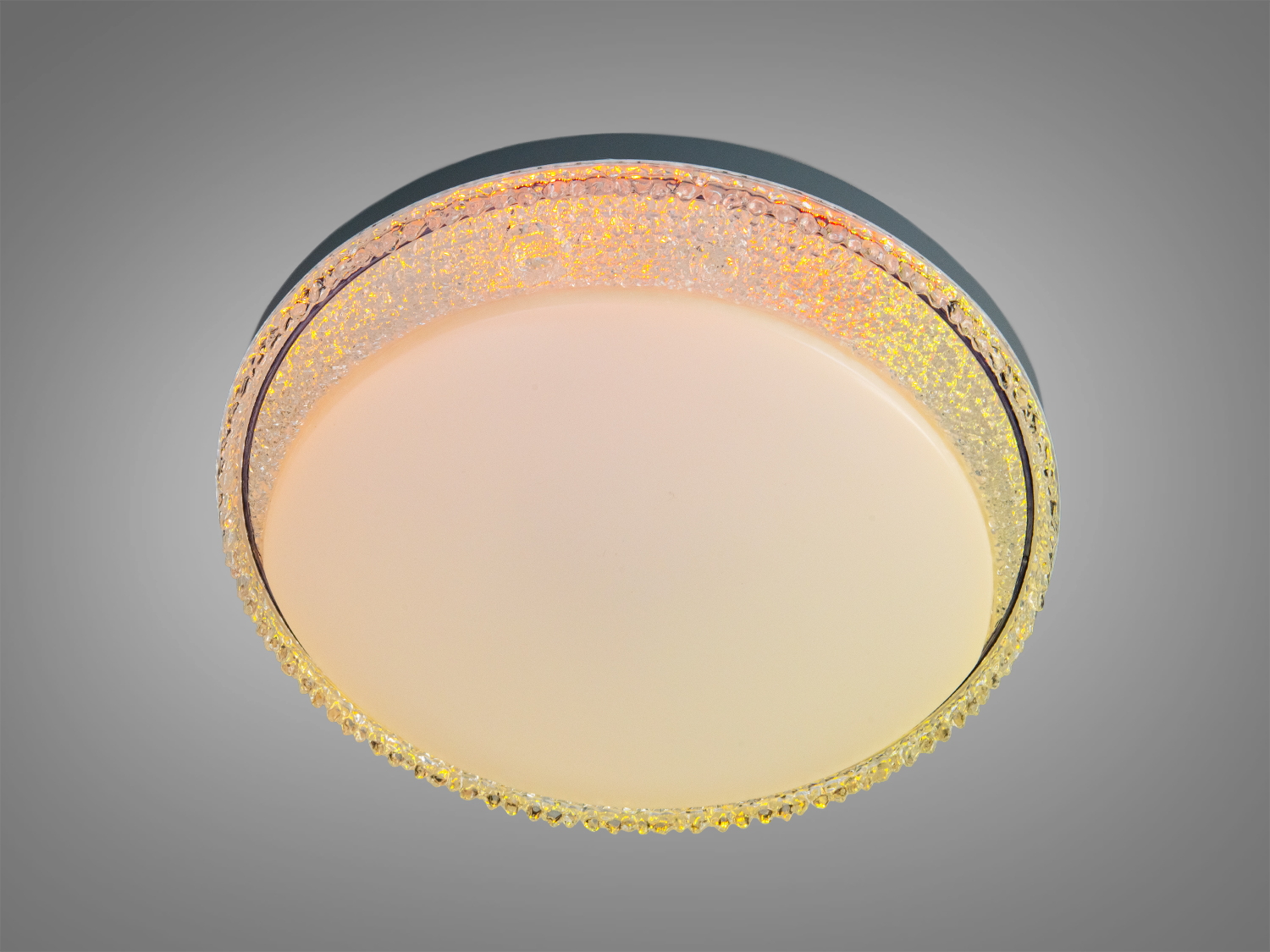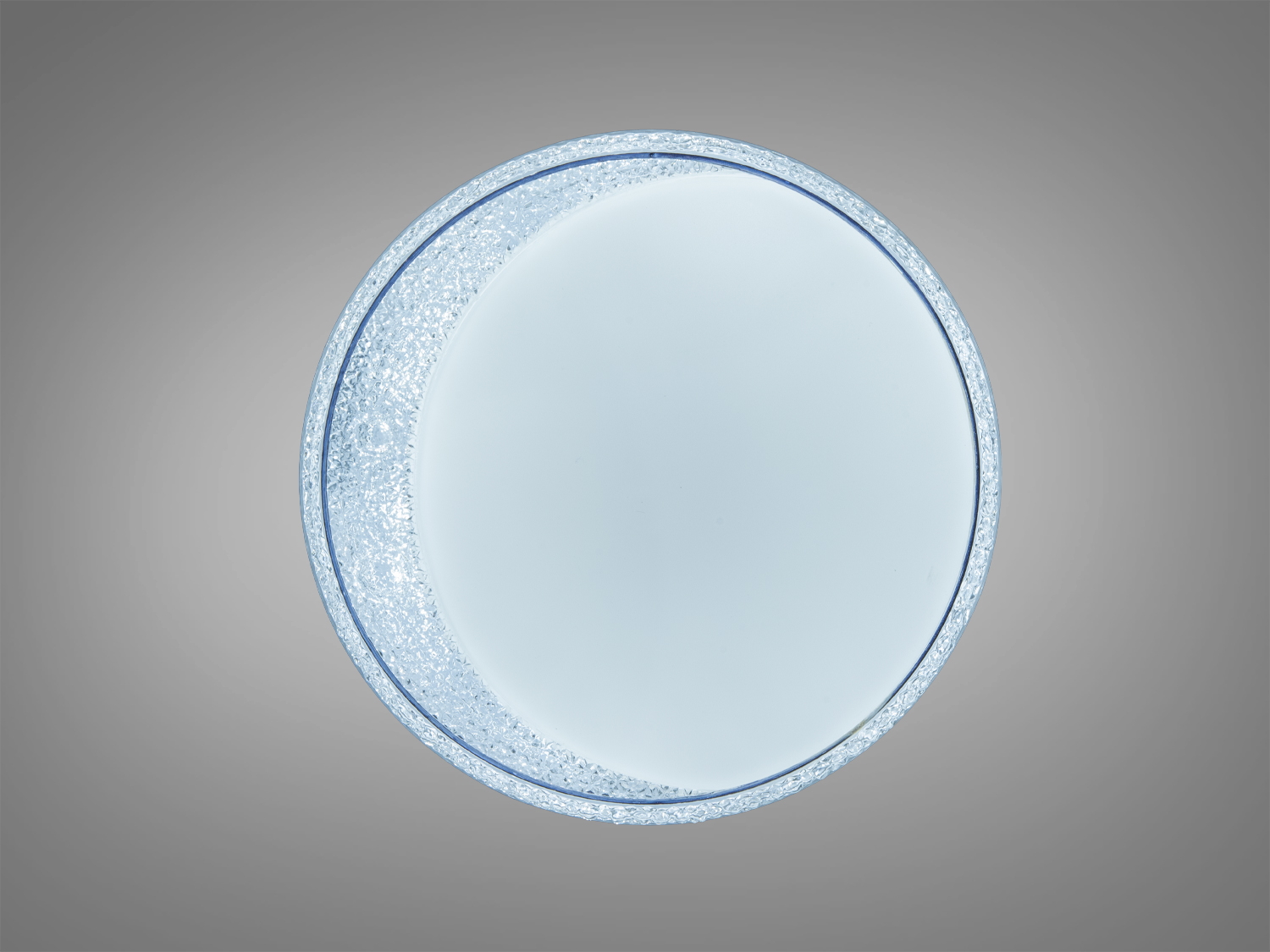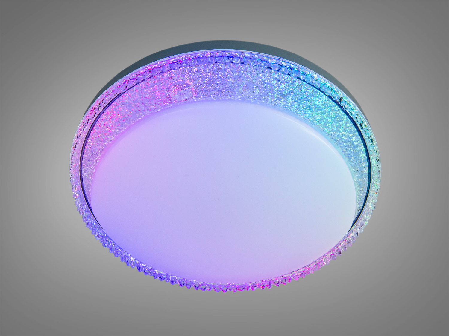 Белый корпус легко вписывается в современные интерьеры. Декоративный кристаллический ободок создаёт мягкие блики по краям и выделяет контур плафона. Круглая оптика обеспечивает равномерный свет, а отдельная RGB-подсветка может подсвечивать контур — например, голубым оттенком или другими цветами согласно выбранному режиму.