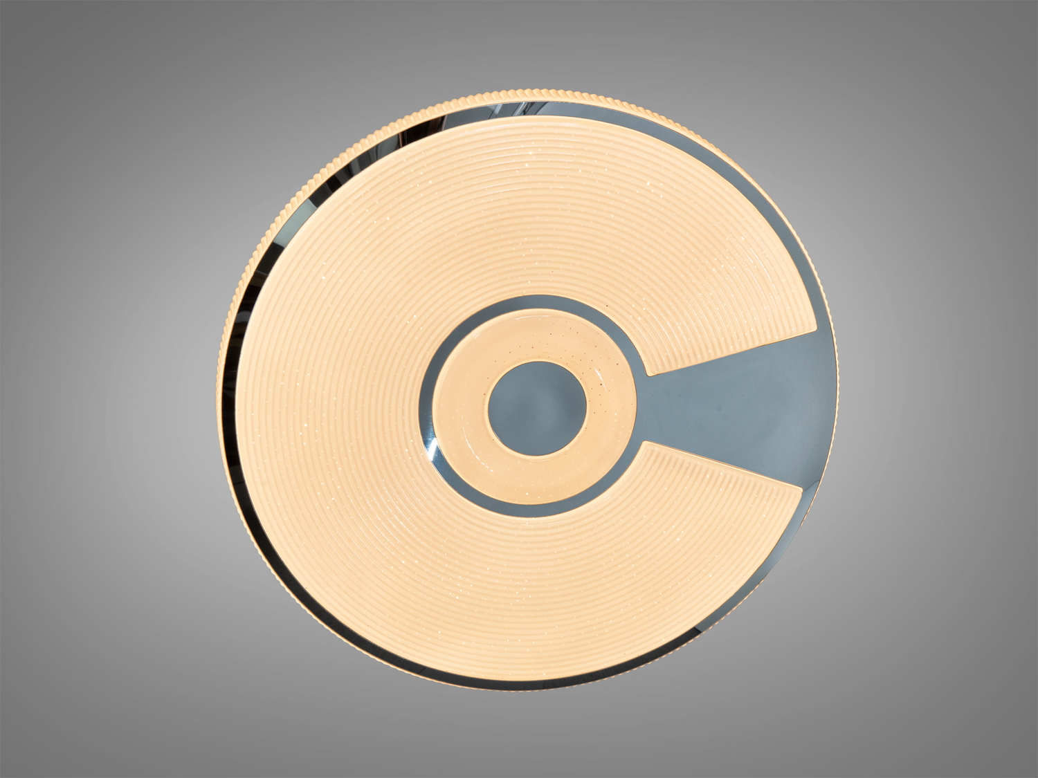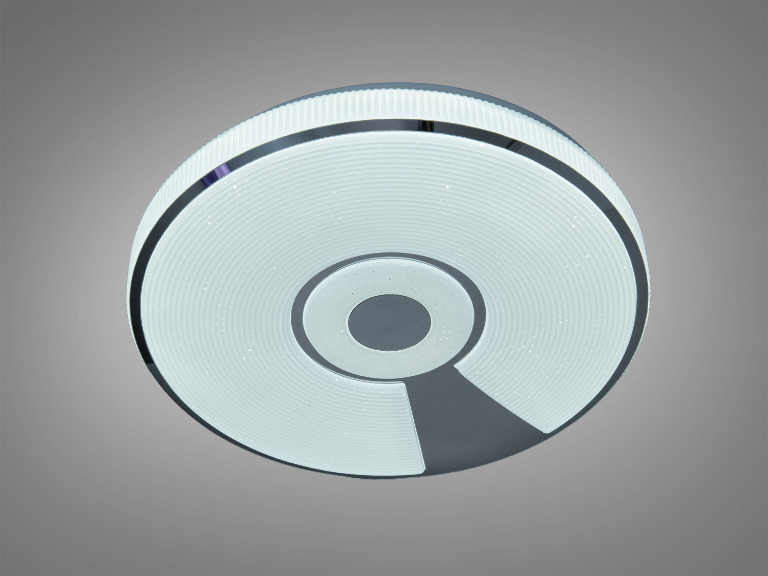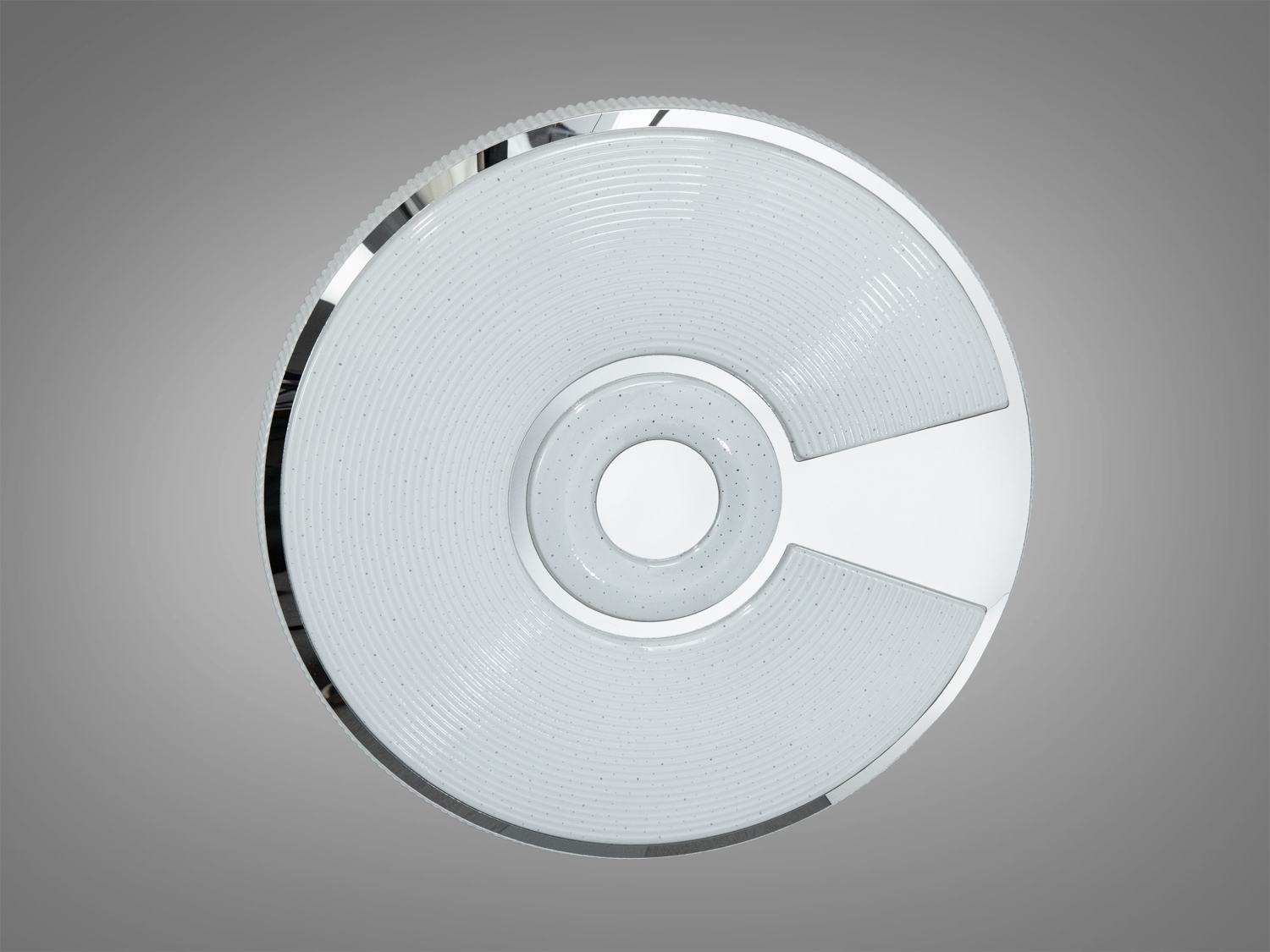 Круглая геометрия помогает равномерно распределять свет. Белый корпус с серебристыми деталями смотрится сдержанно и аккуратно. Монтаж на потолок экономит место и обеспечивает чистый визуальный контур без лишних элементов.