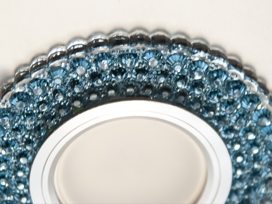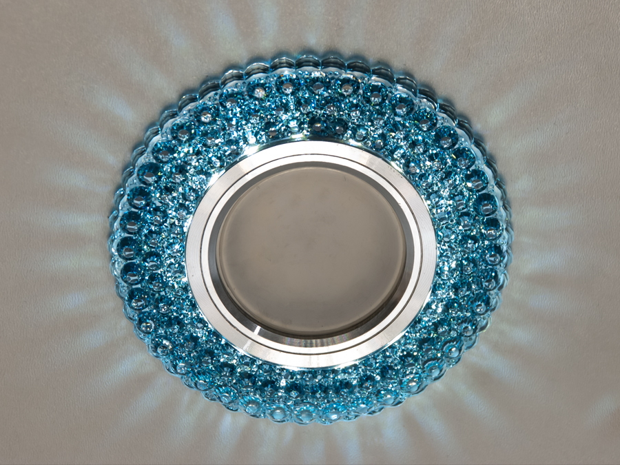 Цей світильник оснащений світлодіодною лампою MR16, яка забезпечує чітке та яскраве освітлення. Навколо лампи розташовано кільце з акрилової смоли, що імітує блиск кристалів. Коли світильник увімкнений, кристали відбивають світло, створюючи ефект мерехтливих зірок.