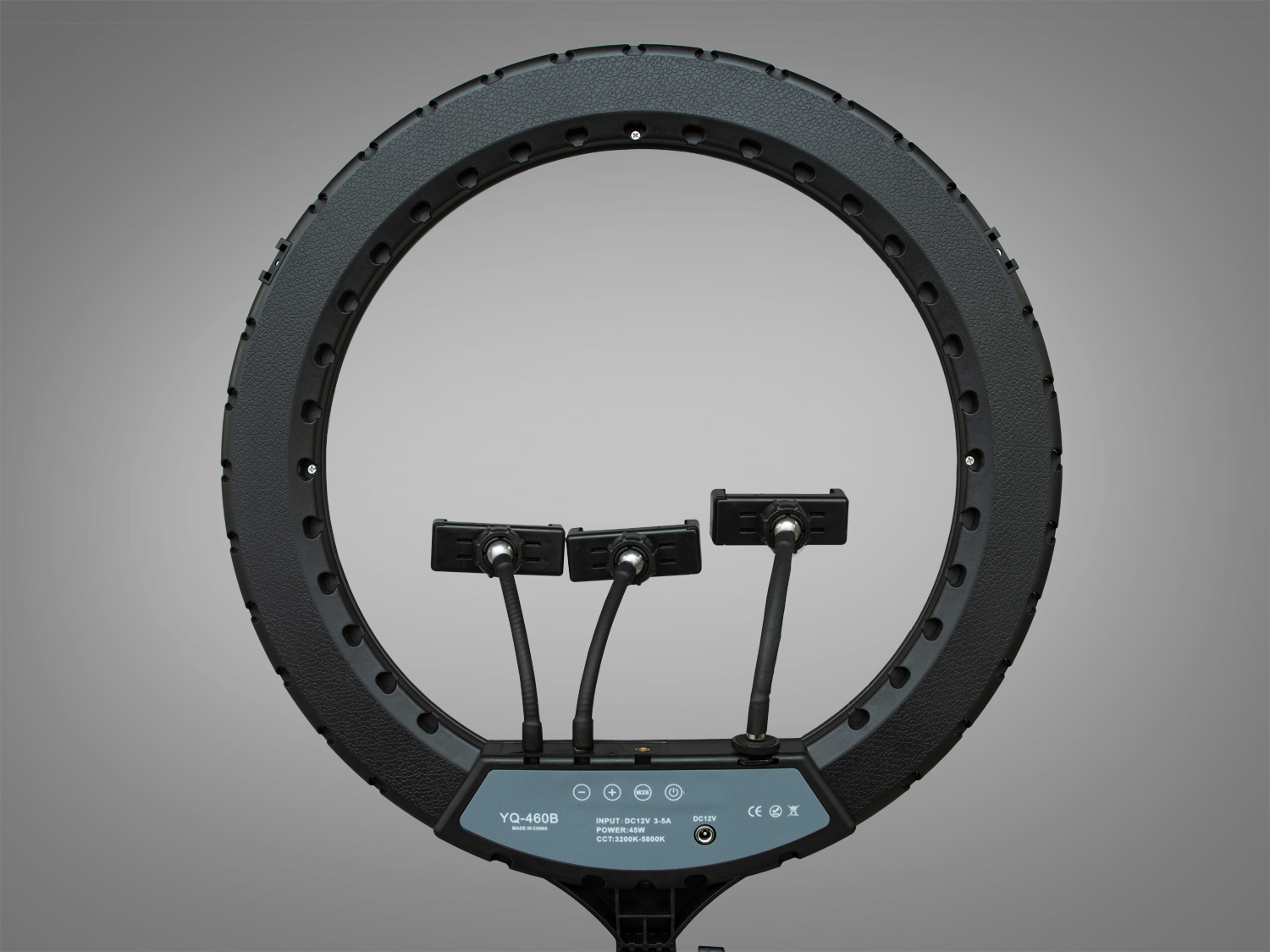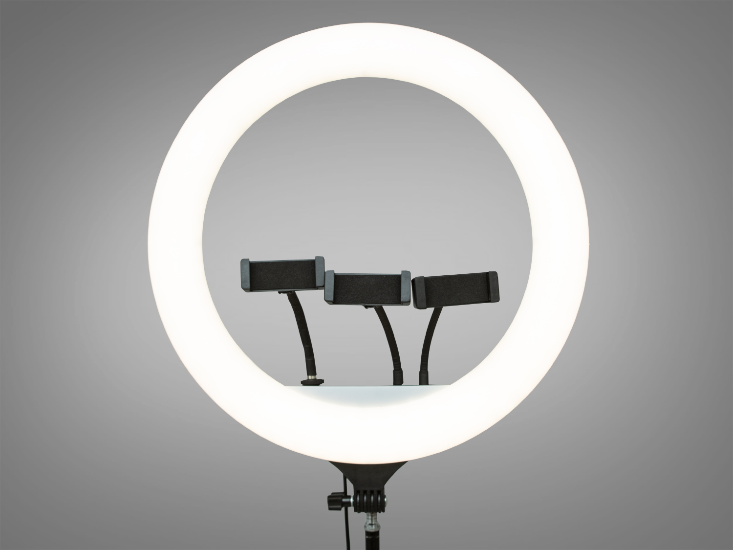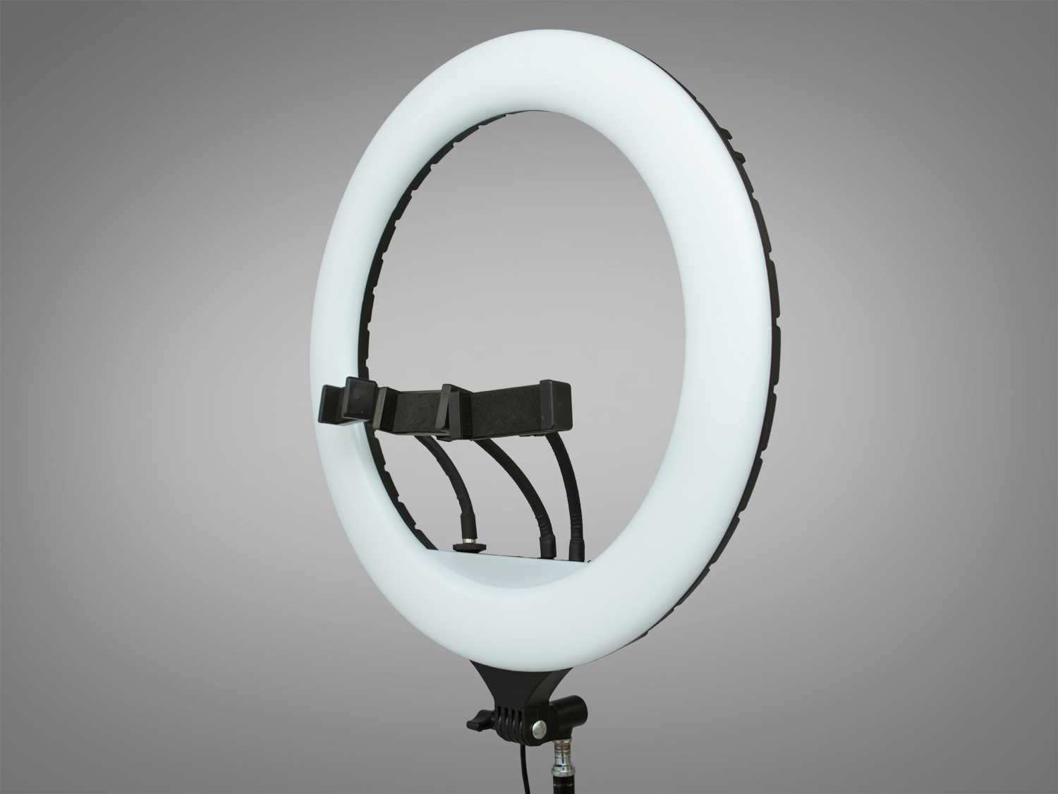 Діаметр лампи в 44 см оптимальний для портретної зйомки. Вона рівномірно освітлює обличчя, підкреслюючи кожну деталь. Комплект включає три тримачі для телефону, що дозволяє використовувати різні кути зйомки. Це особливо зручно для стрімів та відеодзвінків.