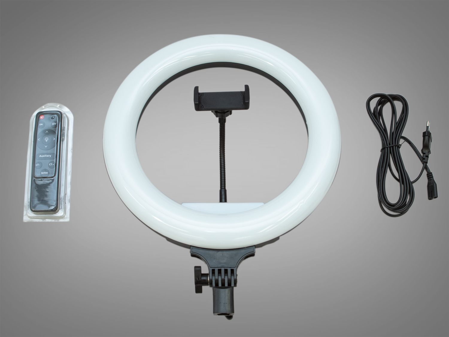 Лампа також оснащена адаптером для кріплення на штативи, що робить її багатофункціональним інструментом. У комплект входять пульт ДК, тримач для телефону та кабель живлення, що робить її зручною у використанні.
