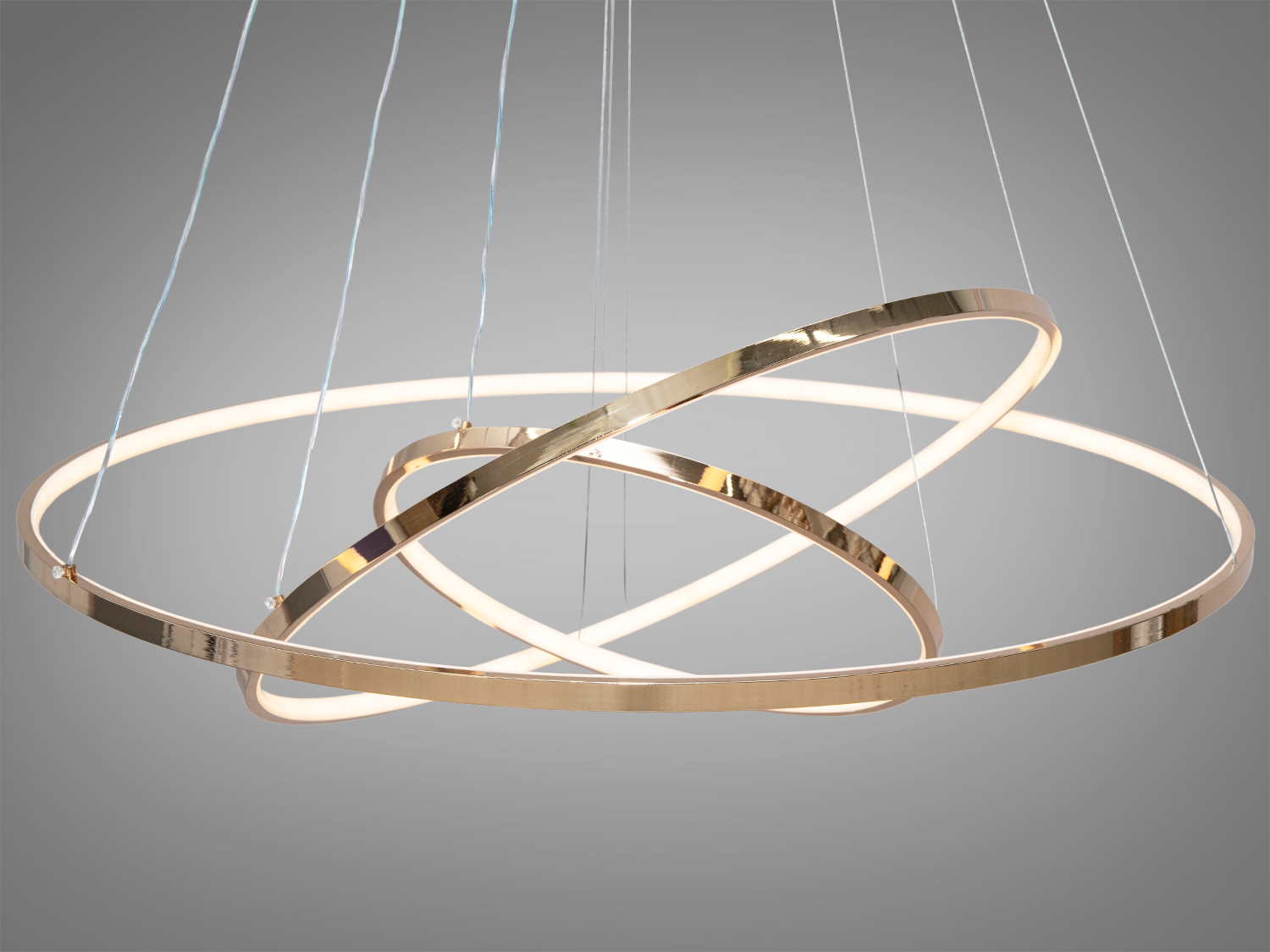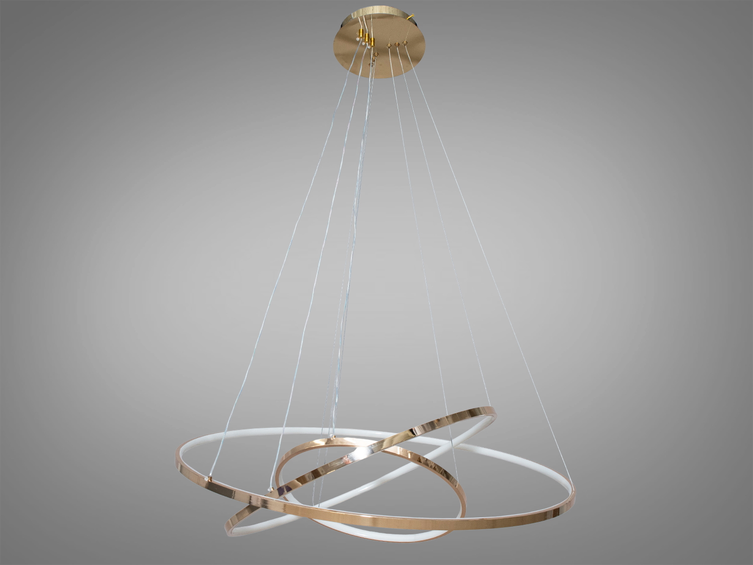 Підвісна LED люстра кільцями — доповнення для вашої зали. Сучасний дизайн у поєднанні з потужністю 150W дозволяє освітлювати площу до 22 м². Люстра виконана в золотому кольорі, що додає вишуканість будь-якому інтер'єру.