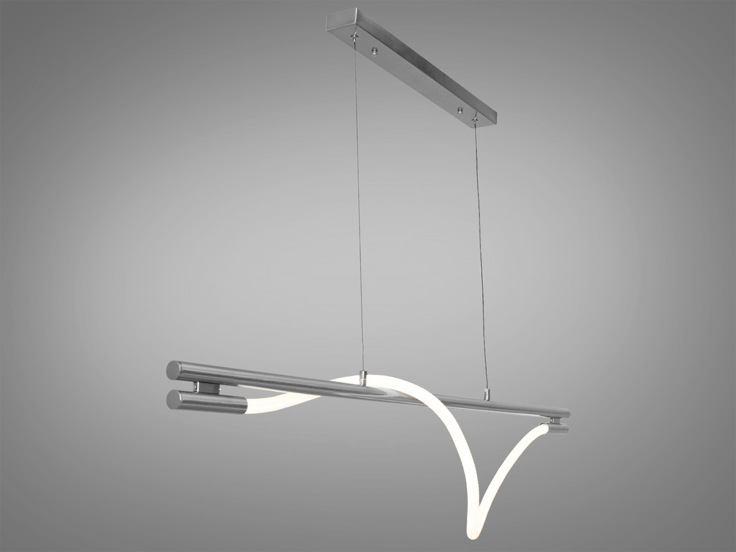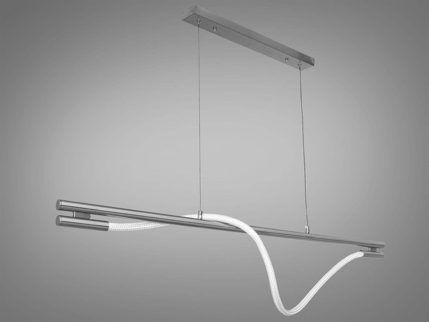 Ця люстра відрізняється гнучким дизайном, завдяки своїй силіконовій трубці, обгорнутій натуральним текстилем. Вона легко обертається навколо металевої основи, створюючи оригінальні світлові форми. Колірна температура 3200K підкреслює деталі інтер'єру, що робить її гарним рішенням для вітальні або кухні.