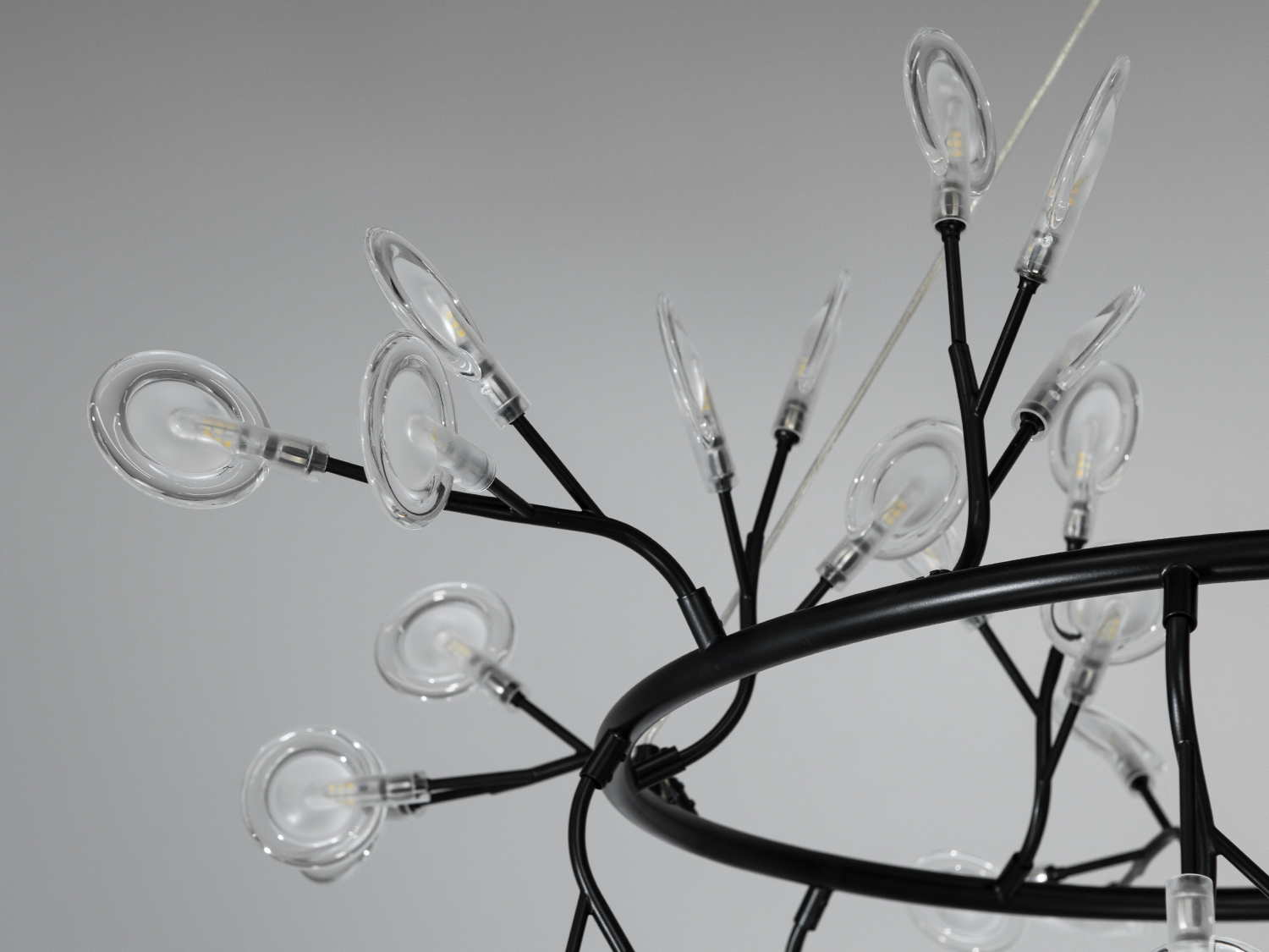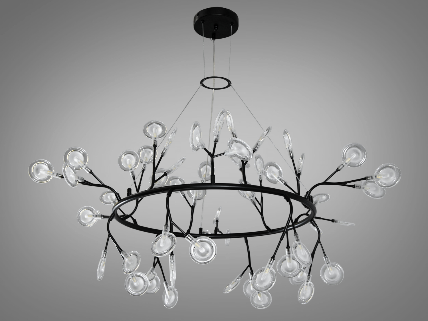 Ця люстра з 54 скляними плафонами, що нагадують форму плескатої колби, стане яскравим акцентом у вашій кухні-студії або будь-якому іншому просторому приміщенні. Її діаметр у 110 см робить її підходящою для великих просторів, таких як вестибюлі готелів або лобі.