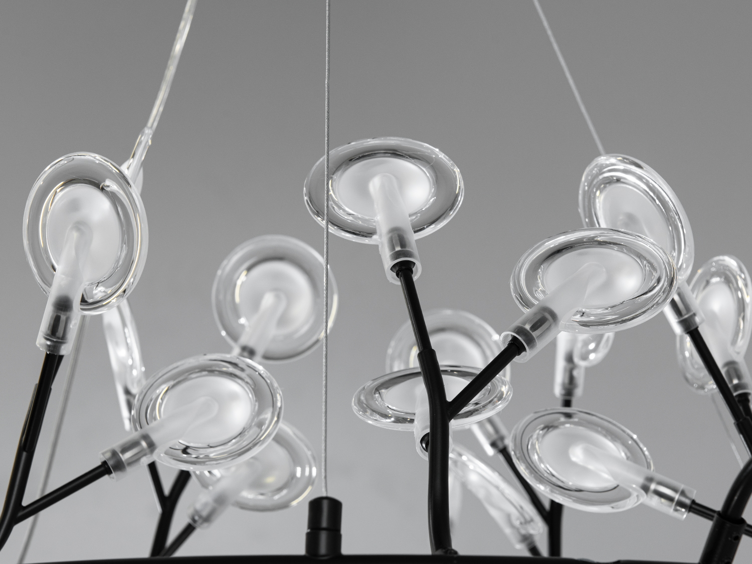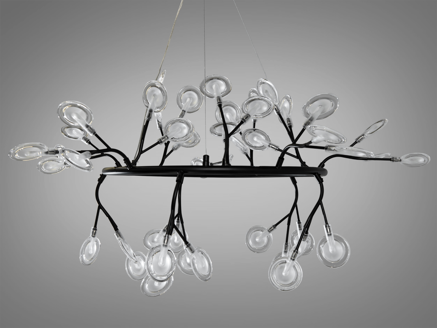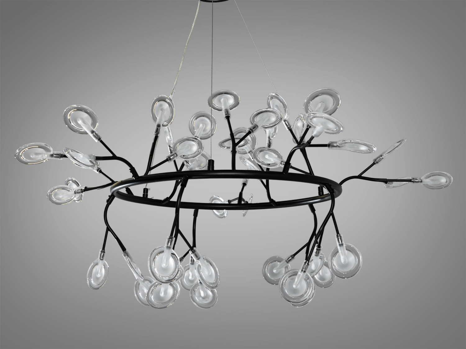 З 45 лампочками і основою діаметром 100 см, ця люстра здатна створити чудове освітлення, наповнюючи кімнату теплом і світлом. Унікальні плафони зі скла, що нагадують зірки, розміщені на тонких металевих гілках, що додає виробу вишуканості.