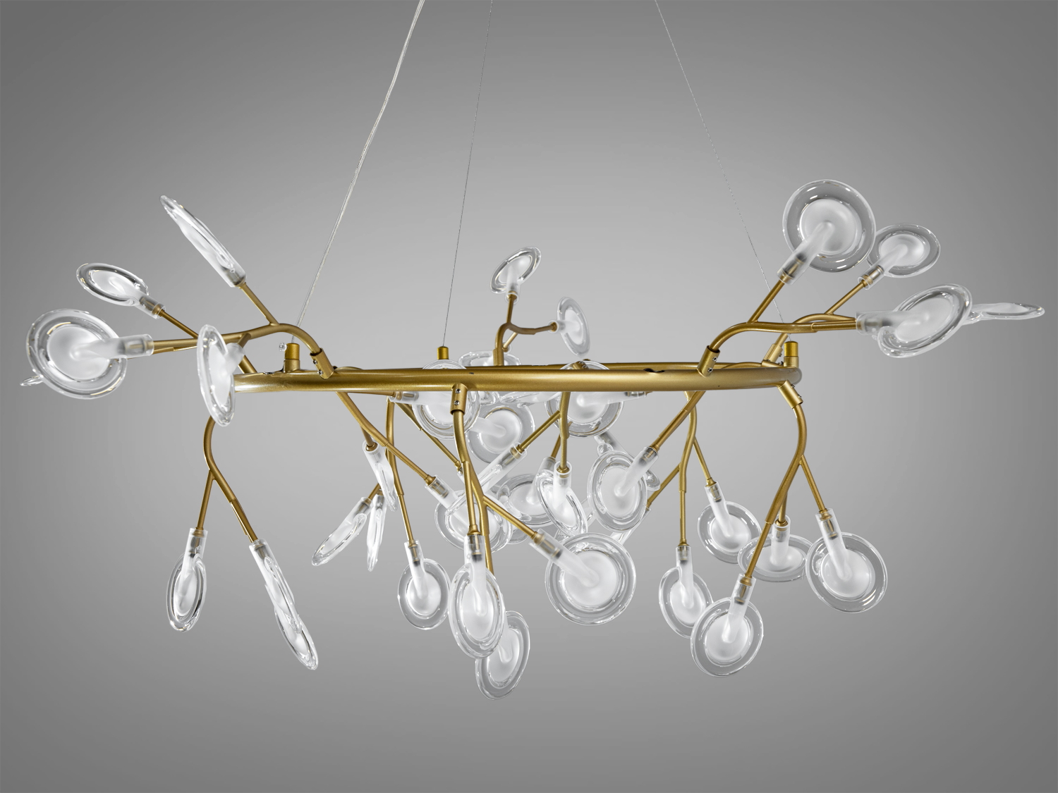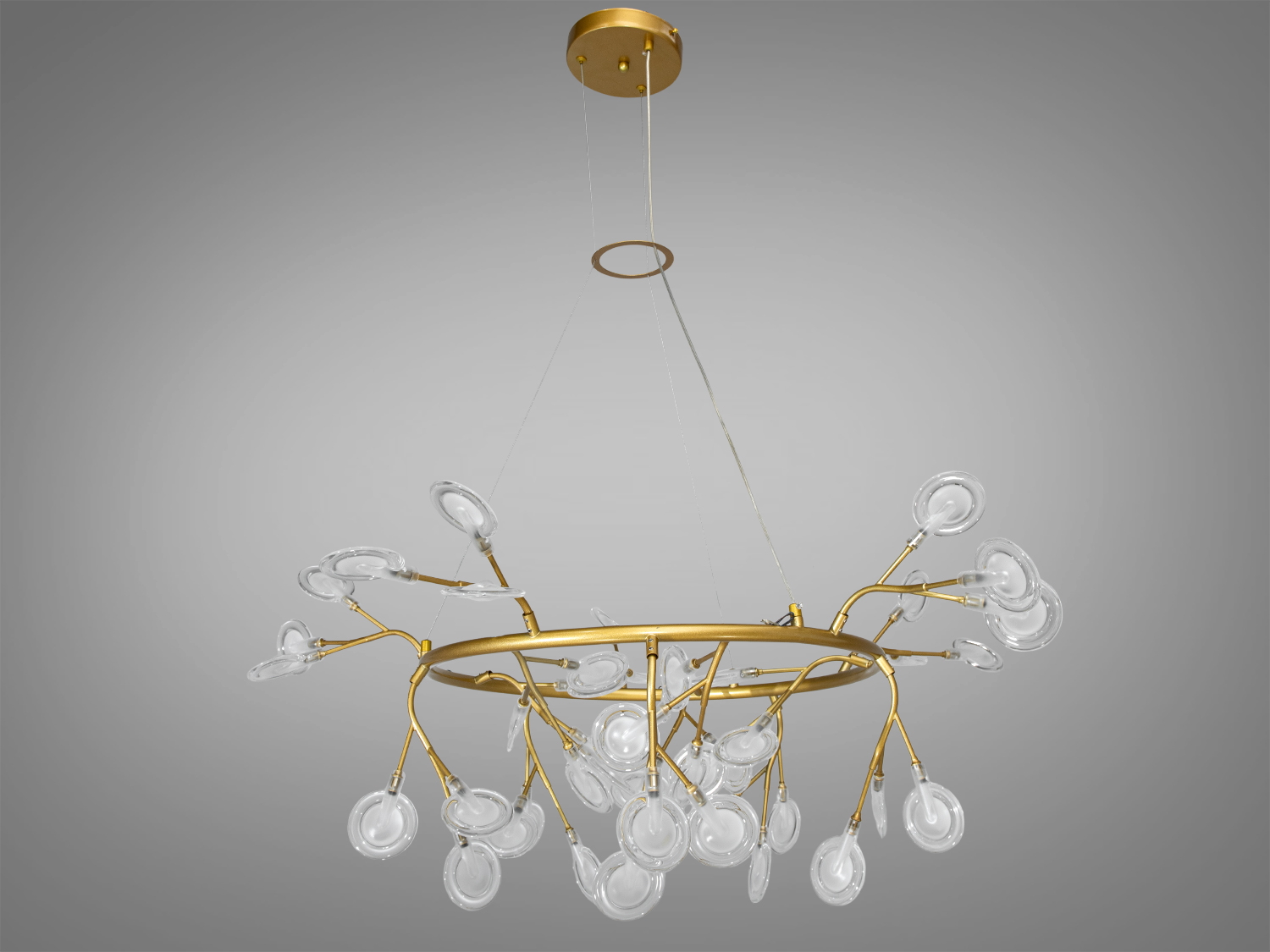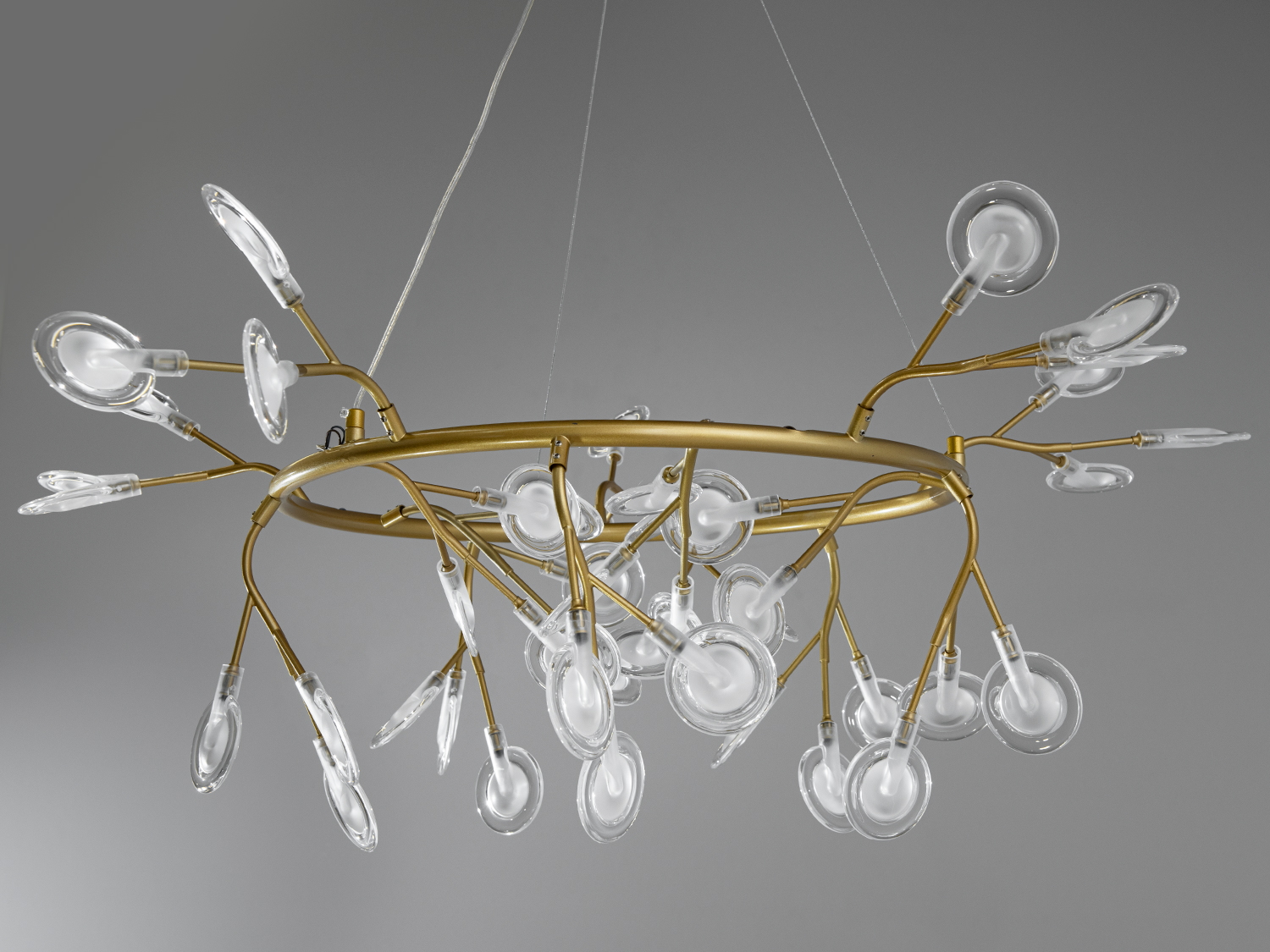 Люстра оснащена 45 скляними плафонами, кожен з яких має матове акрилове покриття для рівномірного розподілу світла. Це забезпечує м'яке освітлення, створюючи затишну атмосферу.