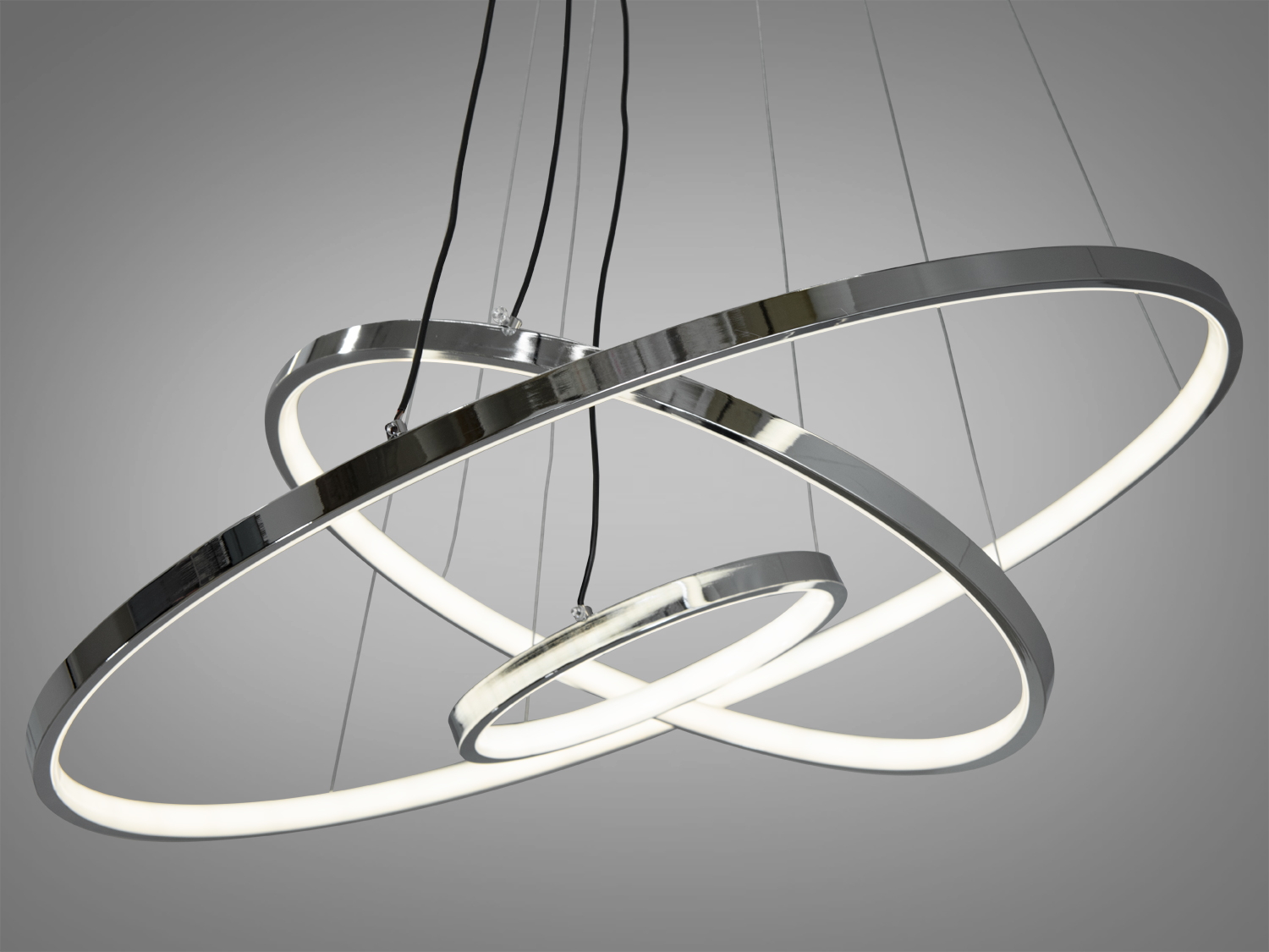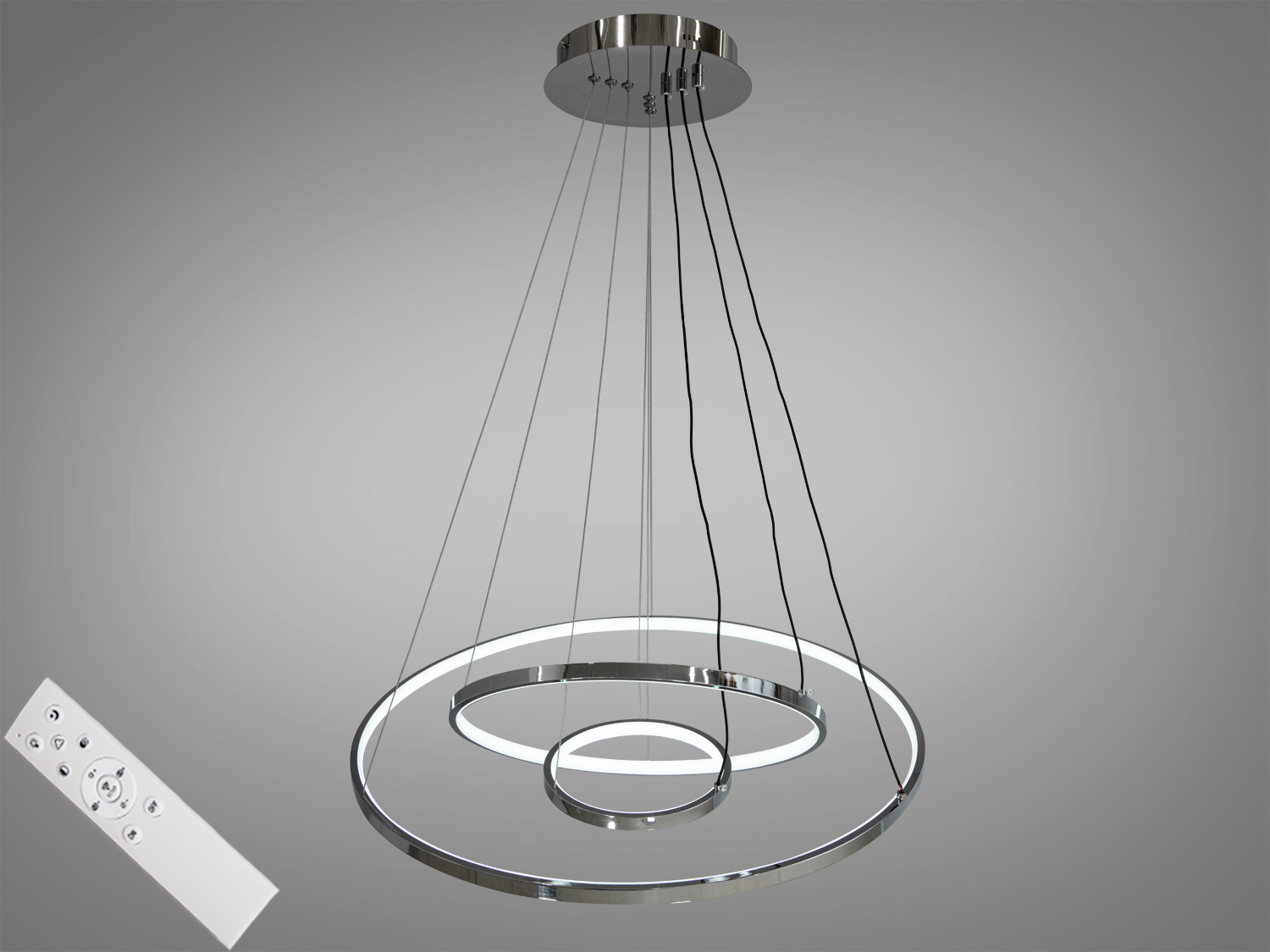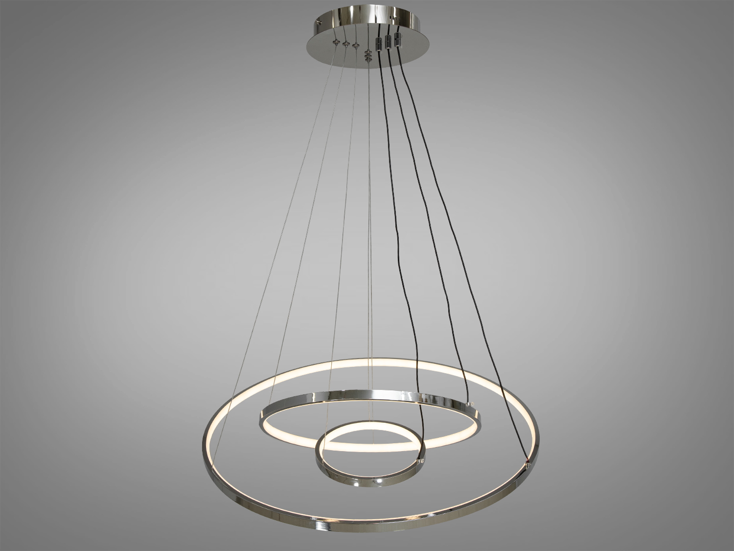 Висота люстри регулюється від 45 до 135 см, що дозволяє адаптувати її під будь-які інтер'єрні рішення. Діаметри кілець складають 20 см, 40 см та 60 см, створюючи ефектний геометричний малюнок.