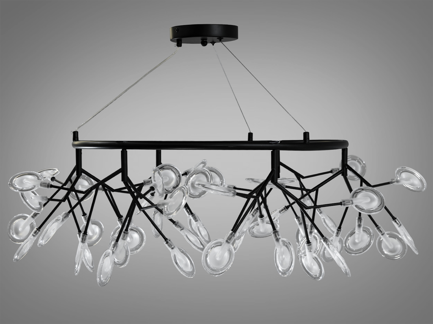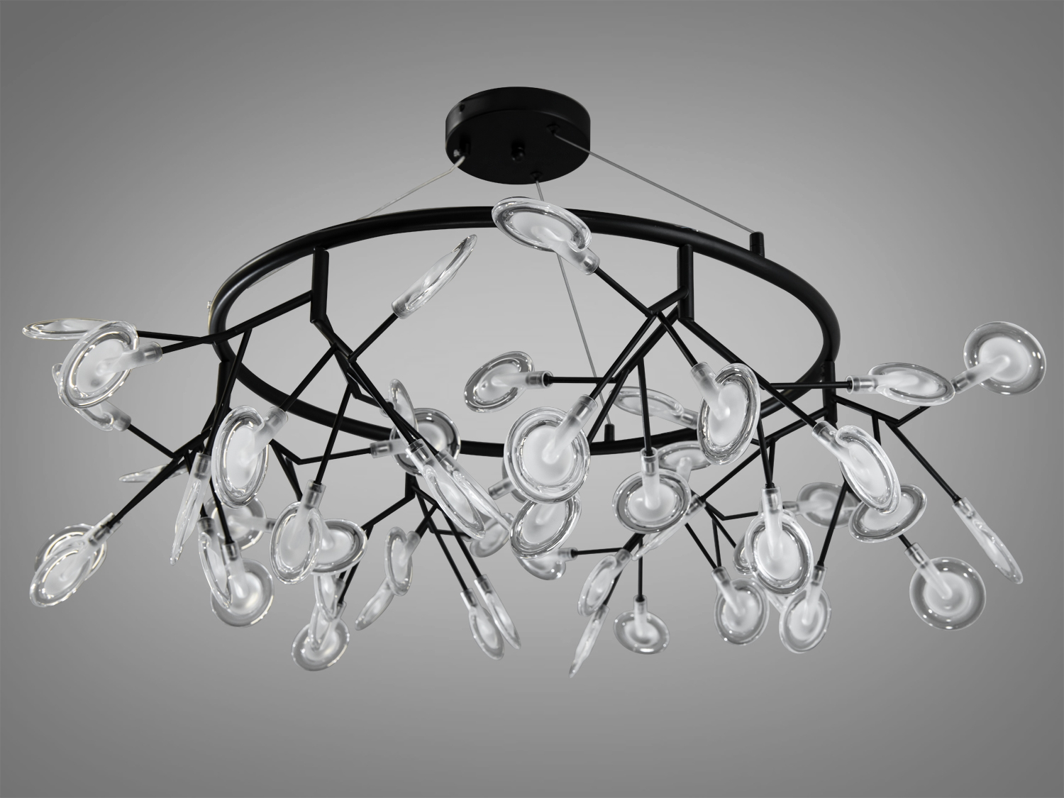 Люстра має міцний металевий каркас та скляні плафони, які надають їй легкість та витонченість. 54 скляних плафони діаметром 7.5 см створюють м'яке та рівномірне освітлення.