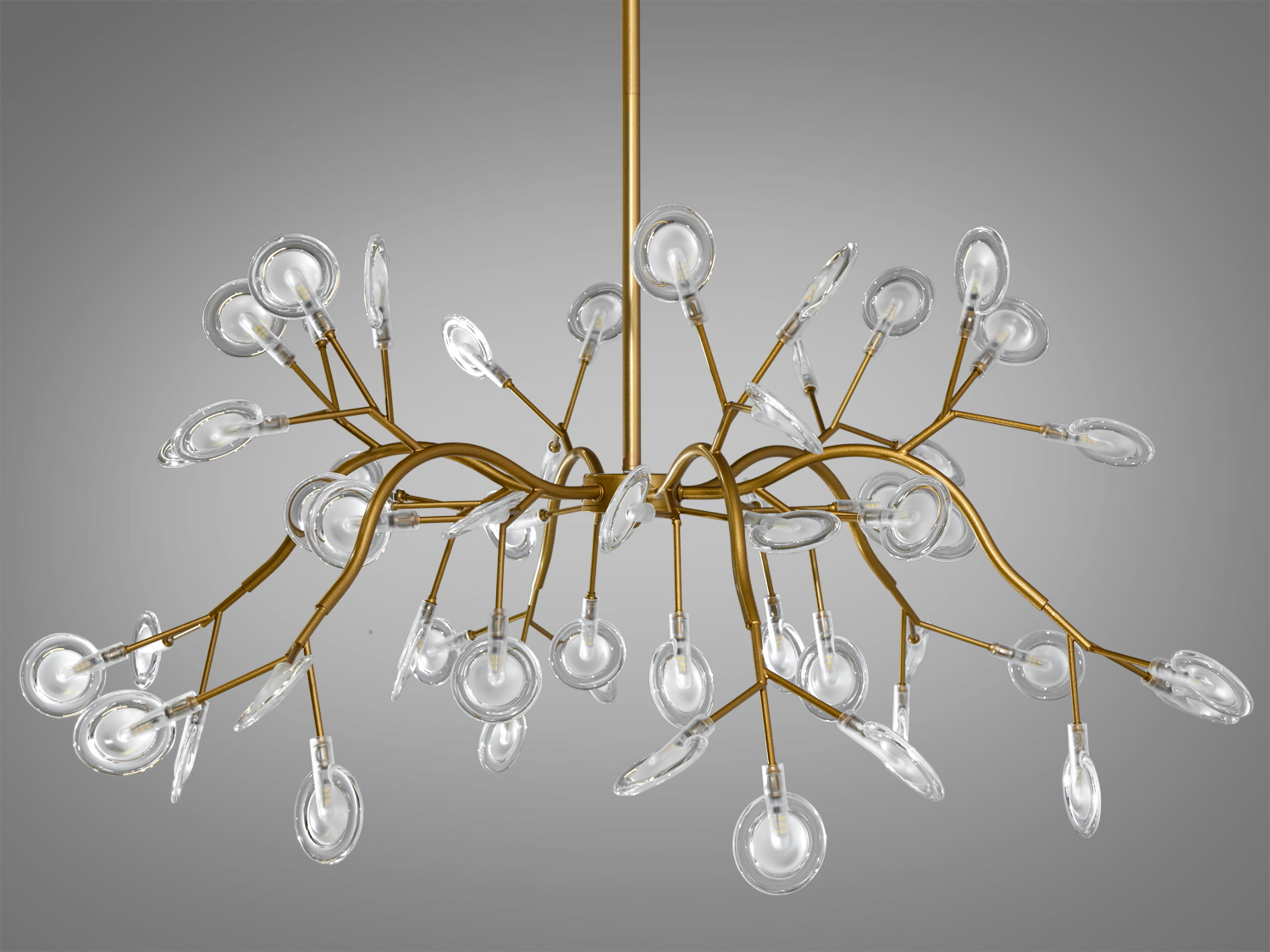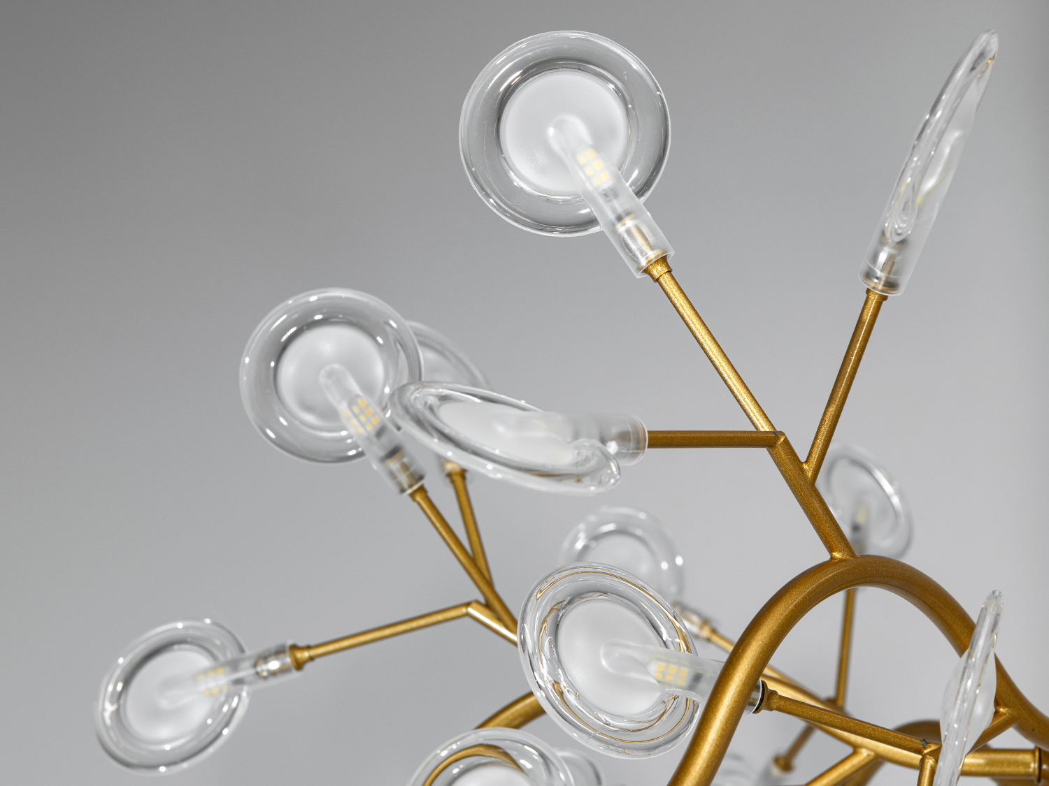 Люстра оснащена 54 скляними плафонами у формі плескатої колби діаметром 7.5 см. Внутрішній матовий акриловий плафон приховує лампу G4, забезпечуючи м'яке та рівномірне освітлення. Висота люстри регулюється, що дозволяє адаптувати її під різні простори і висоти стель.