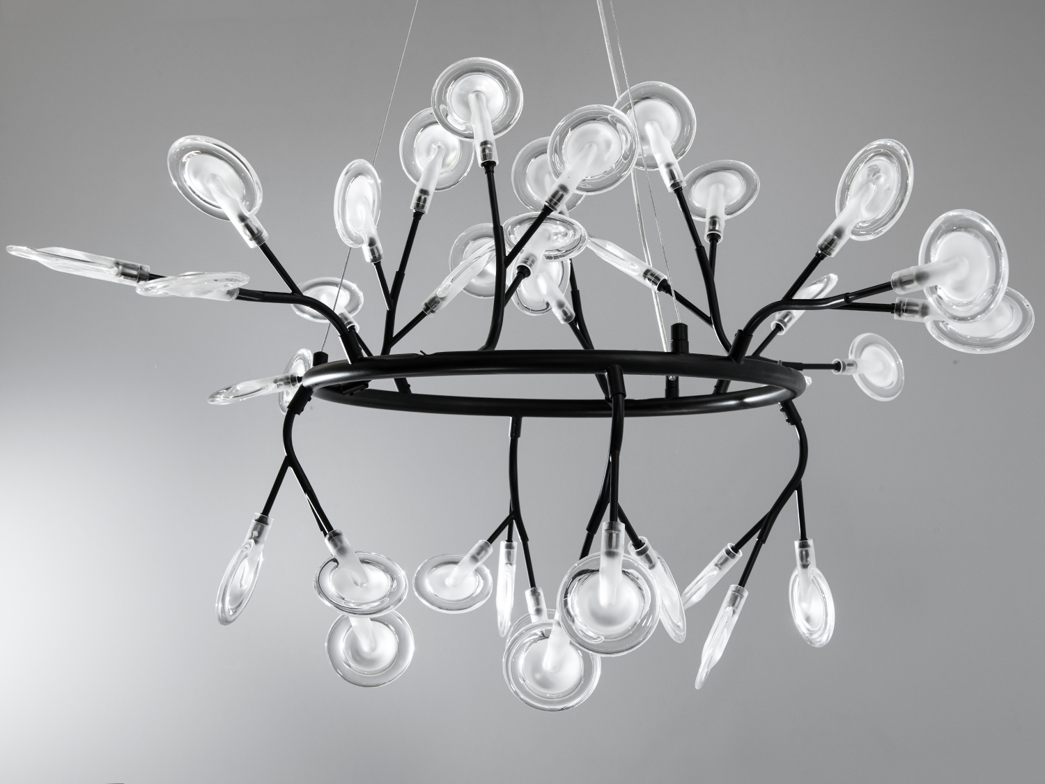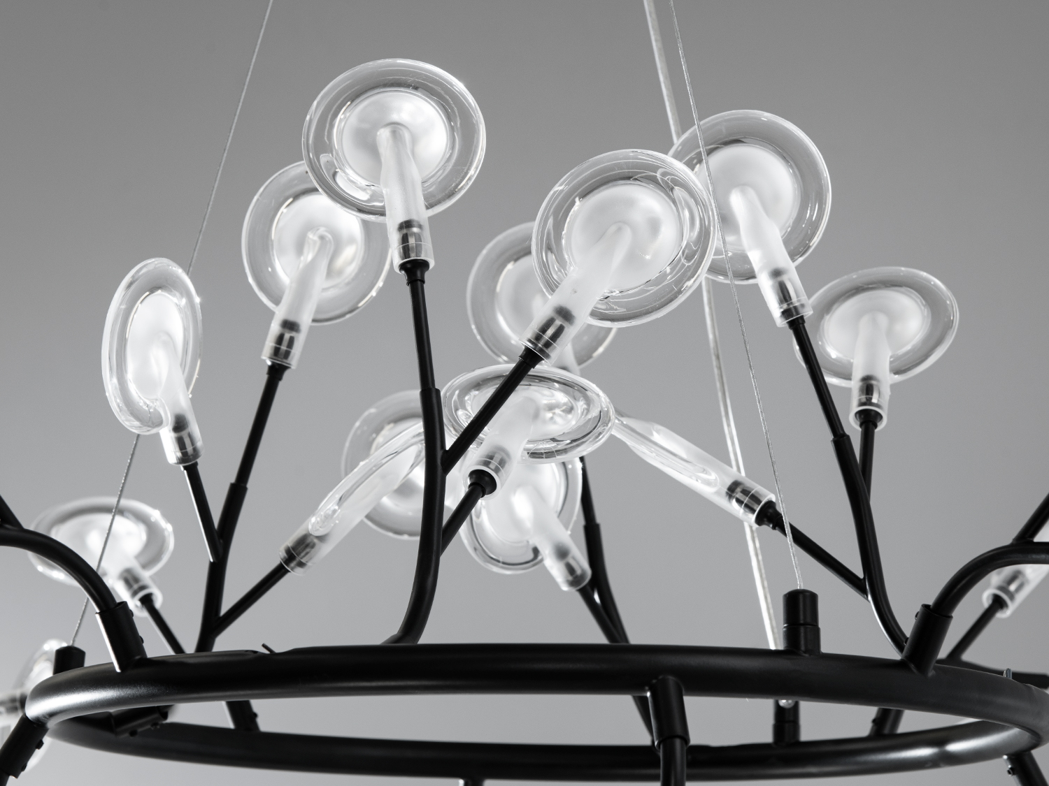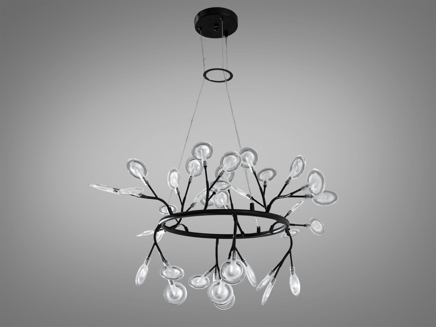 Люстра має сучасний дизайн з 36 скляними плафонами у формі плескатих колб. Внутрішній матовий акриловий плафон забезпечує м'яке і рівномірне освітлення, роблячи її підходящою для залів, кафе або арт-просторів.
