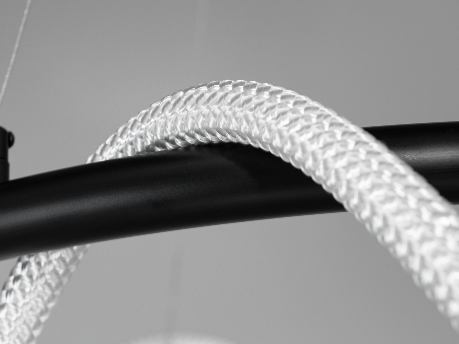 Люстра виконана з металевого каркасу з силіконовими абажурами, що забезпечує довговічність і стильний зовнішній вигляд. Гнучка силіконова трубка, обгорнута натуральним текстилем, створює хвилеподібні світлові форми.