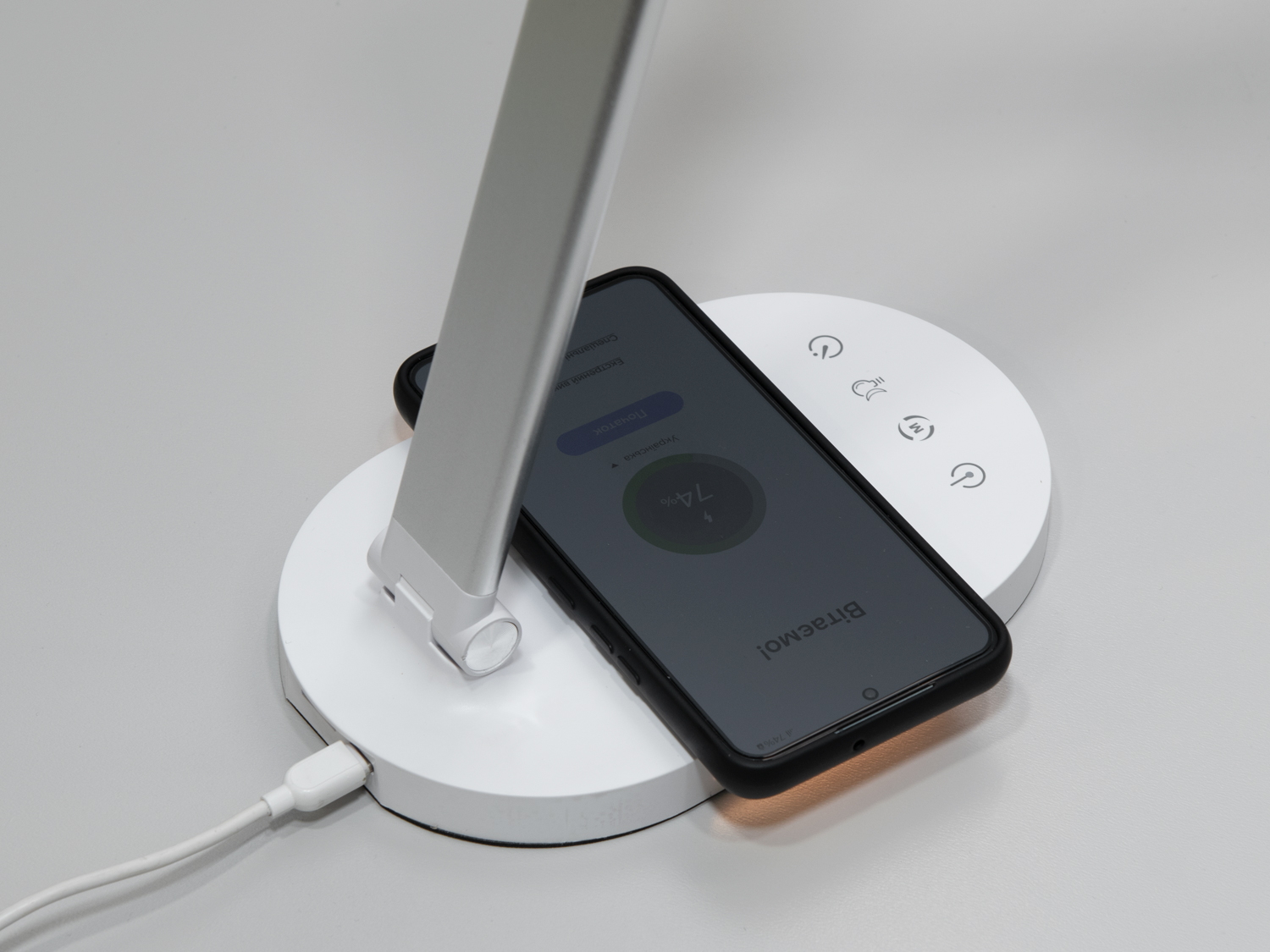 Ця лампа оснащена функцією бездротової зарядки, що дозволяє зручно заряджати мобільні пристрої, просто залишивши їх на базі лампи. Сенсорне управління дозволяє легко регулювати яскравість і таймер, створюючи комфортні умови для роботи або відпочинку.