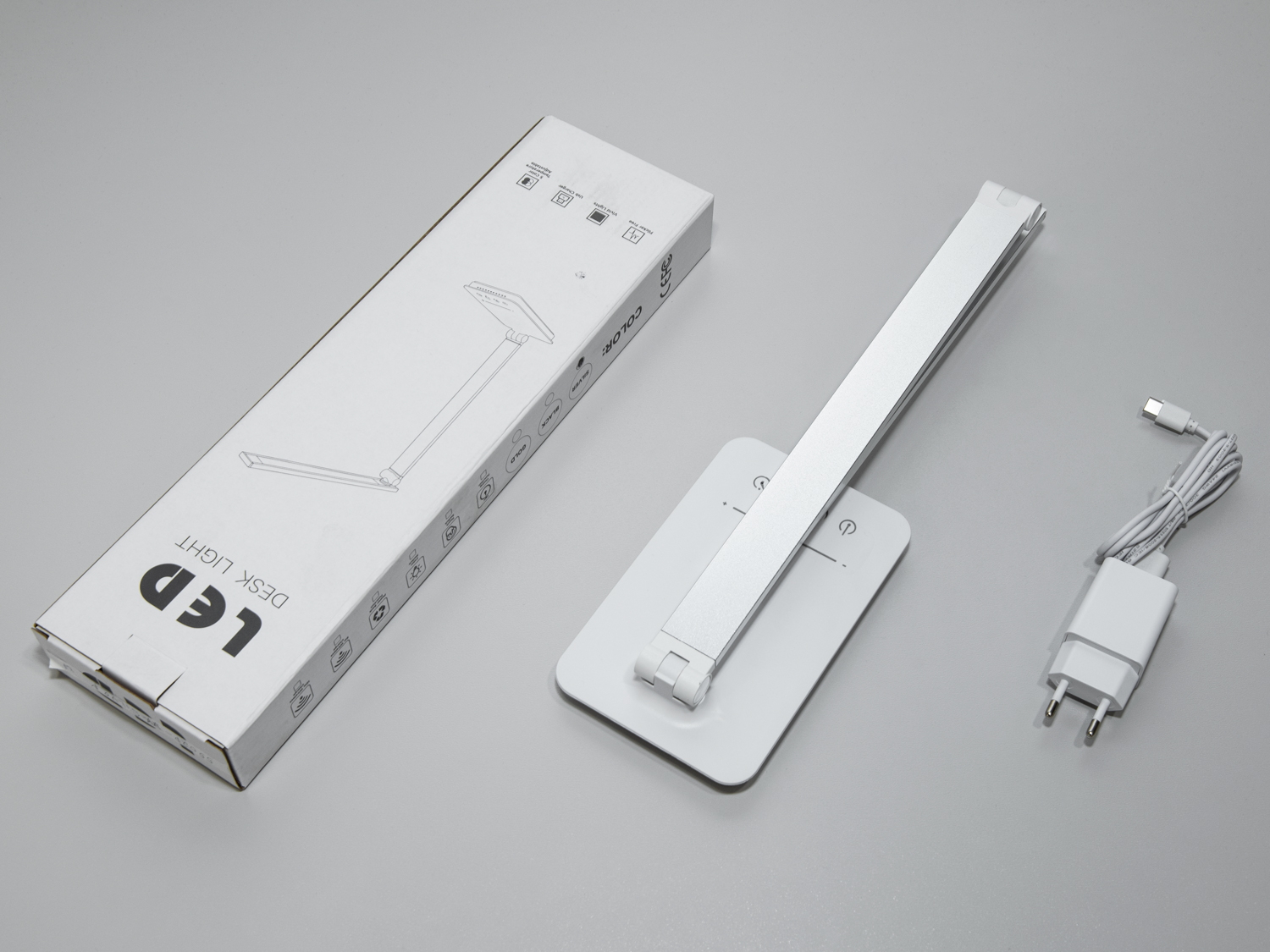 Лампа має тонкий вертикальний стовбур, який легко регулюється, і горизонтально орієнтовану світлодіодну панель для рівномірного світла без сліпучих ефектів. Це робить її підходящою для читання або роботи за комп'ютером.