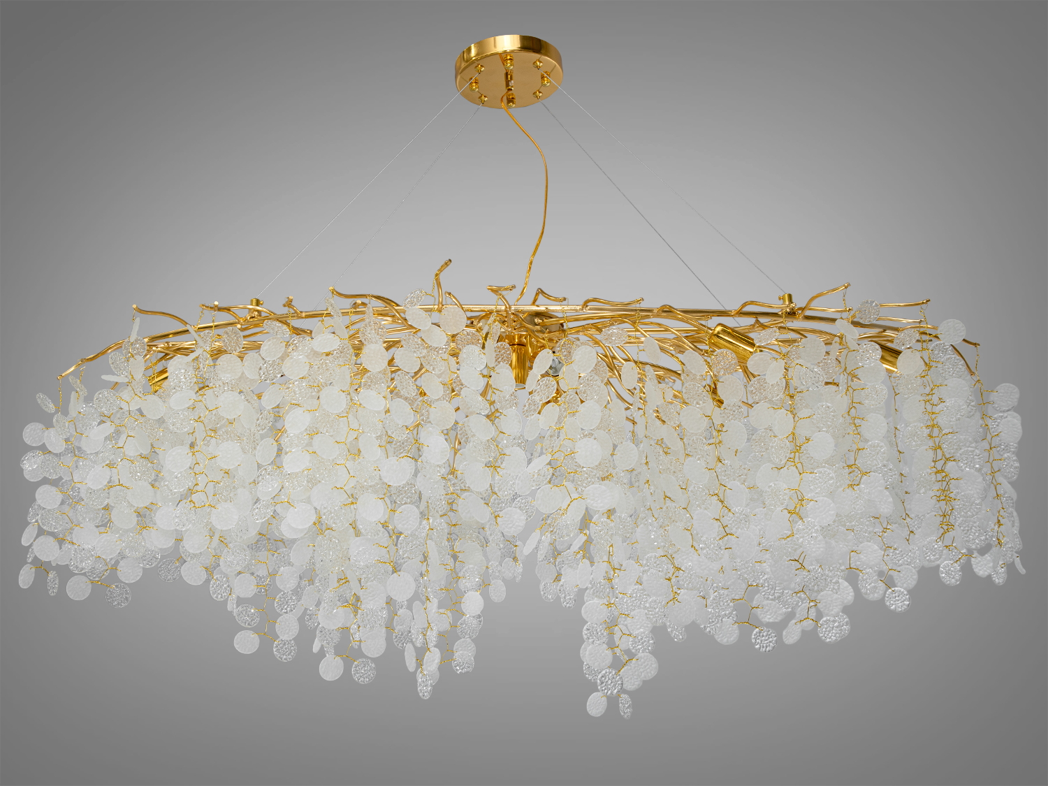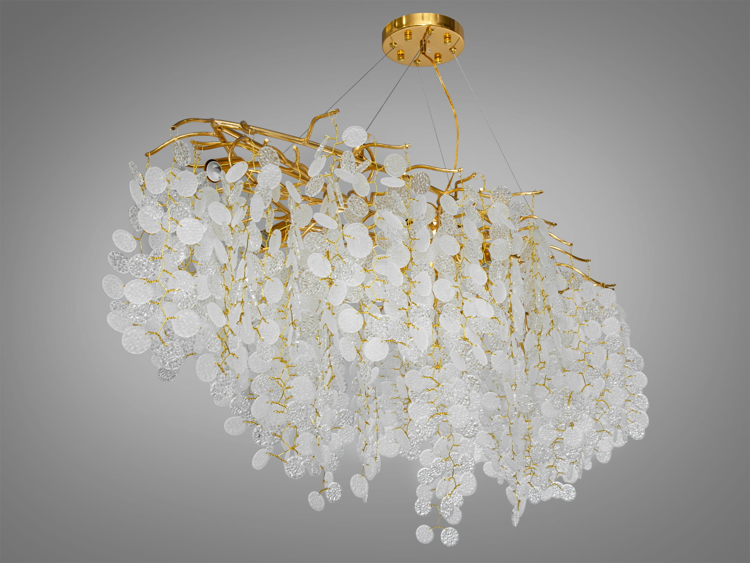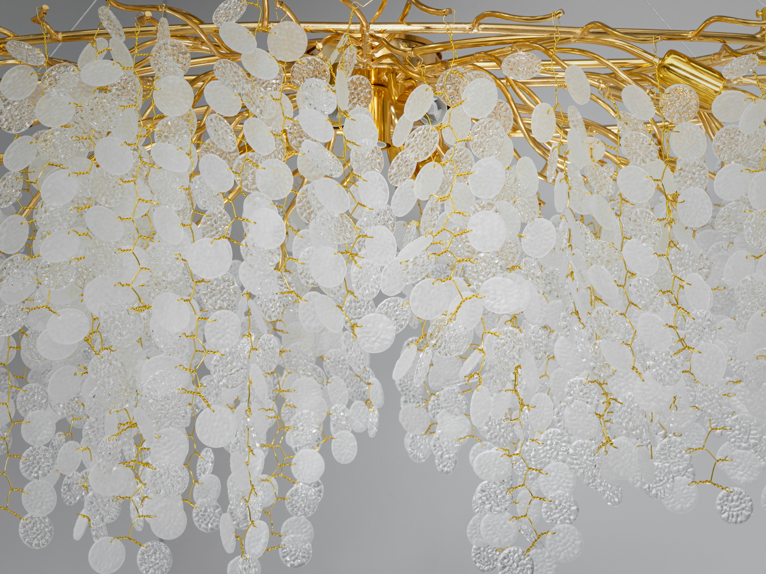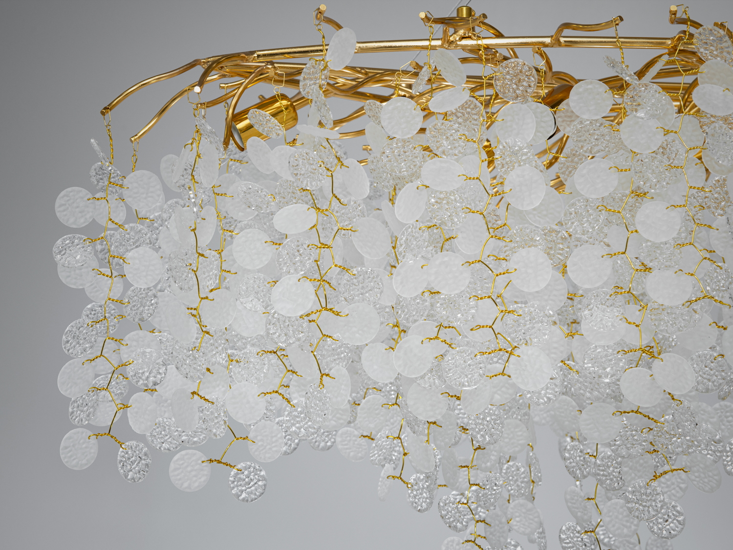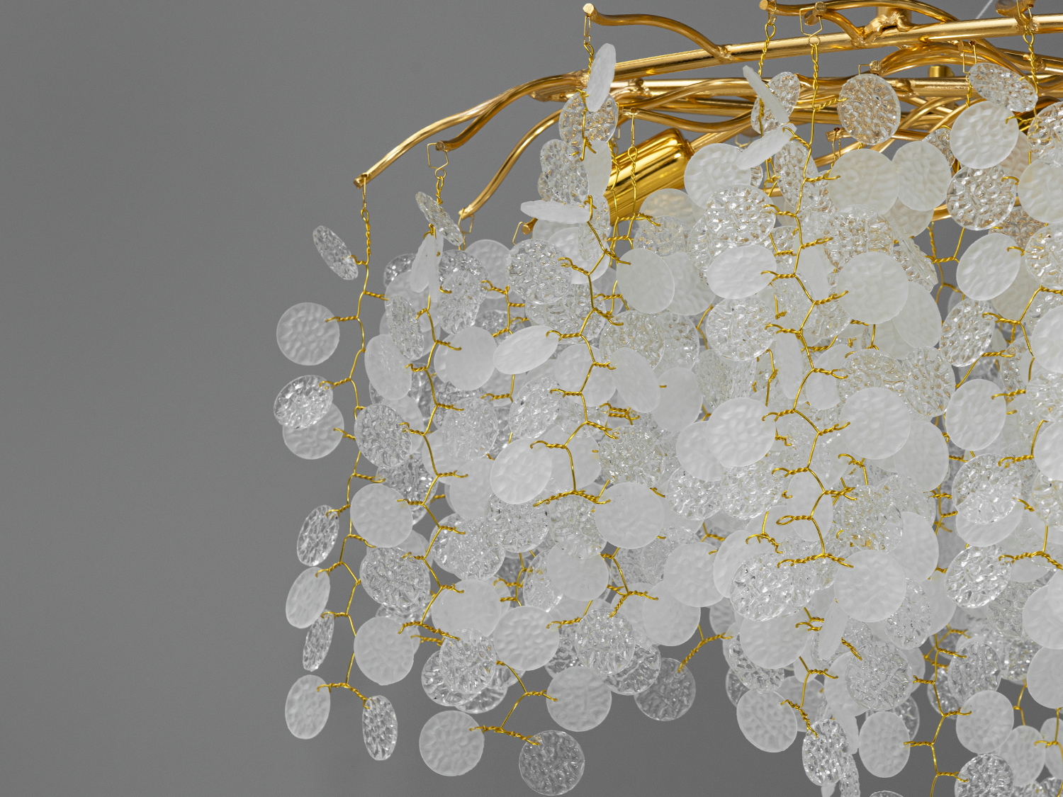 Люстра виготовлена з елегантних алюмінієвих елементів, що схожі на гілки дерева, кожна з яких закінчується вертикальною гірляндою з кришталей. Матові та прозорі кришталіки легко відбивають світло, викликаючи гру світла та тіней.