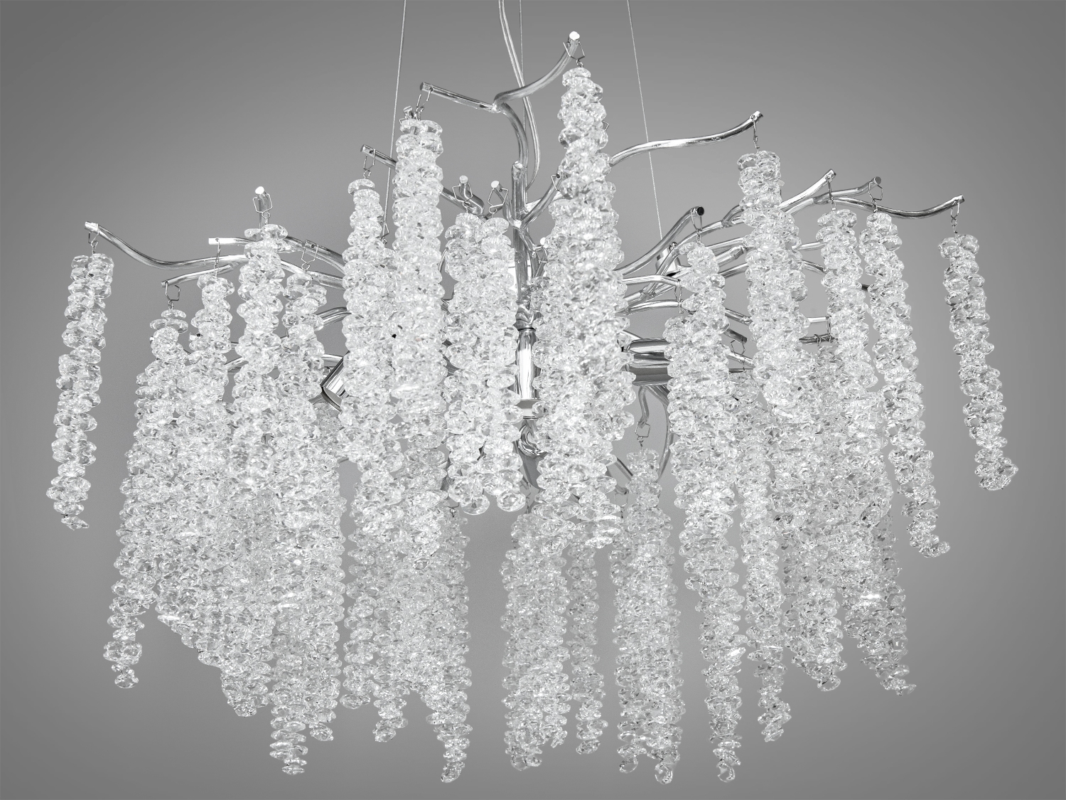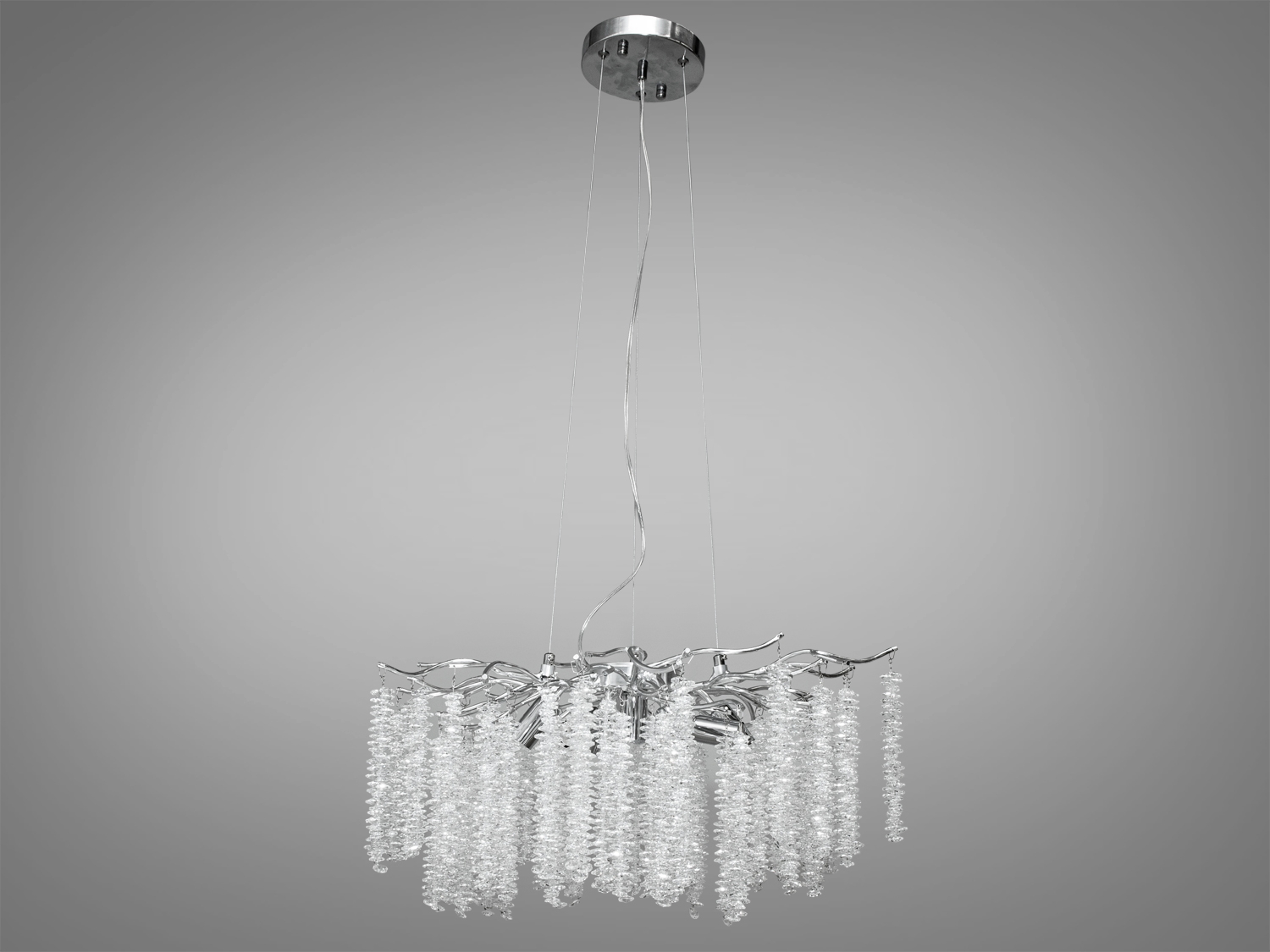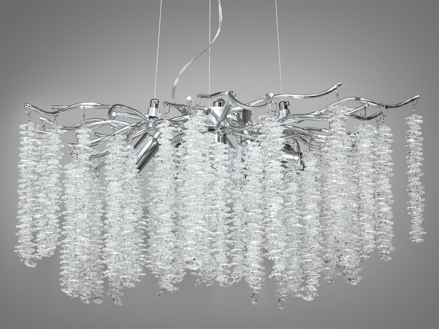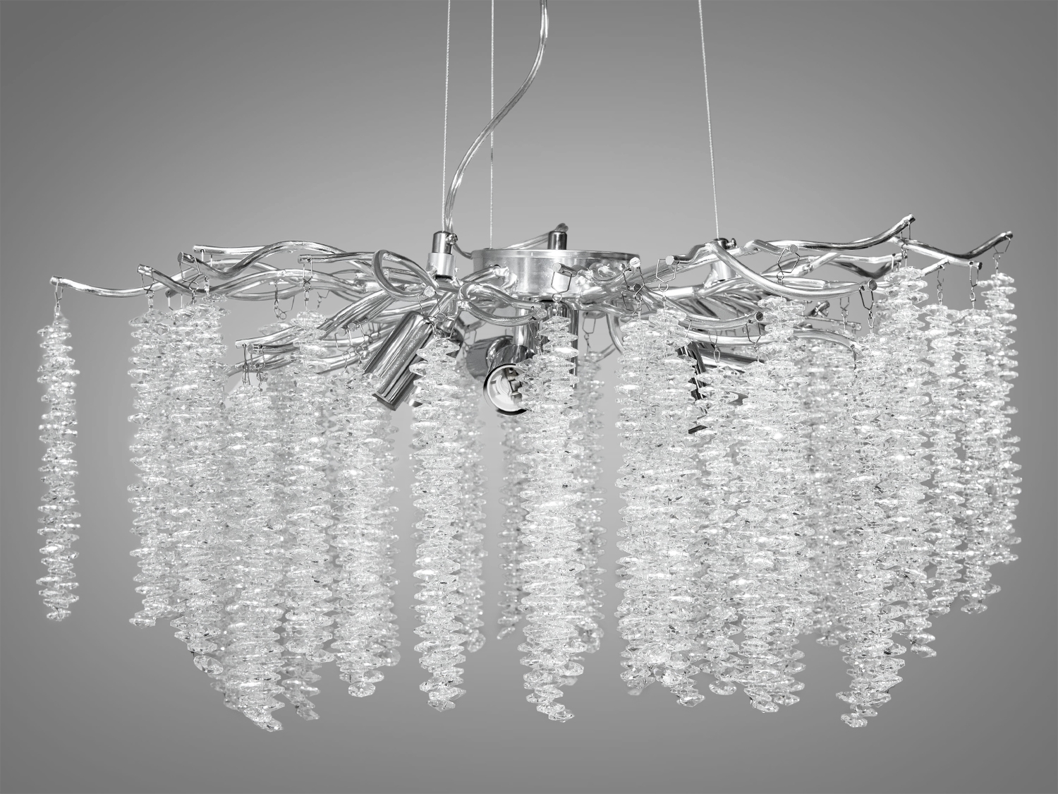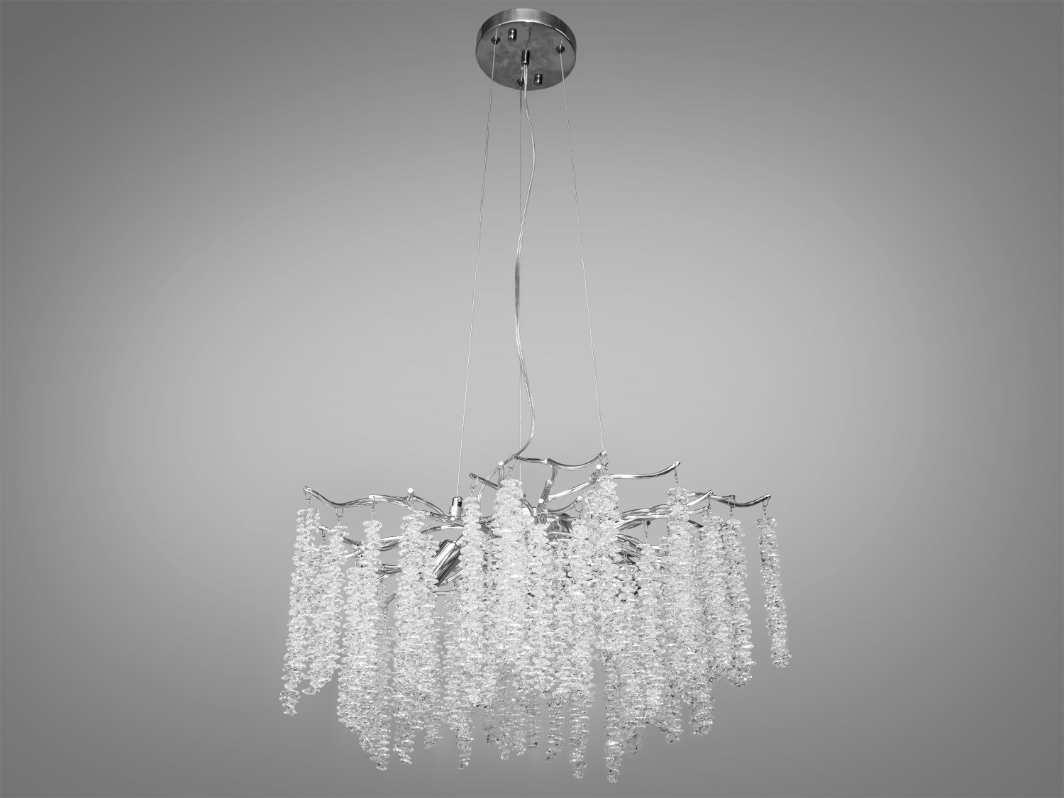 Особливість цієї люстри — здатність відтворювати дивовижну гру світла, яка змінюється з кожним кутом зору. Це створює ефект природного водоспаду, м'яко освітлюючи простір у вашій вітальні або спальні.