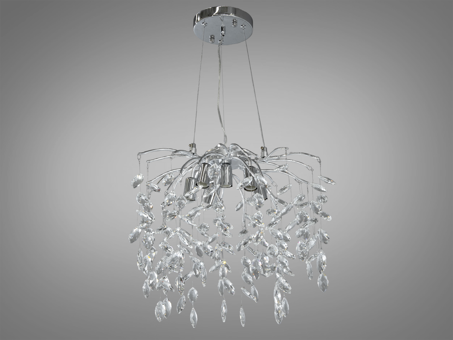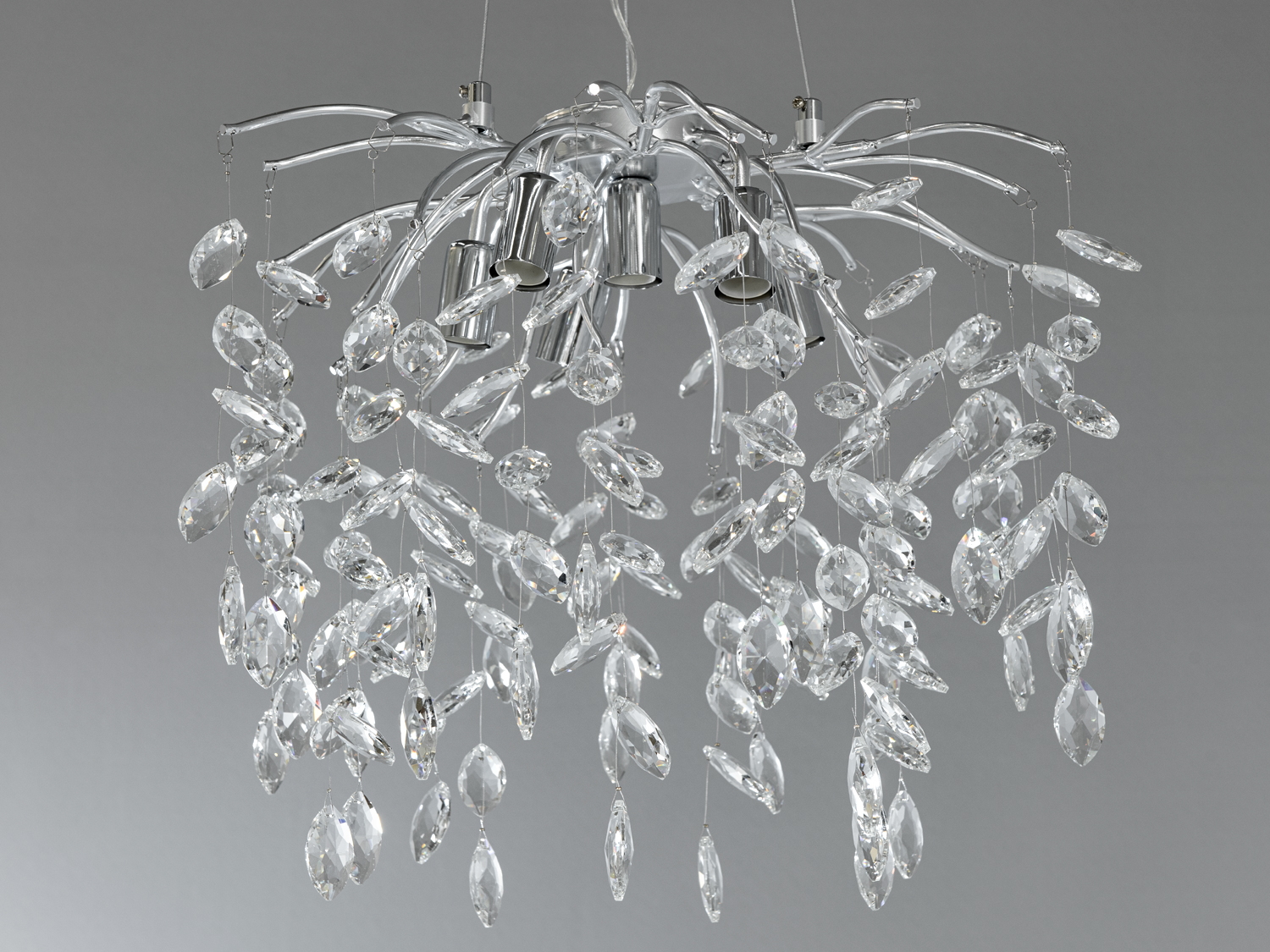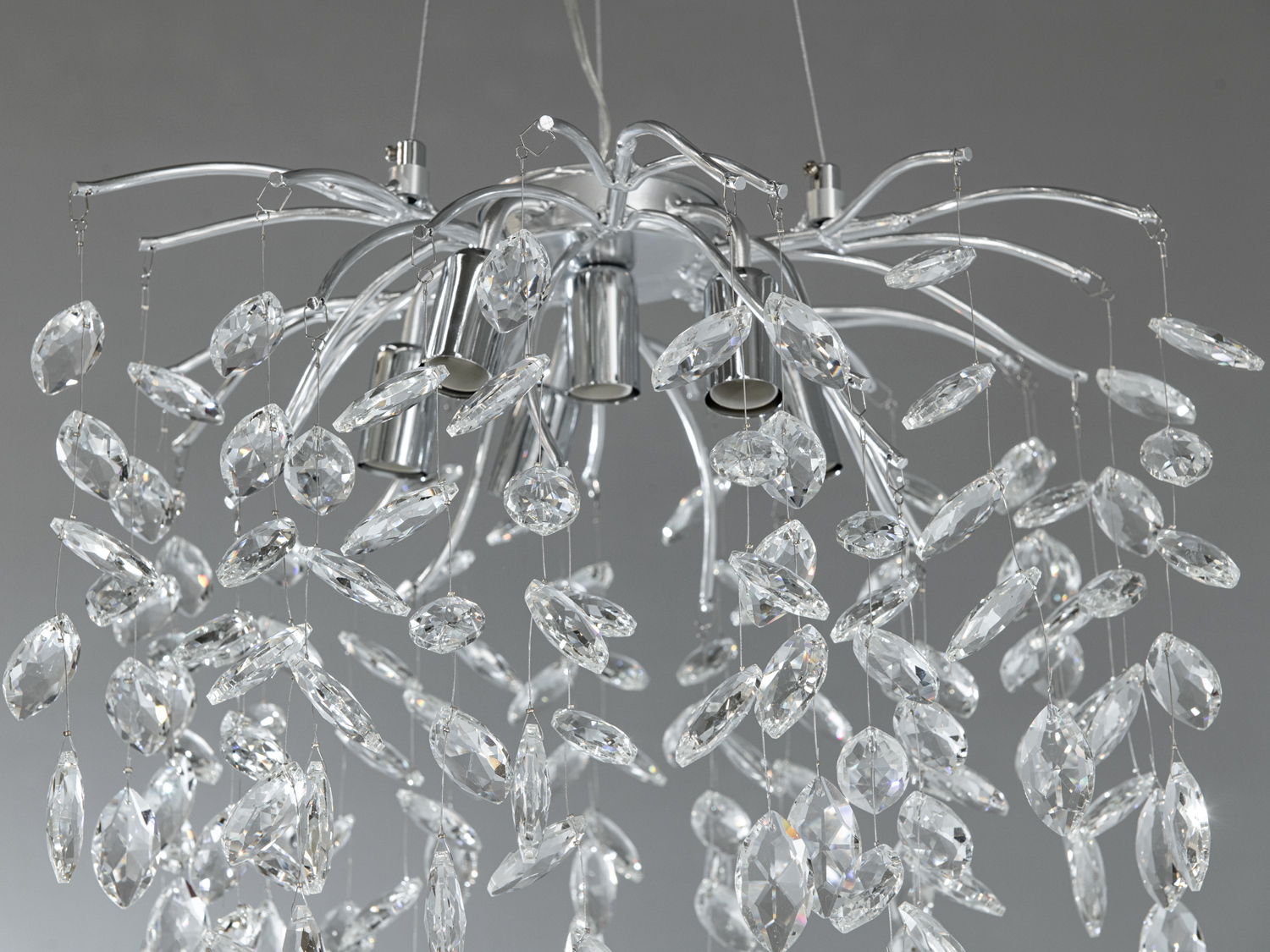 Ключовий елемент дизайну — кристальний декор, який надає люстрі особливого блиску та гри світла. Хромований металевий каркас додає виробу сучасного звучання, гармонійно поєднуючись з класичними елементами.
