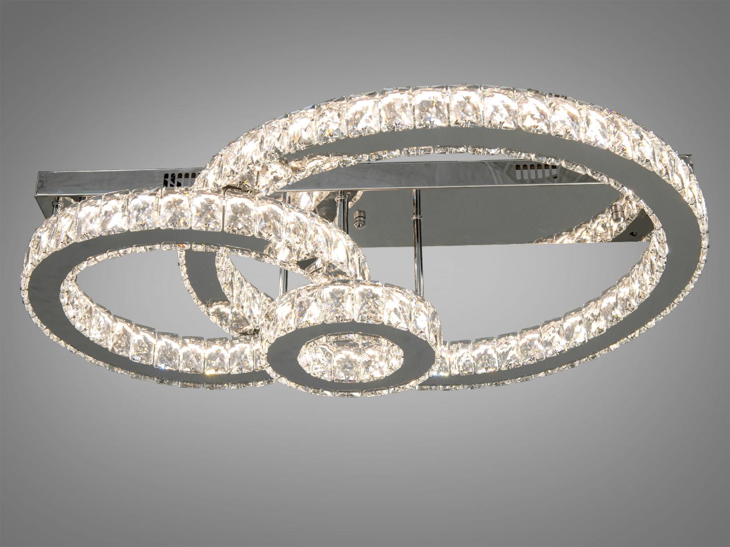 Люстра виконана в хромованому кольорі та оснащена двома круглими кільцями різного діаметру. Кришталеві вставки надають виробу розкішного блиску, створюючи ефект дорогоцінних каменів.
