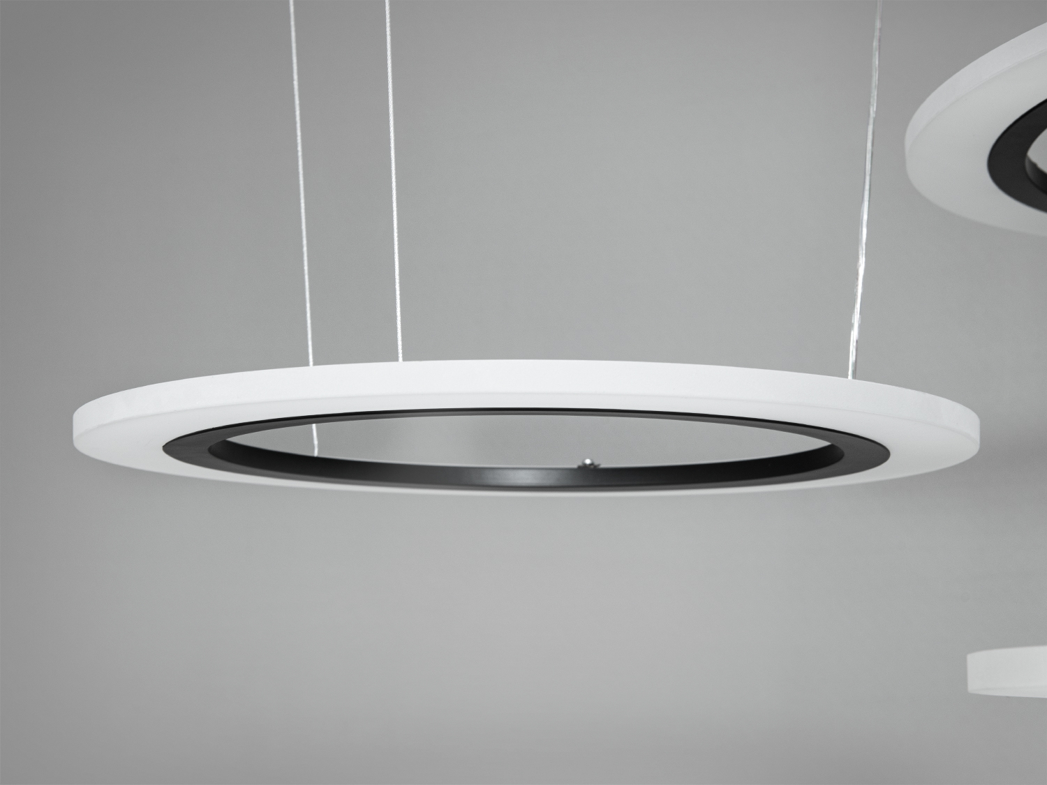 Кожне з трьох кілець люстри різного діаметру, забезпечуючи рівномірне розподілення світла. Акрилові розсіювачі запобігають появі різких тіней, створюючи приємну атмосферу.