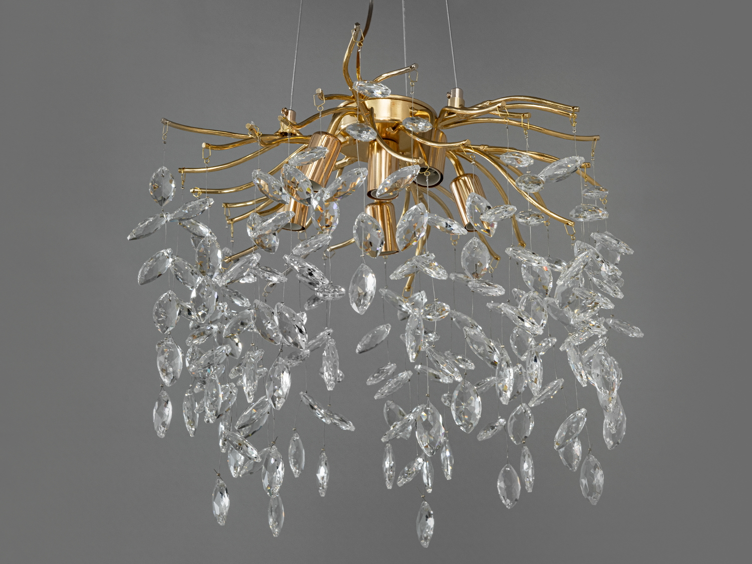 Сучасна підвісна кришталева люстра у золотому виконанні — це витончений елемент вашого інтер'єру, який додасть йому шарму та елегантності. Призначена для розміщення у вітальнях, залах та інших просторих приміщеннях, вона стане невід'ємною частиною вашого дому.