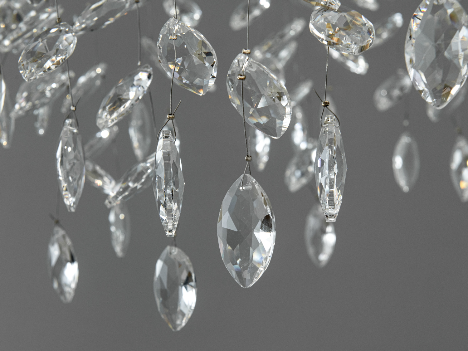 Люстра виконана з високоякісного металу з покриттям гальванікою, а кришталеві підвіски створюють блискучий ефект, заломлюючи світло та наповнюючи кімнату грою вогнів. Висота люстри регулюється від 55 до 110 см, що дозволяє використовувати її у приміщеннях з різною висотою стелі.