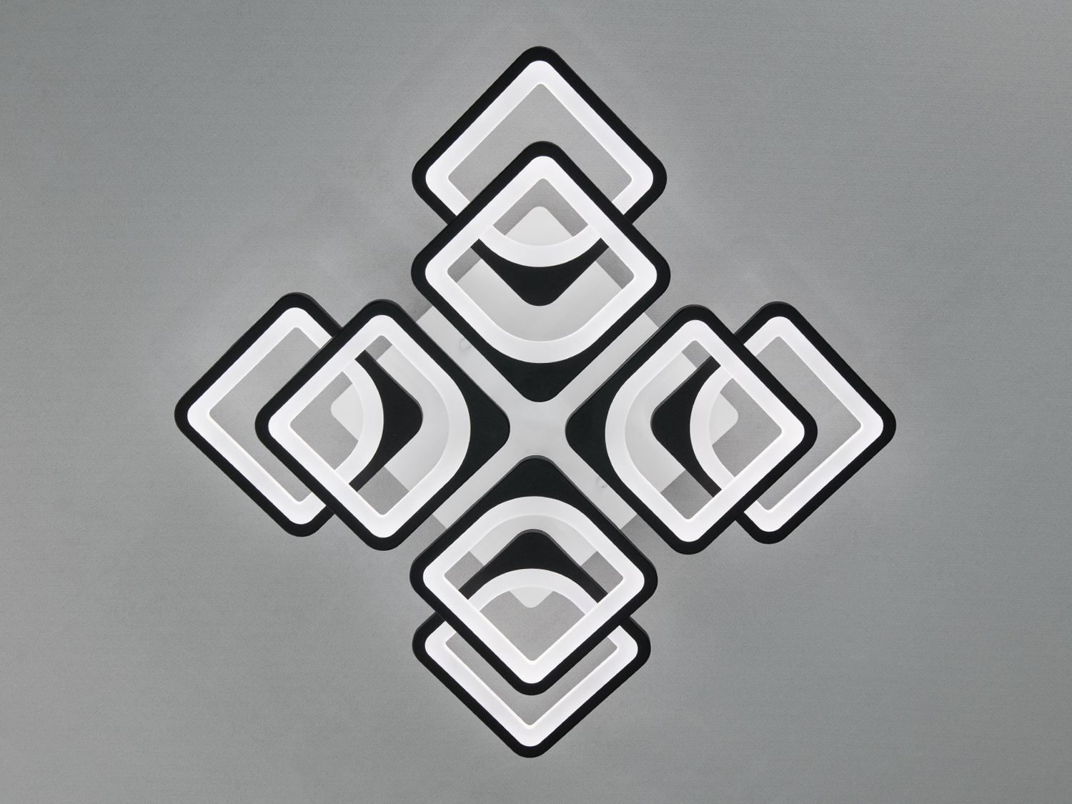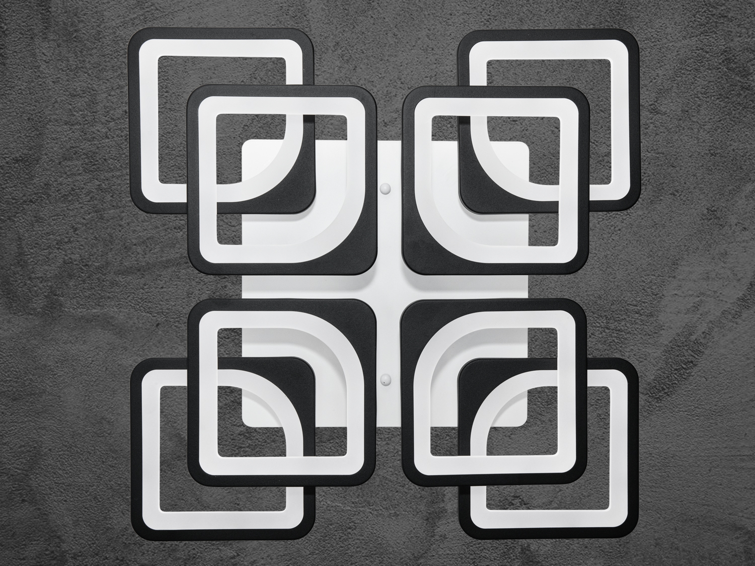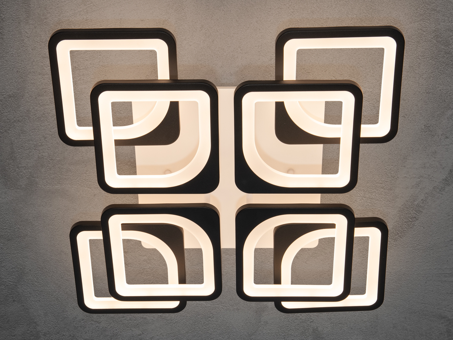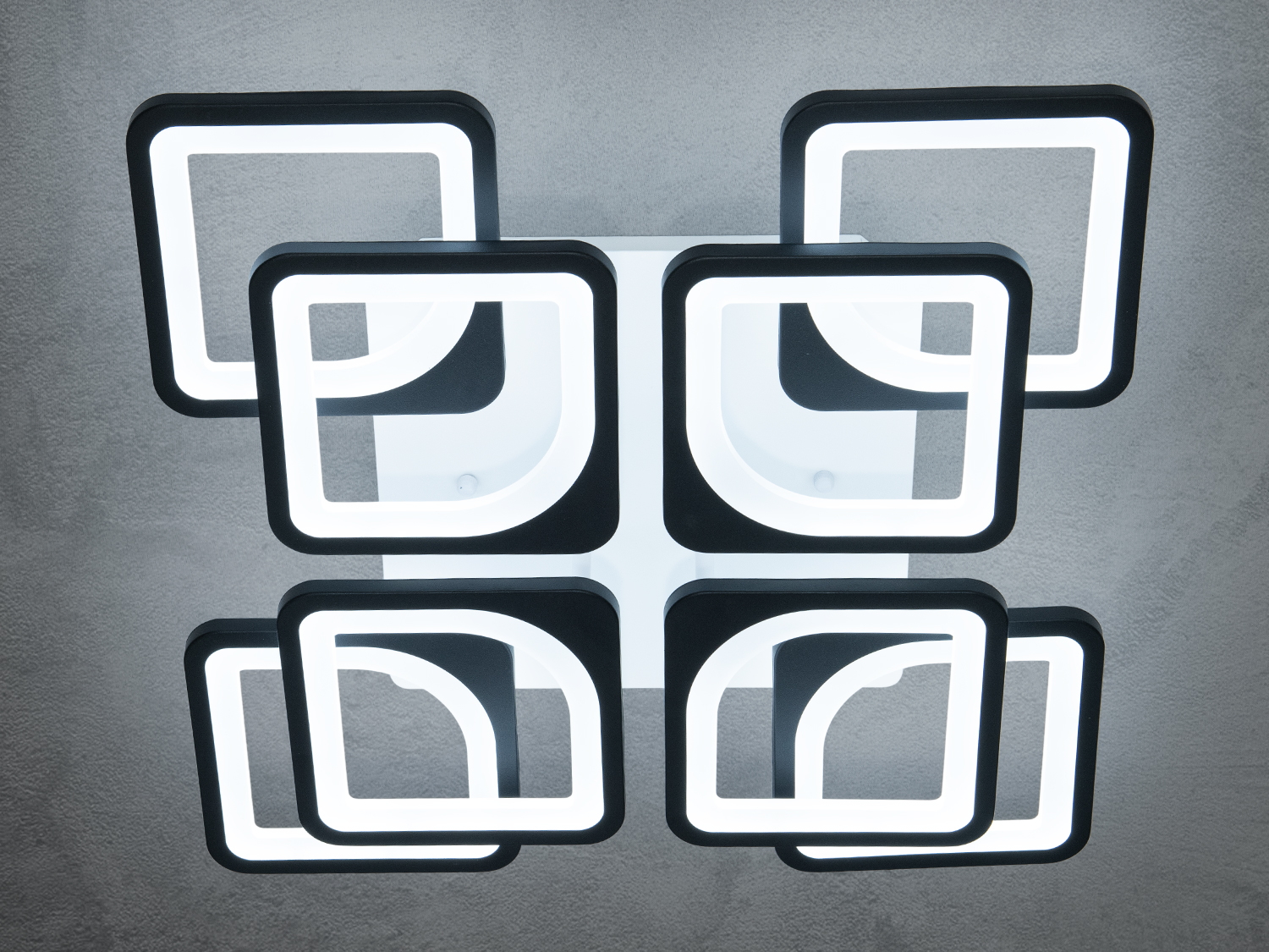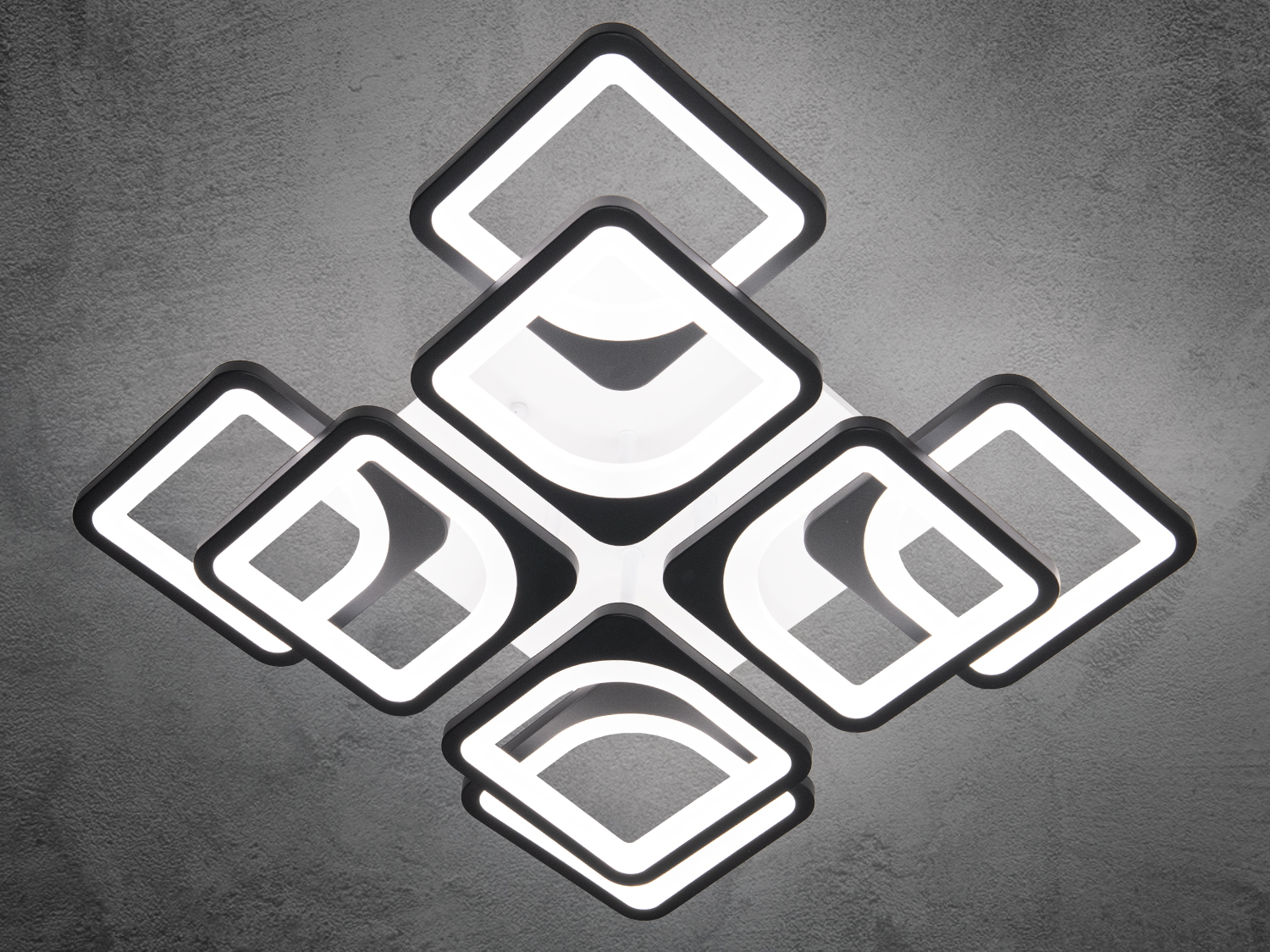 Стильна LED-люстра в спальню з пультом, з димером підходить на площу приміщення приблизно 16 кв. м. Застосовується для залу, вітальні, кухні, спальні, їдальні, дитячої, позаяк немає елементів, що б'ються. Кожен квадрат створює гармонійну композицію, додаючи сучасний і стильний акцент в інтер'єр. Люстра ідеально підходить для просторих приміщень, підкреслюючи їх геометрію та додаючи м'яке, рівномірне світло. Чорні контури та білі матові вставки (розсіювач) надають люстрі витонченого й елегантного вигляду, роблячи її прекрасним вибором для будь-якого інтер'єру — класичного, сучасного та навіть у стилі «хай-тек».