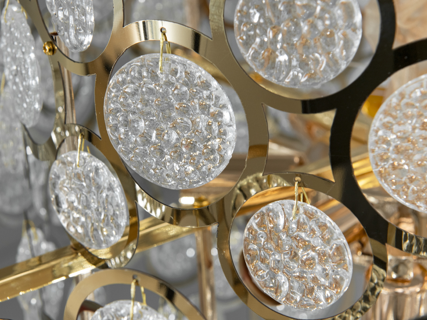 Кріплення на монтажну планку забезпечує надійність і легкість встановлення. Витончені скляні деталі з текстурованими поверхнями відбивають світло, створюючи заворожливі відблиски та наповнюючи приміщення неповторною грою світла. Золотиста фурнітура підкреслює багатство та статус люстри, ідеально вписуючись в інтер'єри, виготовлені в стилі артдеко, класики або сучасної розкоші.