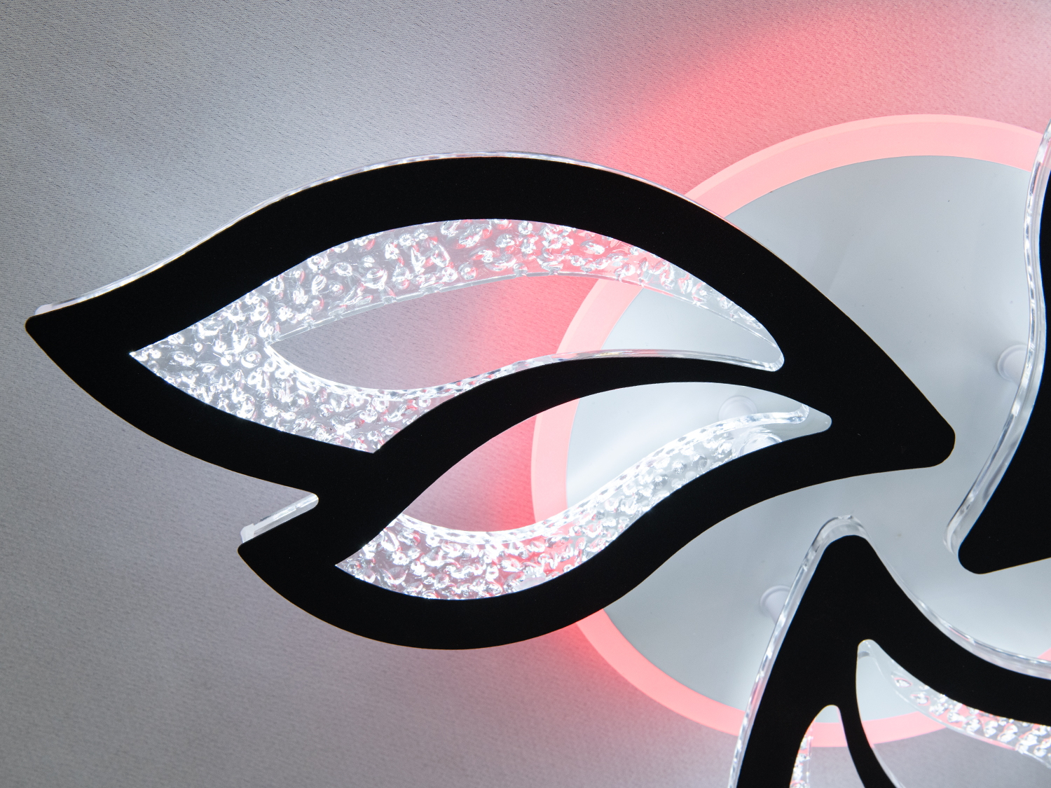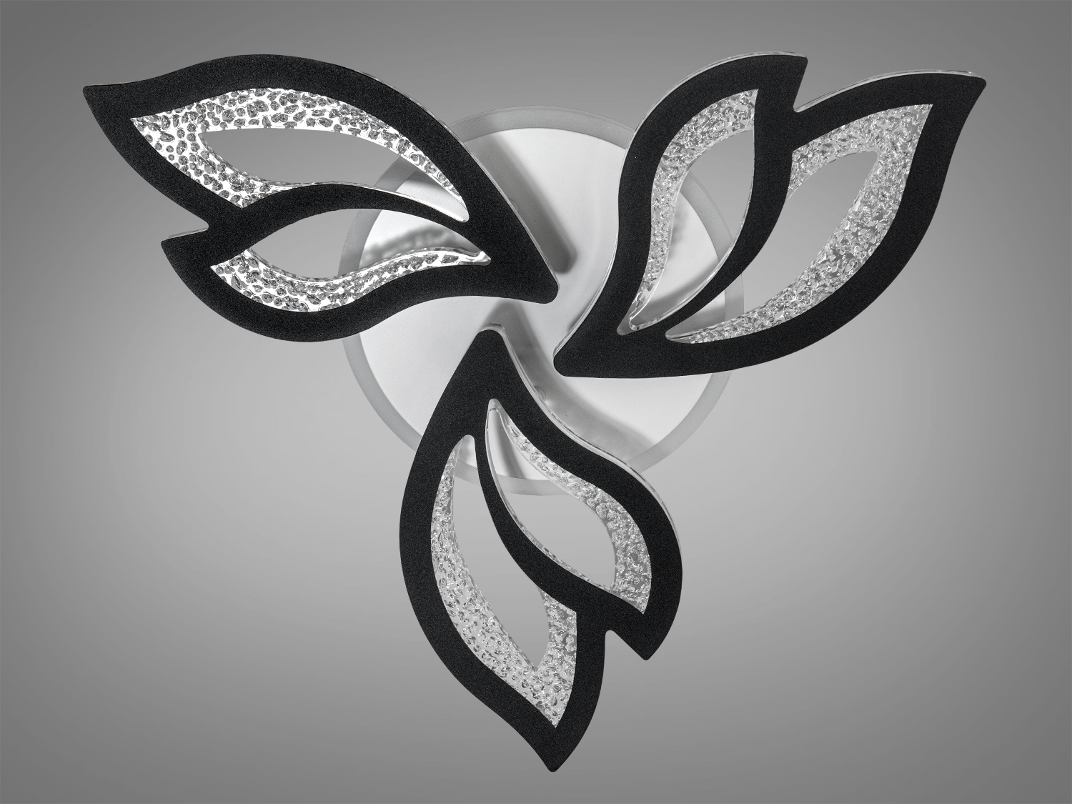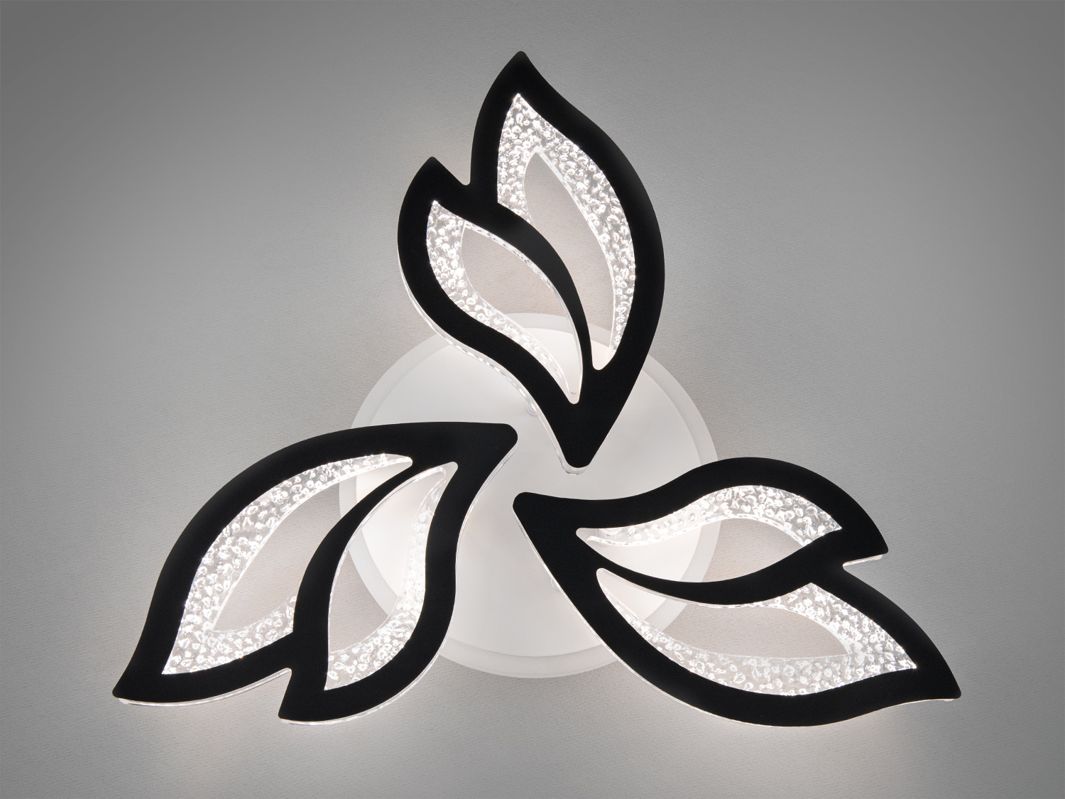 Люстра виготовлена у формі квіткової розетки, де кожен елемент схожий на витончений лист із плавними обрисами. Чорні лінії створюють контрастний контур, що підкреслює форму листя, а внутрішня частина прикрашена світлодіодною підсвіткою, що надає люстрі ефект глибини та динаміки. Відкрита структура з повітряними проміжками робить дизайн легким, що особливо підійде для приміщень із сучасним мінімалістичним інтер'єром.