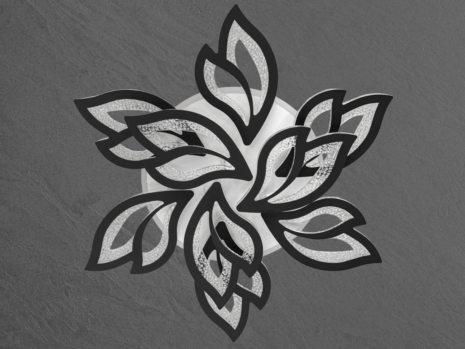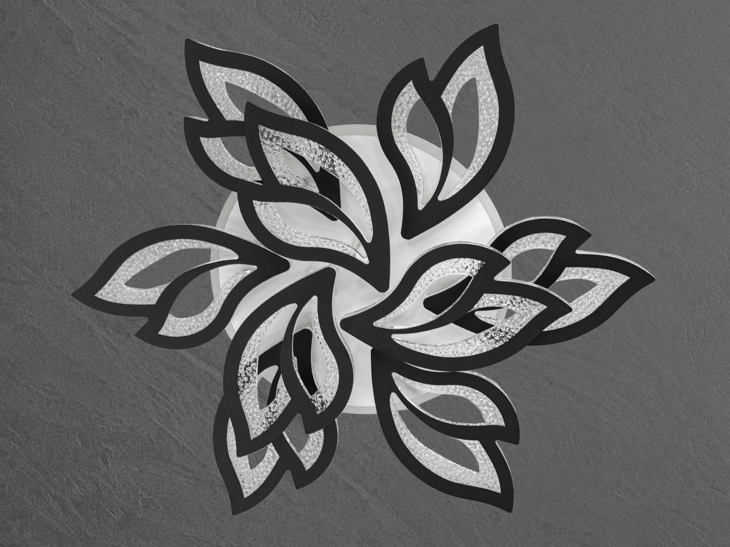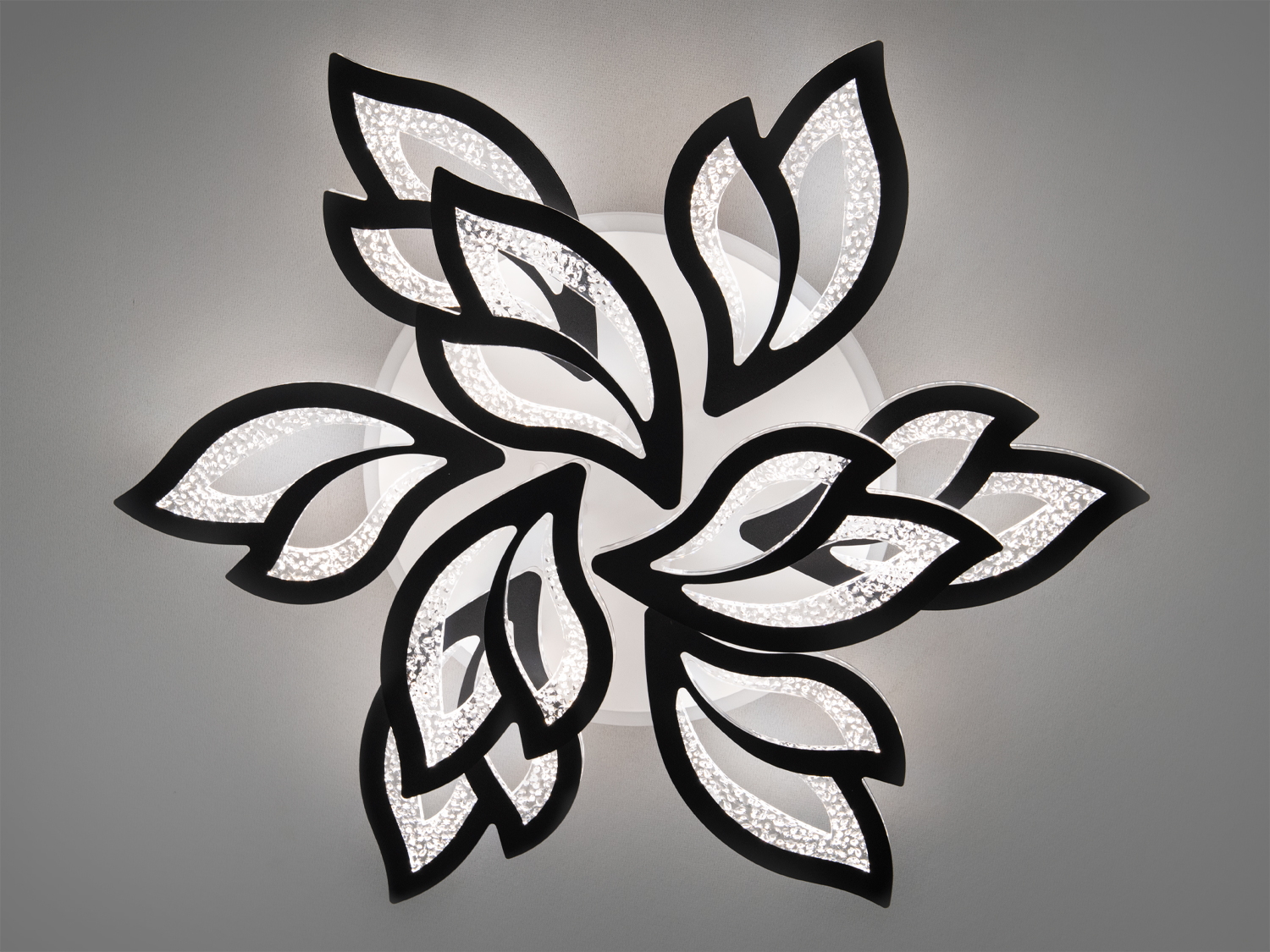 Люстра виготовлена у формі квіткової розетки, де кожен елемент схожий на витончений лист із плавними обрисами. Чорні лінії створюють контрастний контур, що підкреслює форму листя, а внутрішня частина прикрашена світлодіодною підсвіткою, що надає люстрі ефект глибини та динаміки. Відкрита структура з повітряними проміжками робить дизайн легким, що особливо підійде для приміщень із сучасним мінімалістичним інтер'єром.