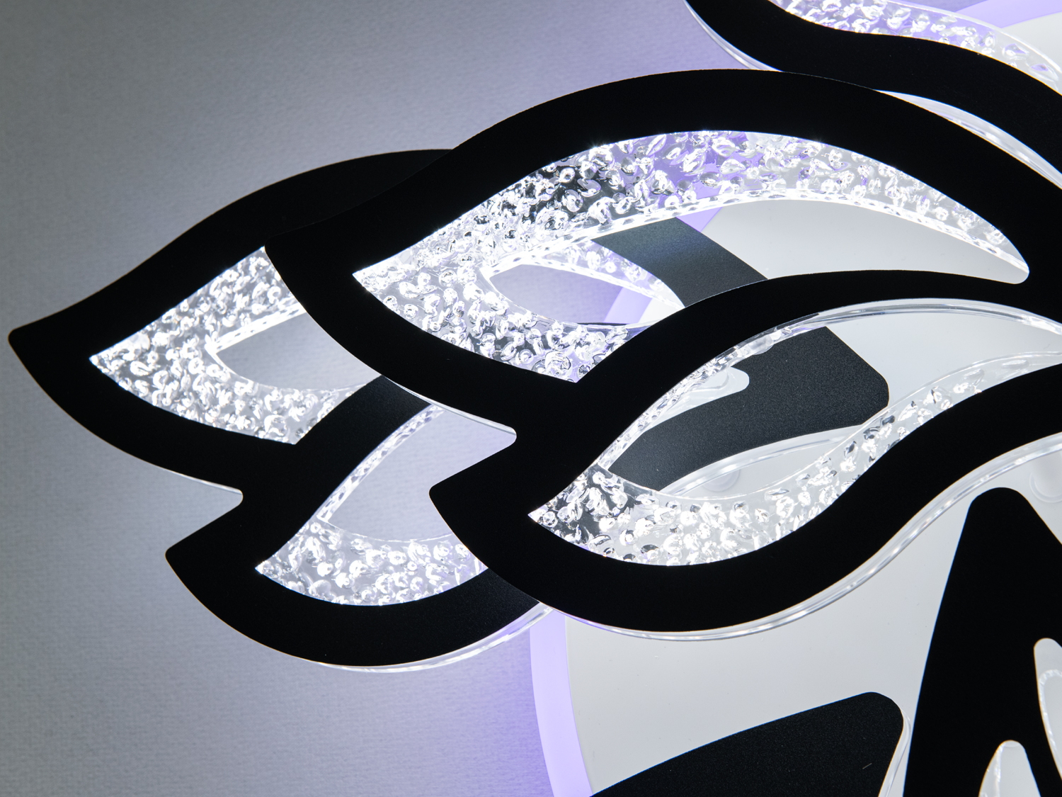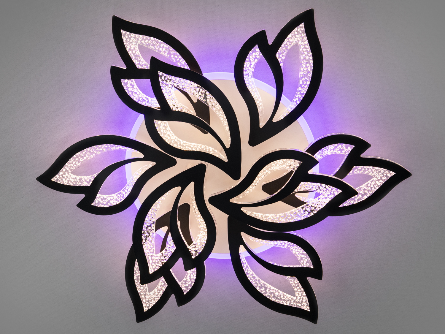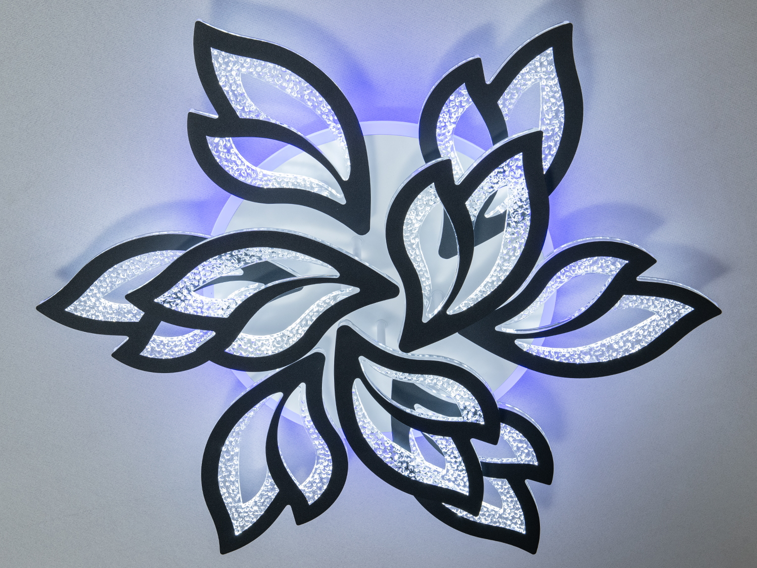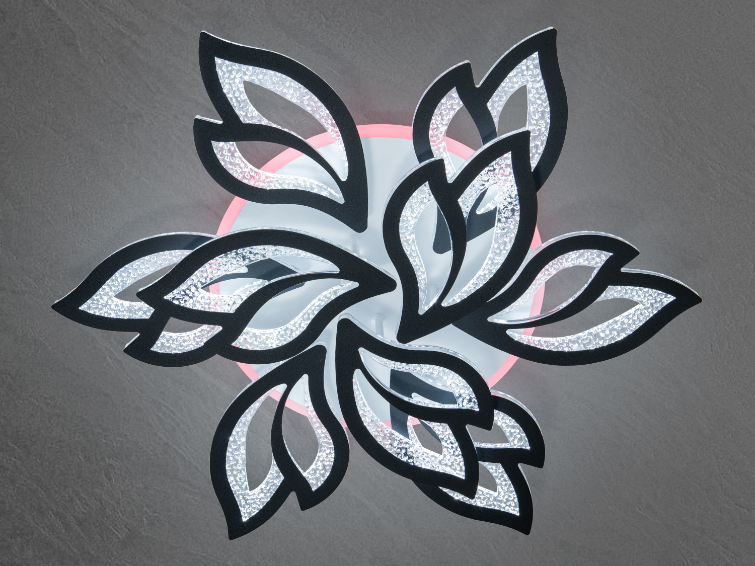 Люстра виготовлена у формі квіткової розетки, де кожен елемент схожий на витончений лист із плавними обрисами. Чорні лінії створюють контрастний контур, що підкреслює форму листя, а внутрішня частина прикрашена світлодіодною підсвіткою, що надає люстрі ефект глибини та динаміки. Відкрита структура з повітряними проміжками робить дизайн легким, що особливо підійде для приміщень із сучасним мінімалістичним інтер'єром.
