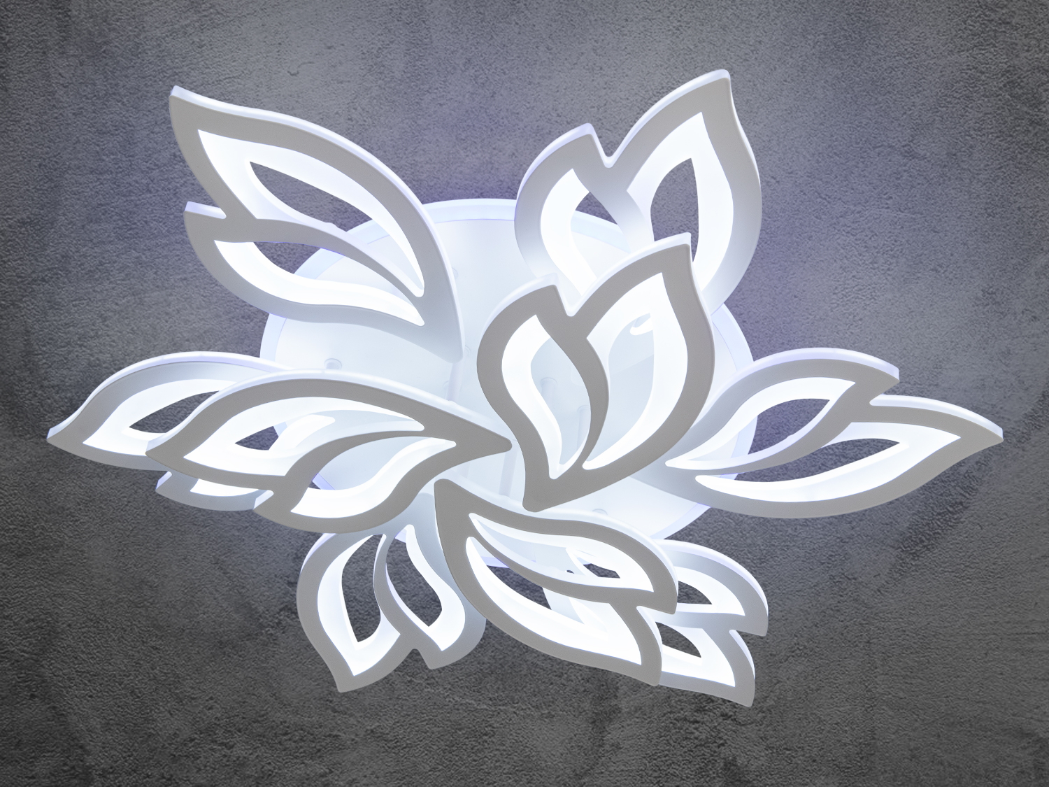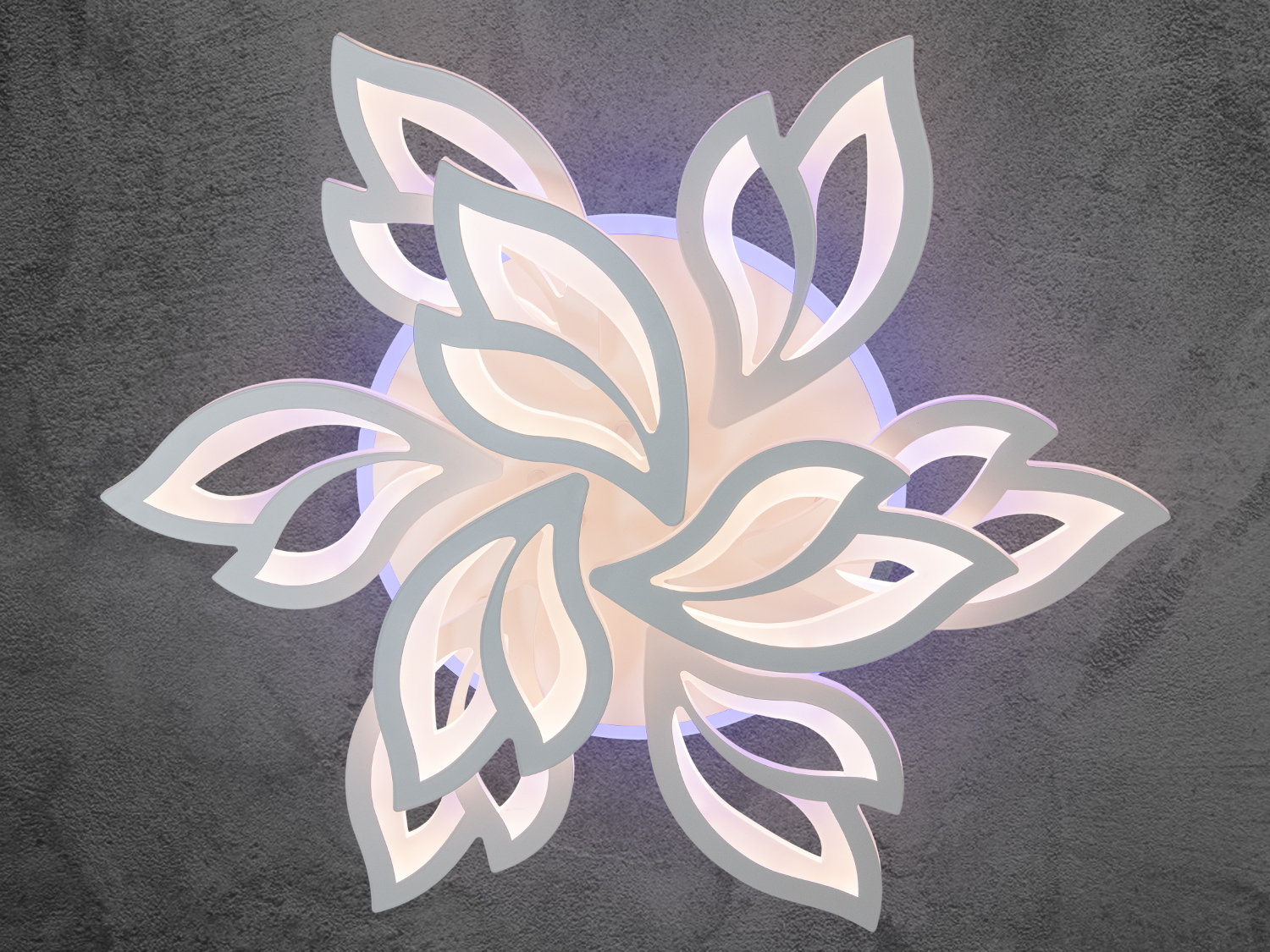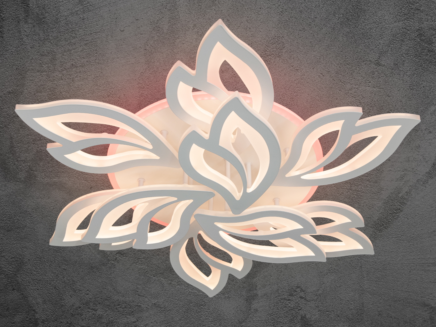 Стильна LED-люстра в вітальню з пультом, з підсвіткою, з димером потужністю 140 Вт білого кольору — це чудовий зразок сучасного освітлювального дизайну, який внесе у ваш інтер'єр нотки елегантності та вишуканості. Унікальна форма, натхненна природними мотивами, схожа на пелюстки квітів, які м'яко випромінюють світло, створюючи витончену атмосферу. Високоякісний акрил і метал, що поєднують легкість конструкції та довговічність.