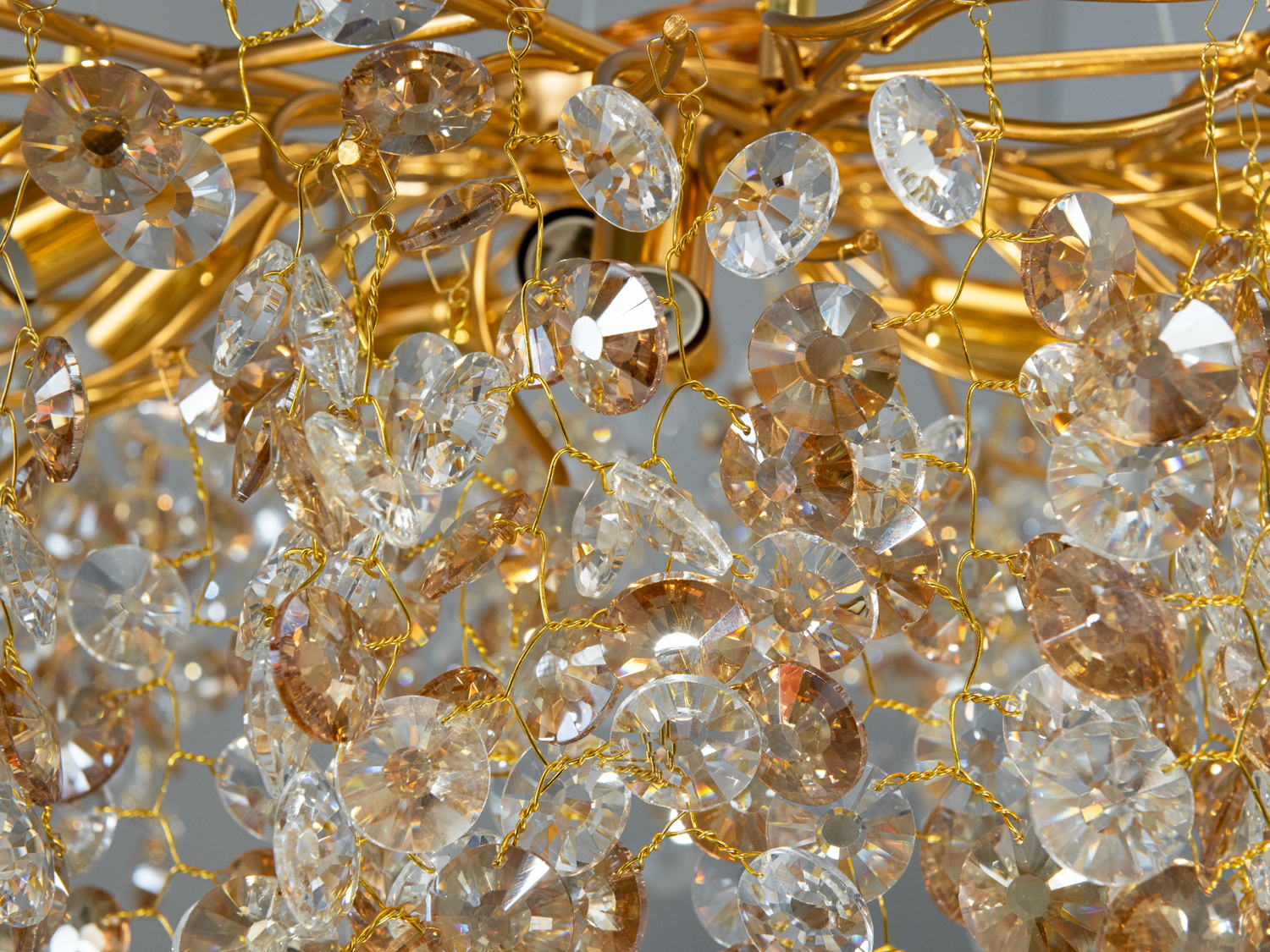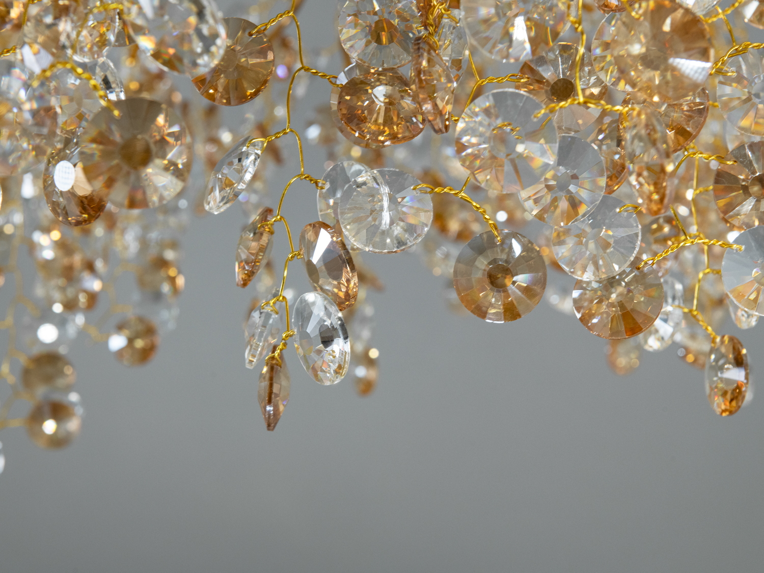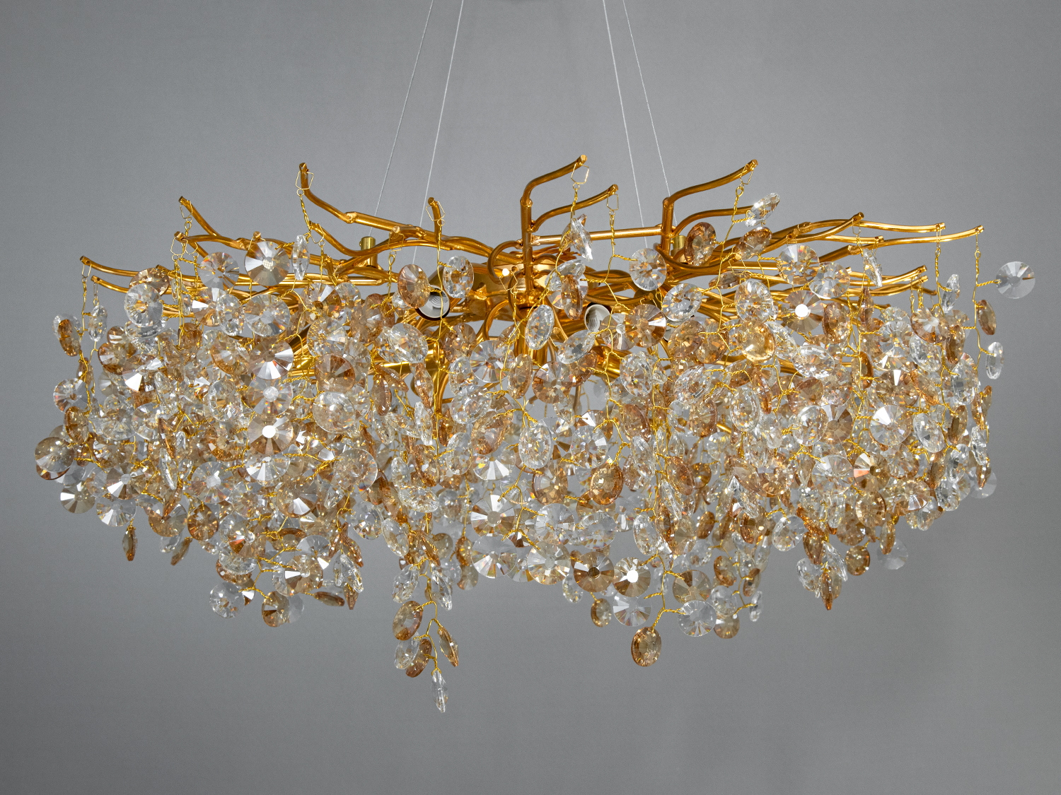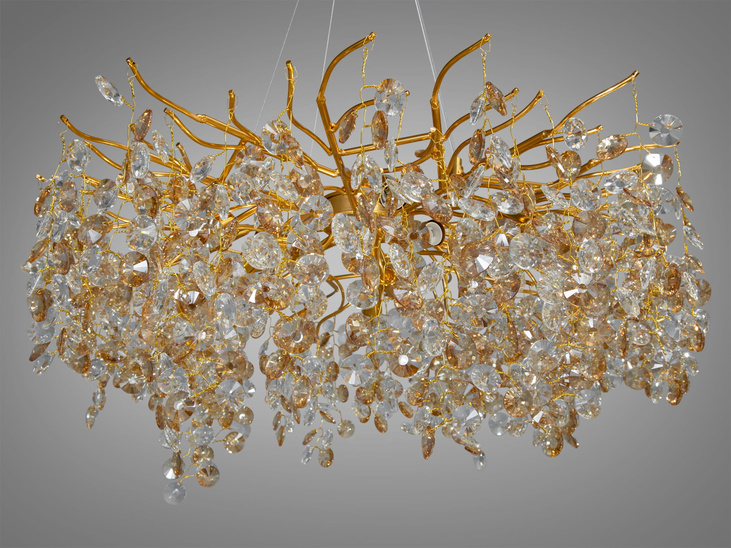 Дизайнерська кришталева люстра у вітальню — втілення витонченої розкоші та неперевершеного стилю. Її металевий корпус, виготовлений у благородному золотистому відтінку, схожий на тонкі гілки дерева, обрамлені вишуканим кришталем, який, немов краплі ранкової роси, переливається під променями світла.